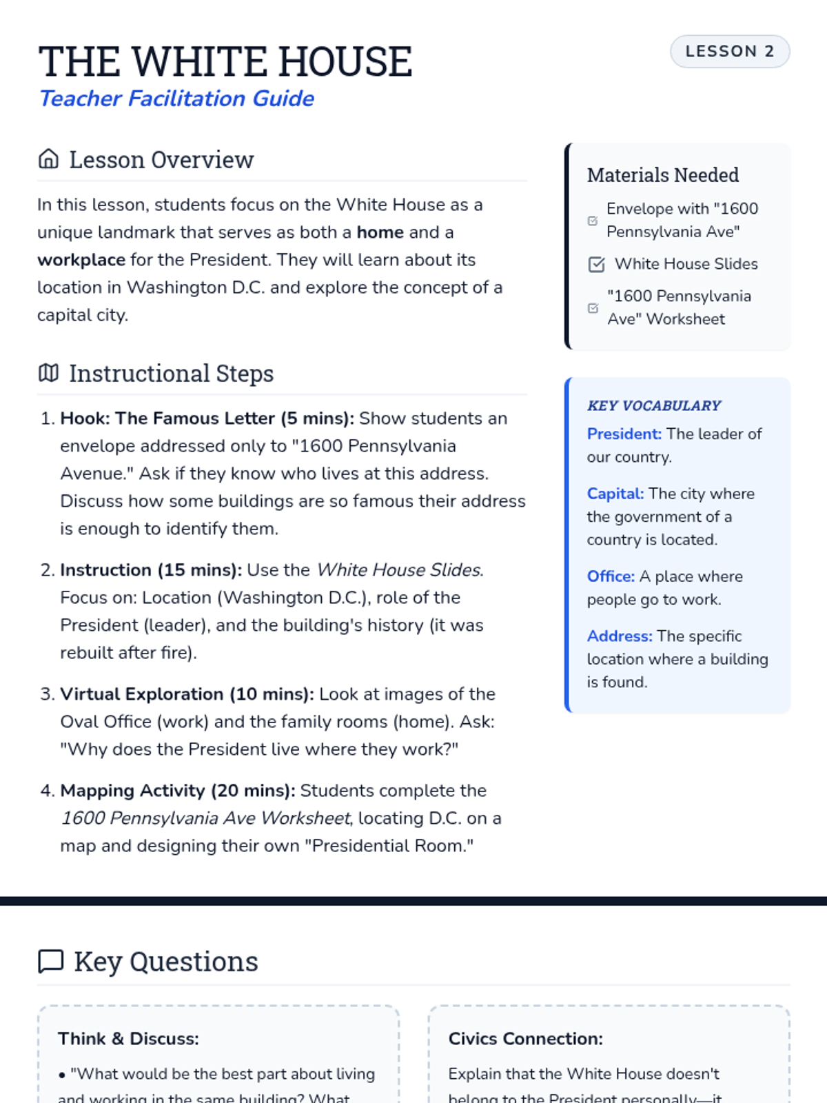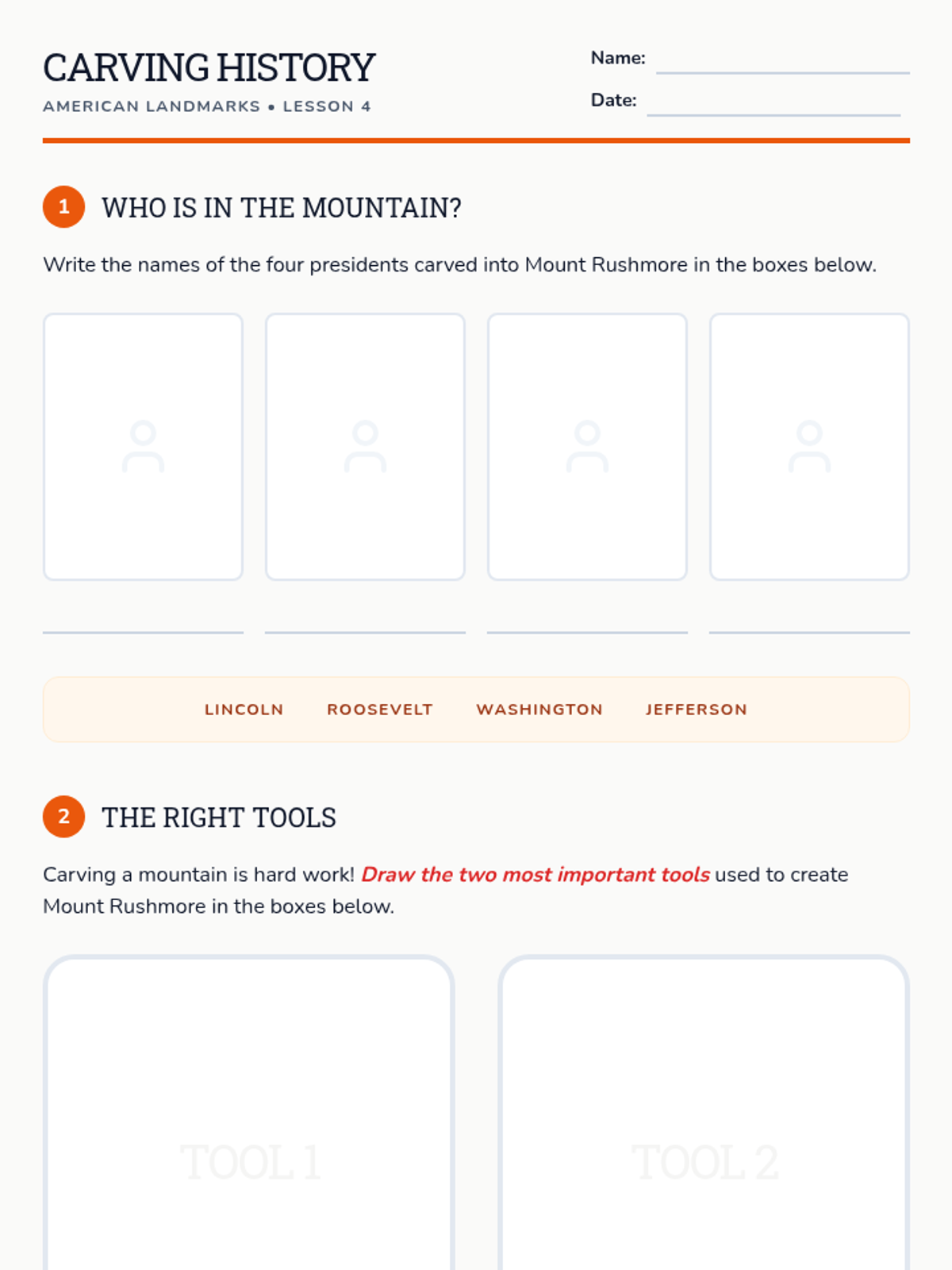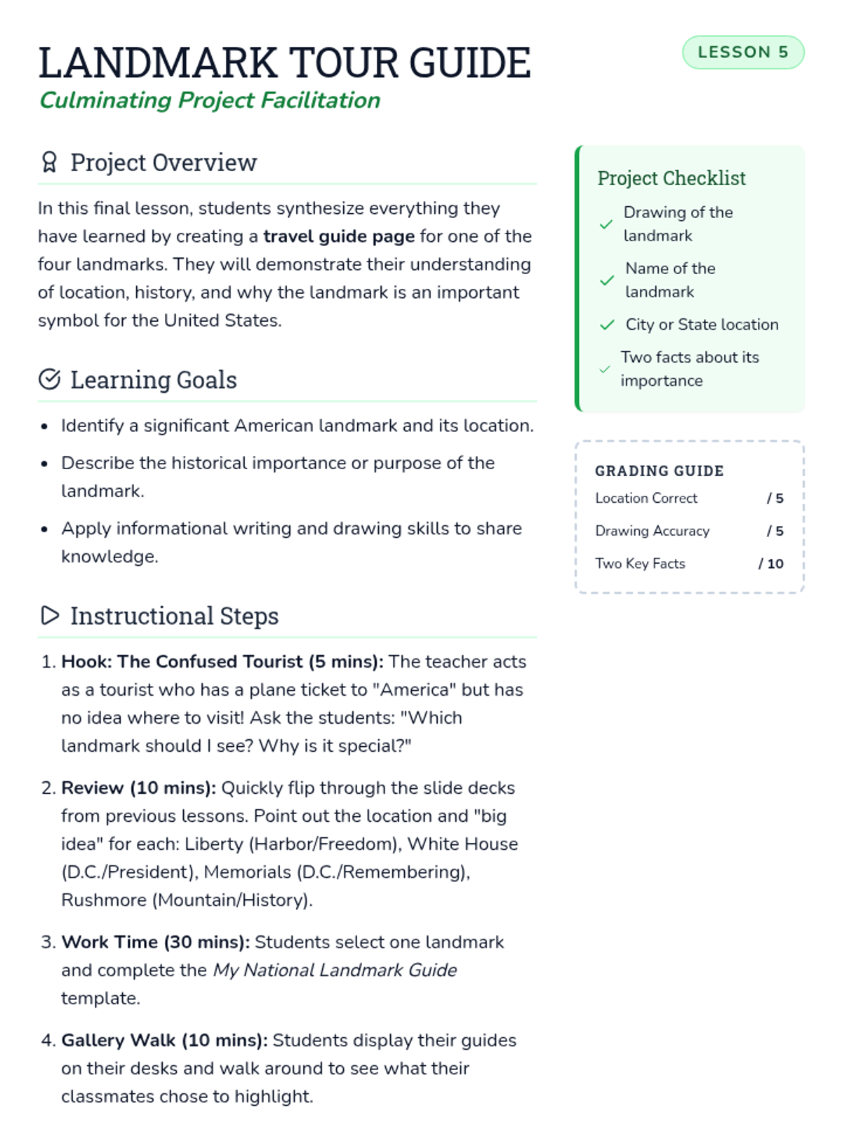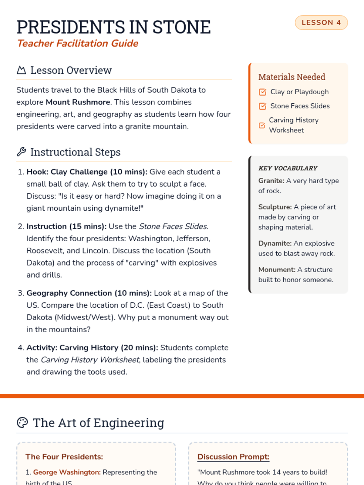 A 5-lesson sequence for 2nd graders exploring significant American landmarks including the Statue of Liberty, the White House, the Washington and Lincoln Memorials, and Mount Rushmore. Students learn about the geography, history, and purpose of these monuments in honoring leaders and values.