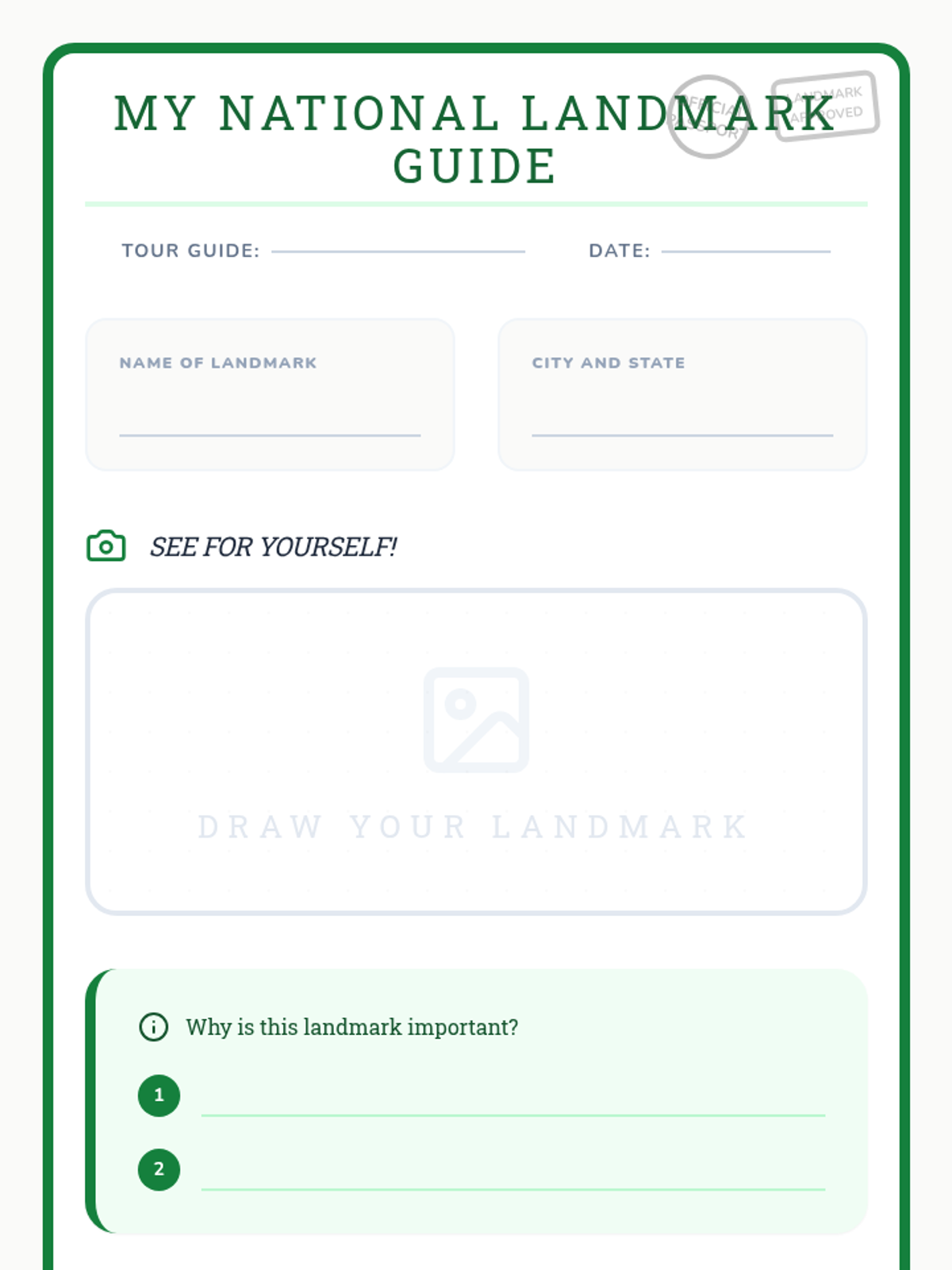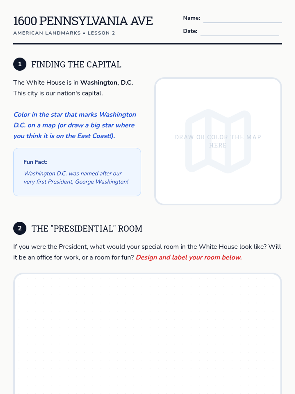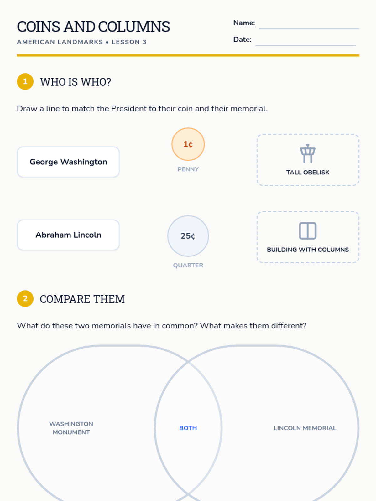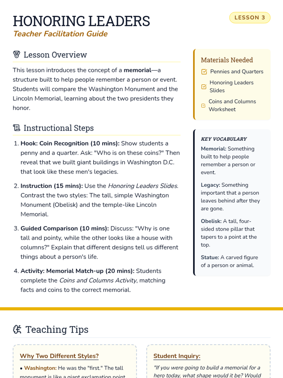 A 5-lesson sequence for 2nd graders exploring significant American landmarks including the Statue of Liberty, the White House, the Washington and Lincoln Memorials, and Mount Rushmore. Students learn about the geography, history, and purpose of these monuments in honoring leaders and values.