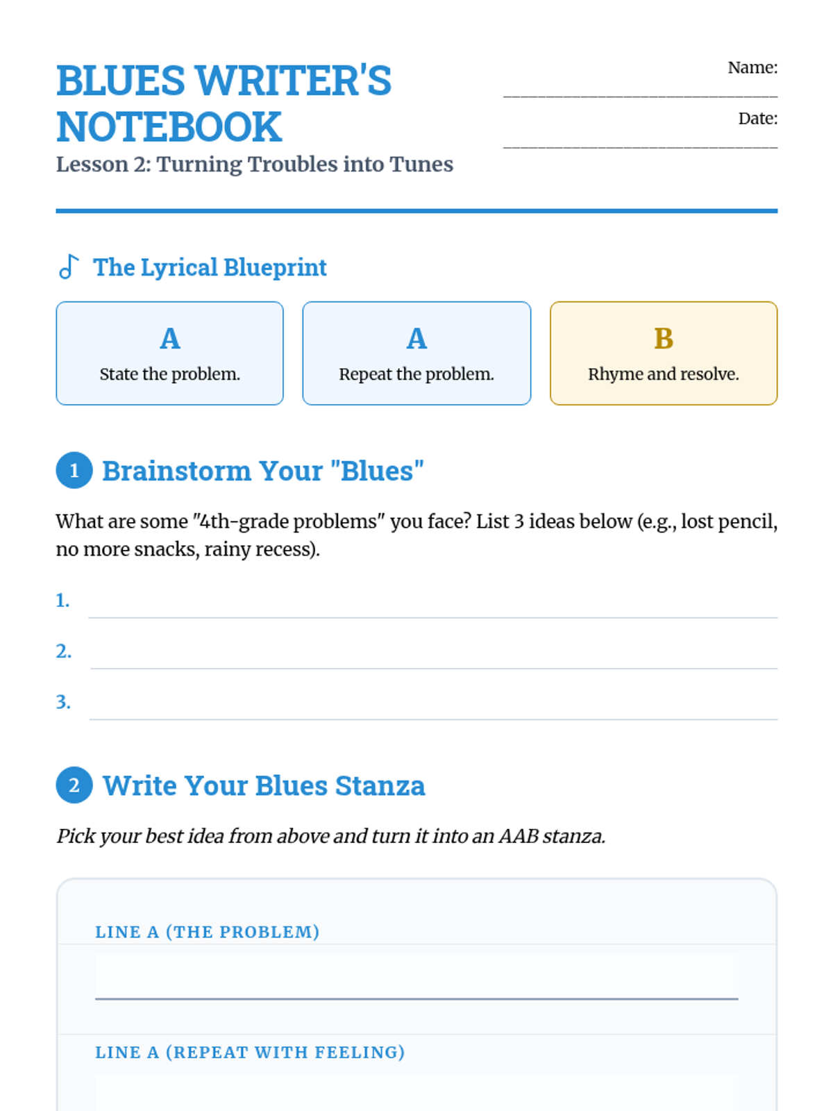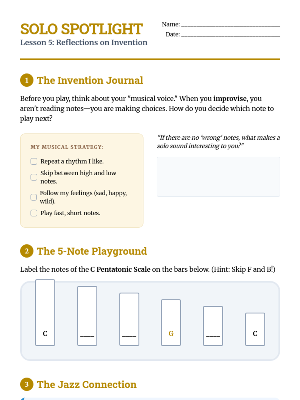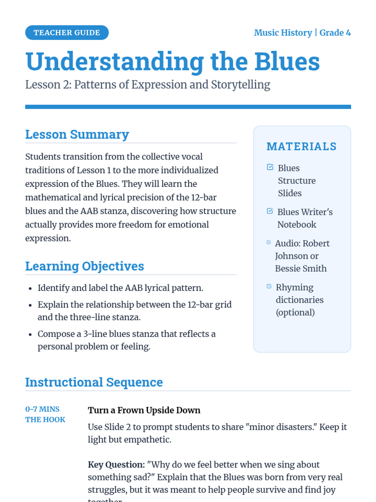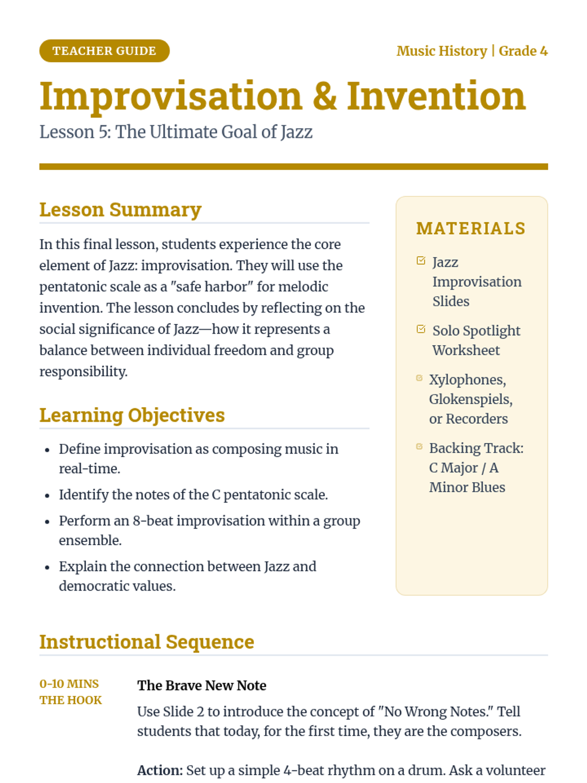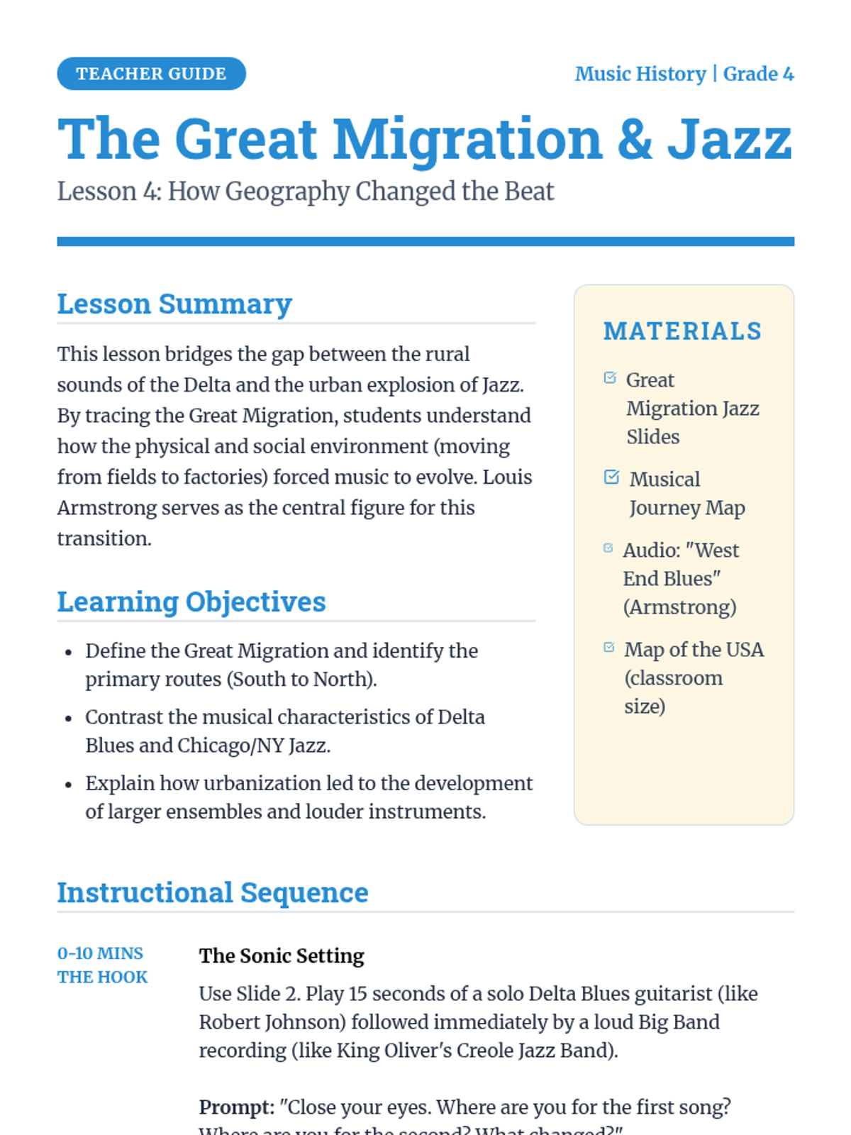 This 4th-grade music history sequence explores the evolution of American music from African roots to Jazz. Students investigate how historical context, community struggle, and cultural migration shaped genres like Spirituals, Blues, Ragtime, and Jazz through active listening, writing, and performance.