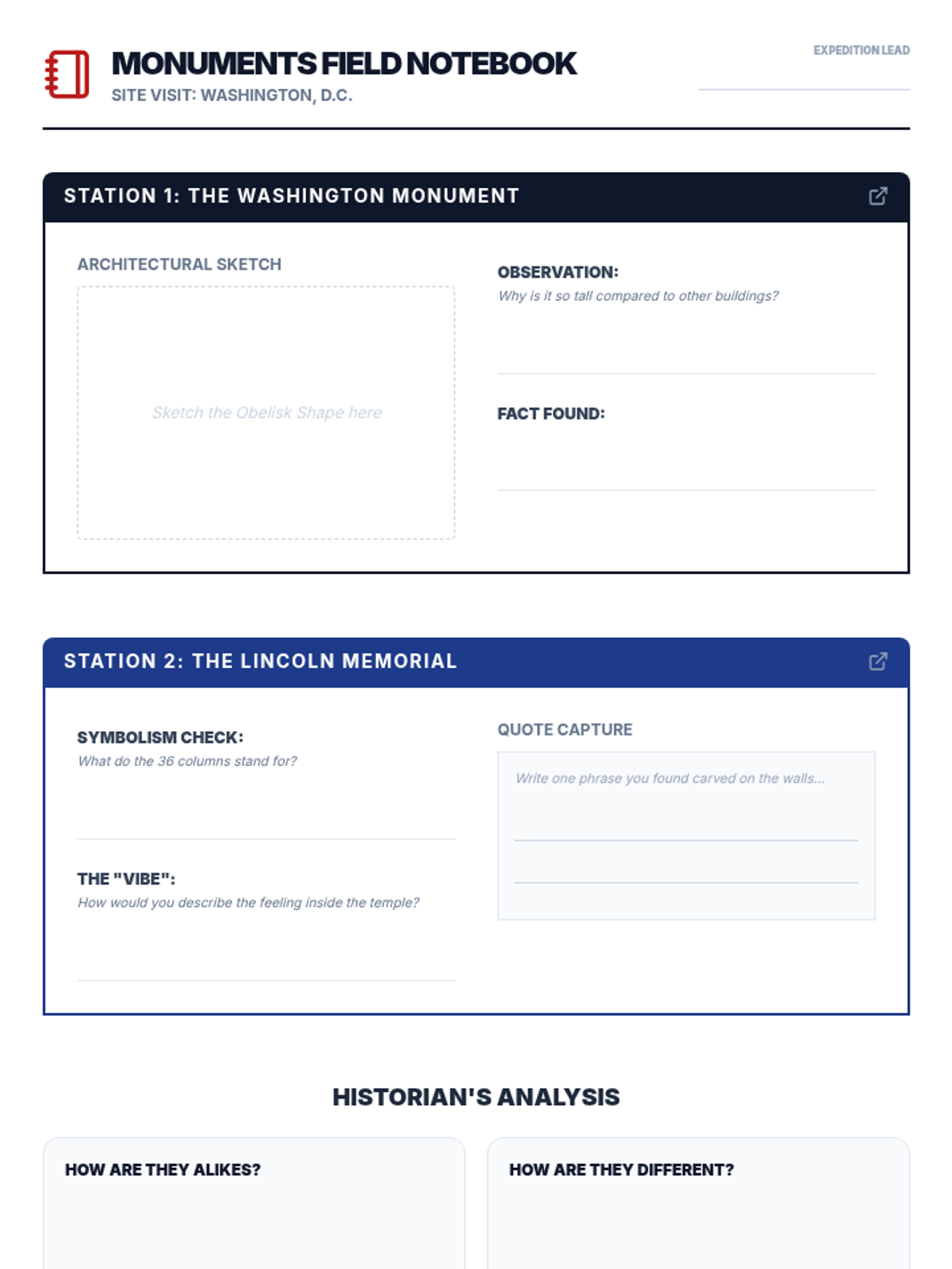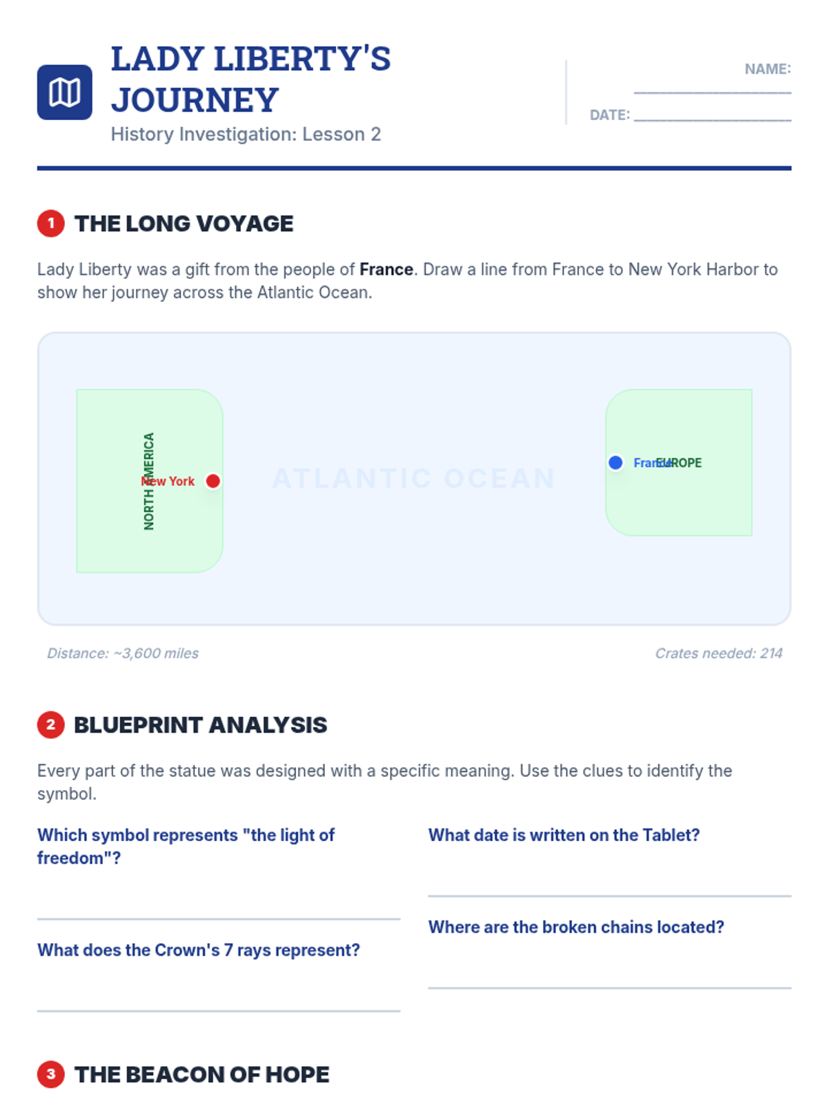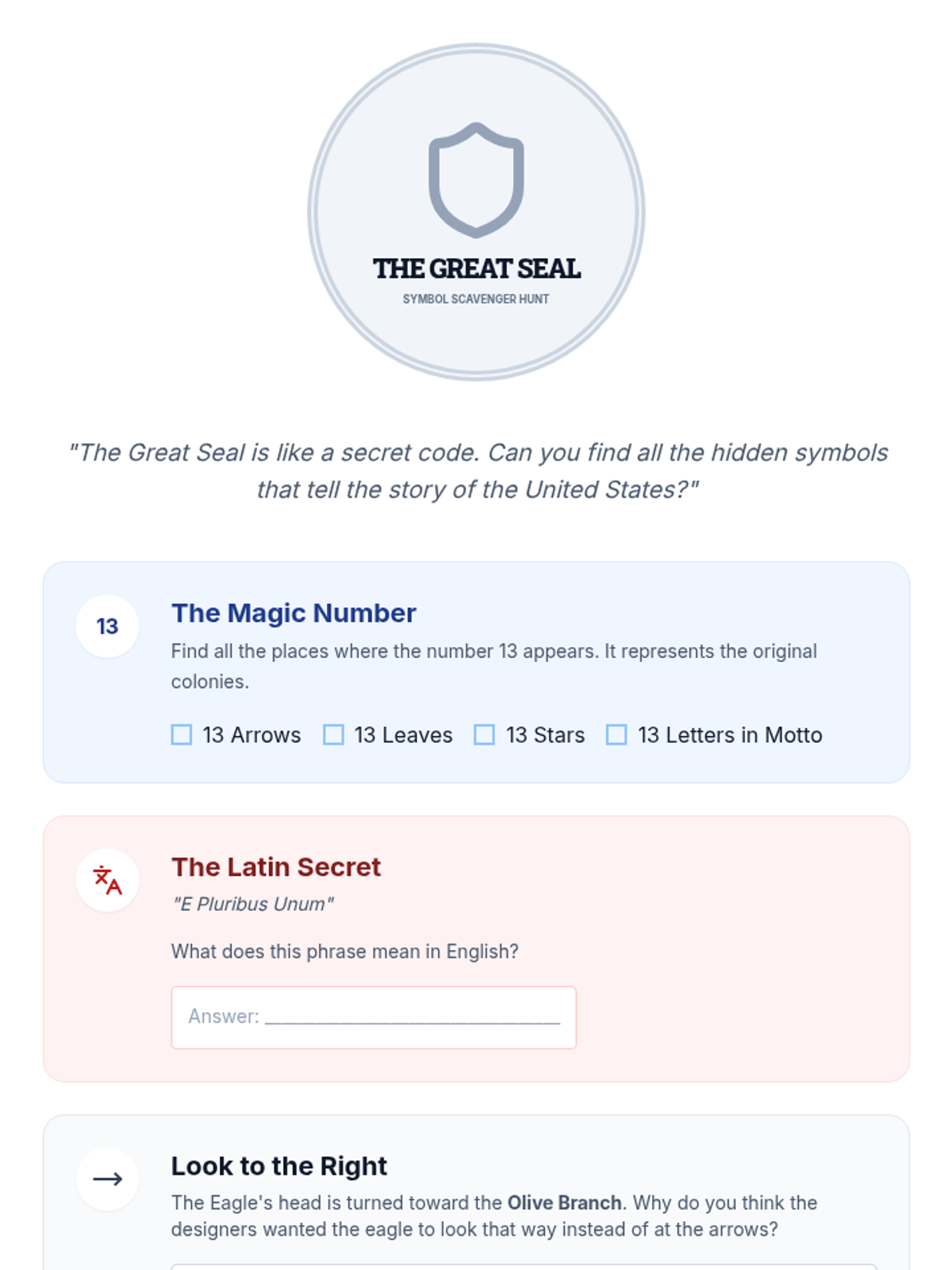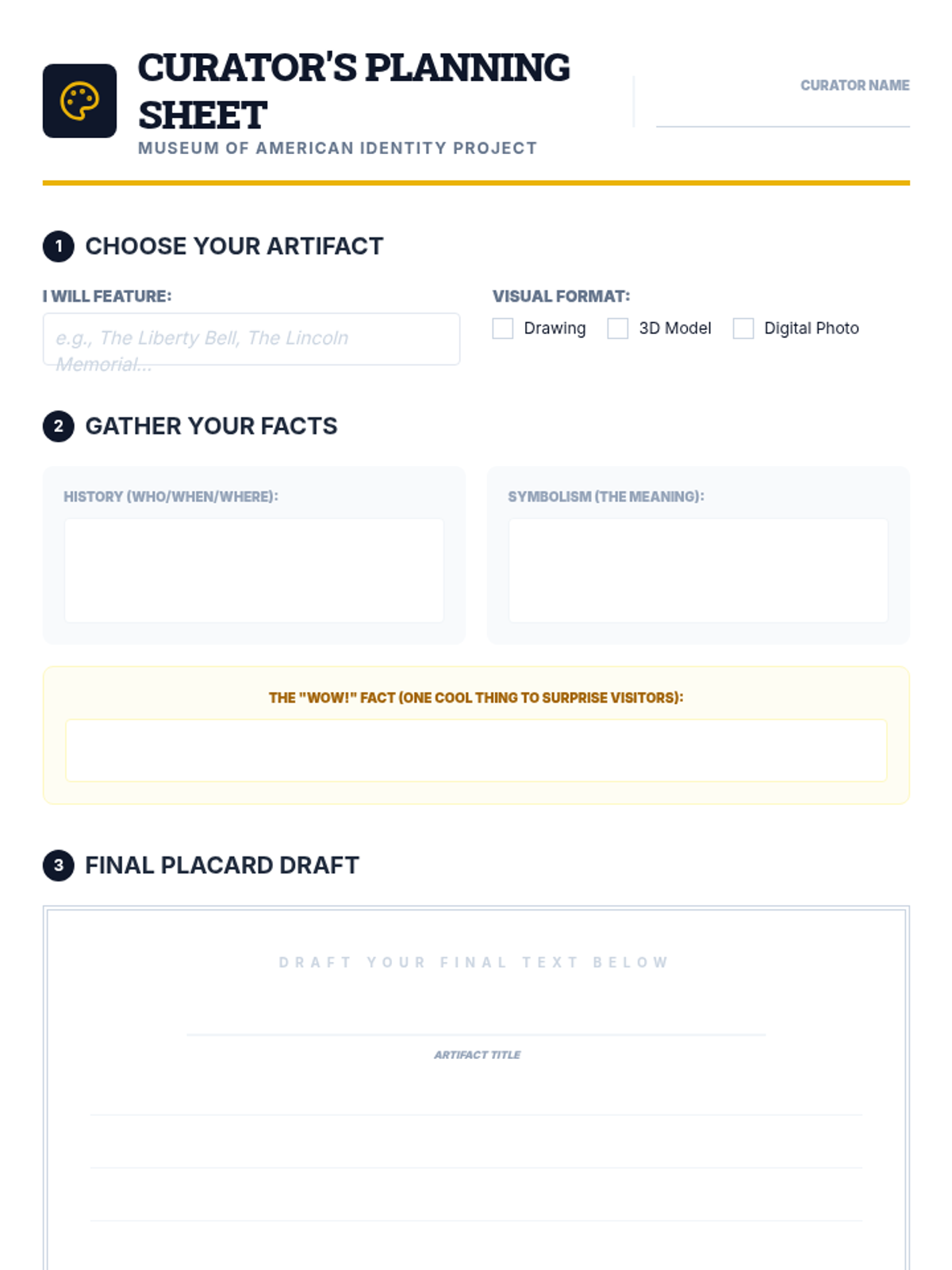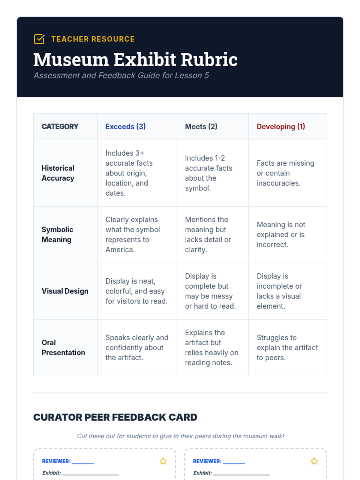 Students act as junior historians to investigate the origins and meanings behind the United States' most recognizable symbols and landmarks. They explore the American Flag, the Statue of Liberty, the Great Seal, and D.C. landmarks before creating their own museum exhibit.