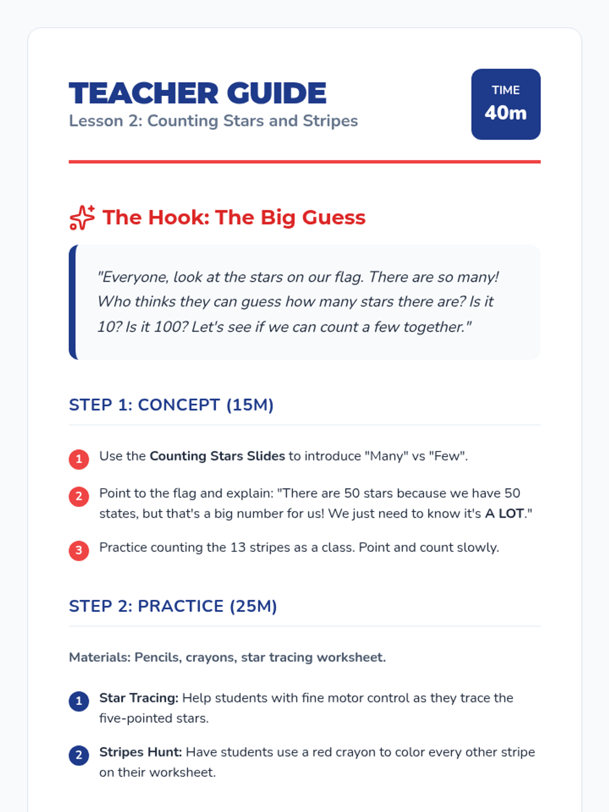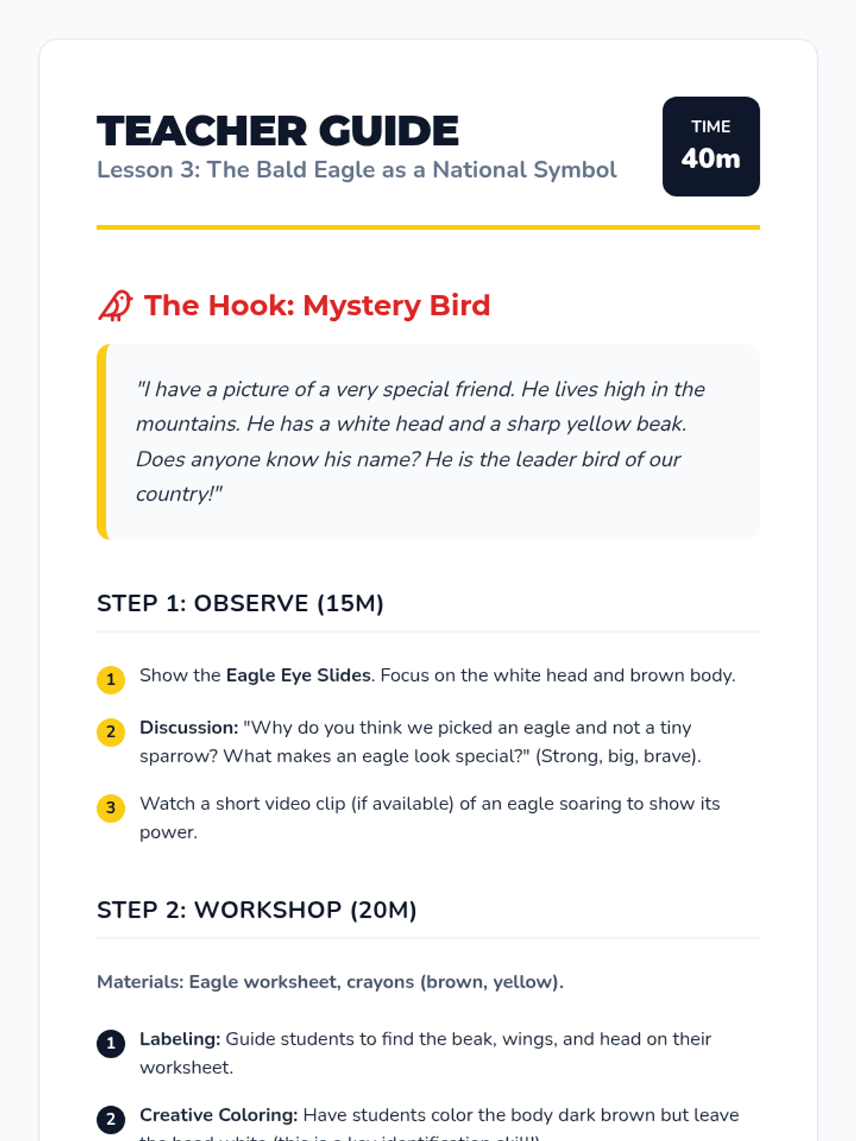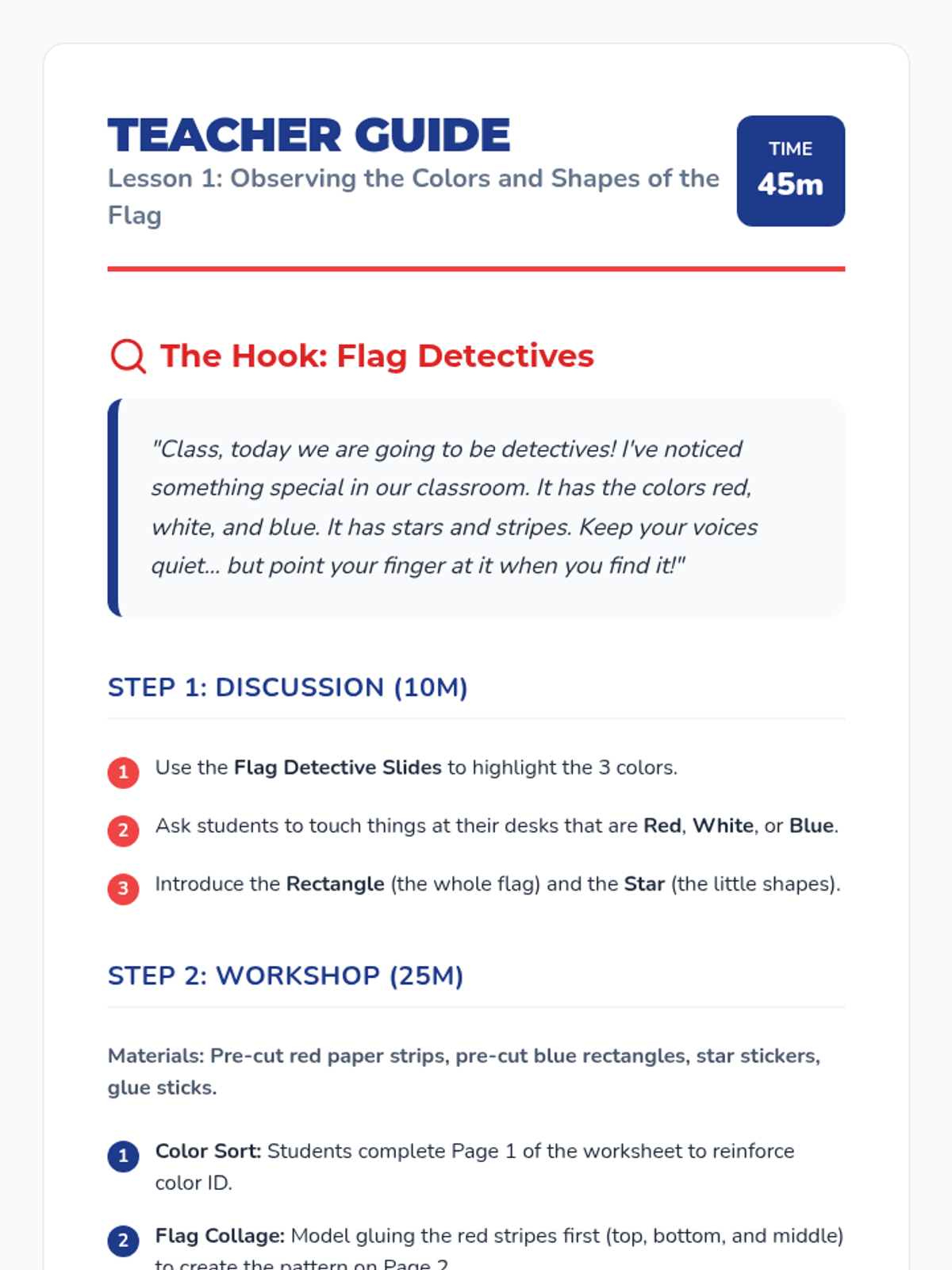 A Kindergarten sequence exploring American symbols, focusing on visual identification of the flag and bald eagle, and learning protocols for showing respect. Students engage in workshop-style activities to recognize colors, shapes, and characteristics of national icons.