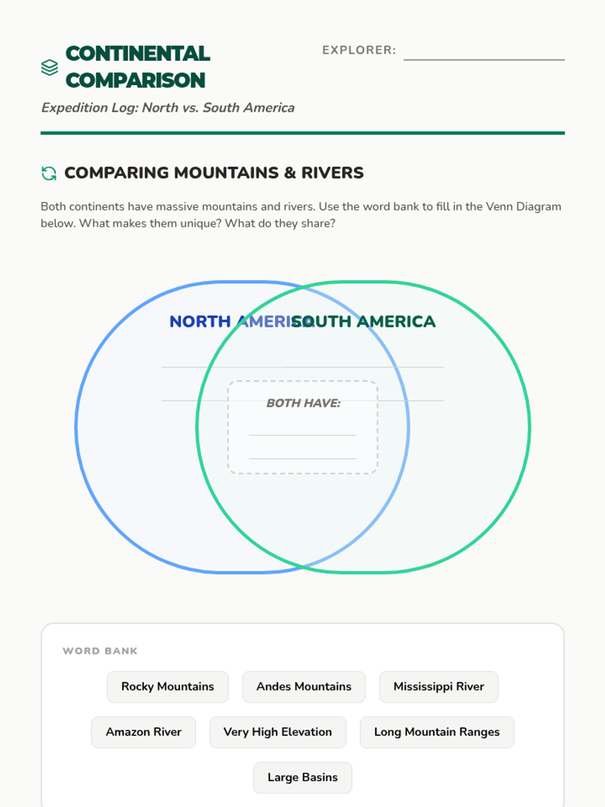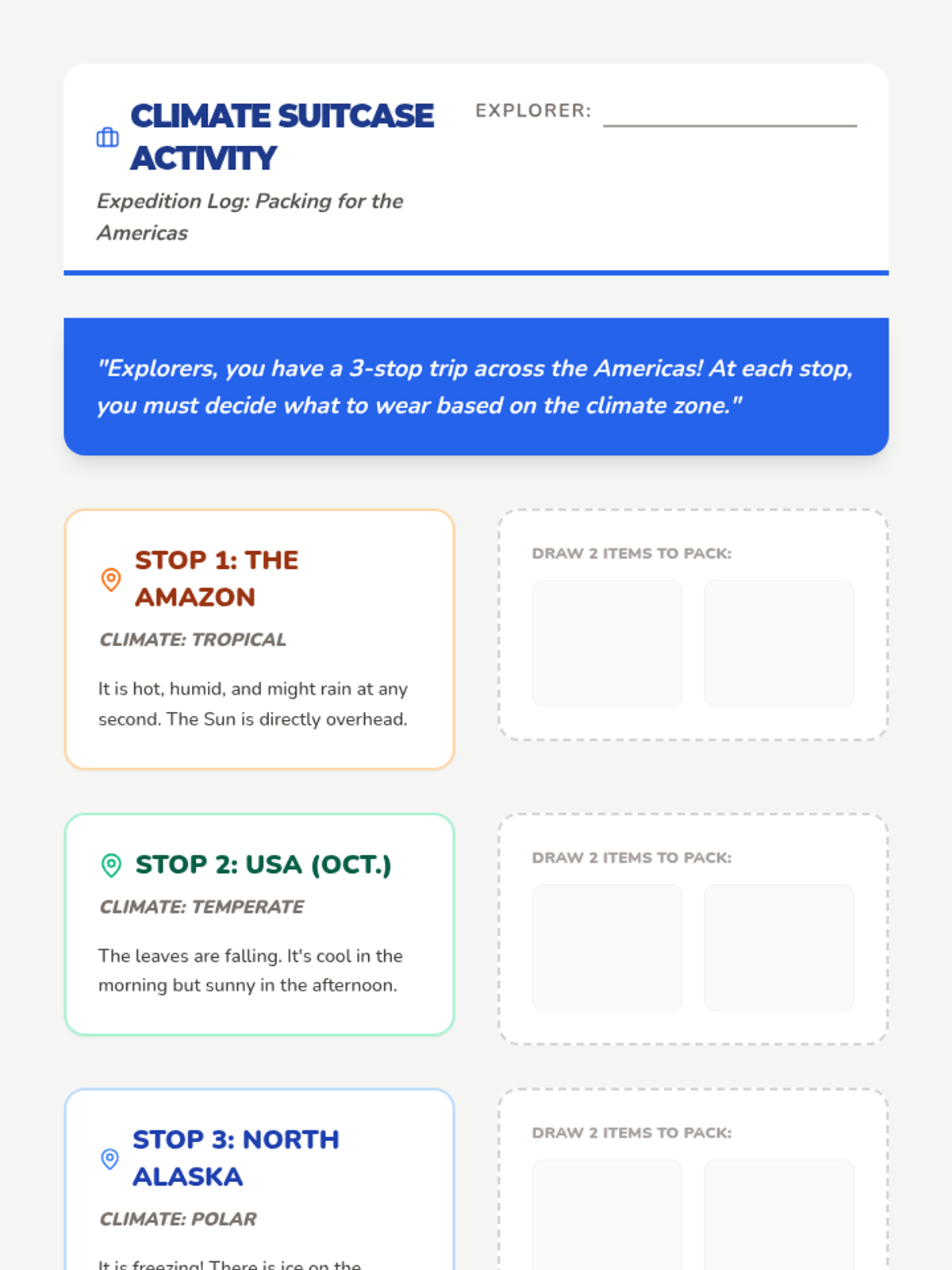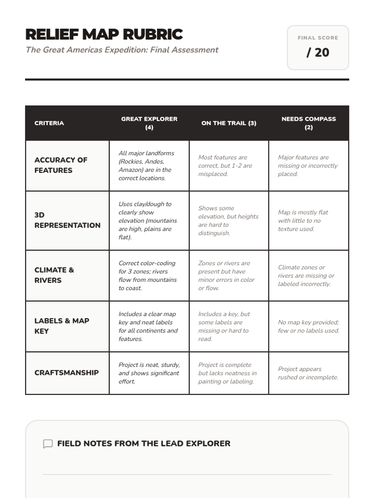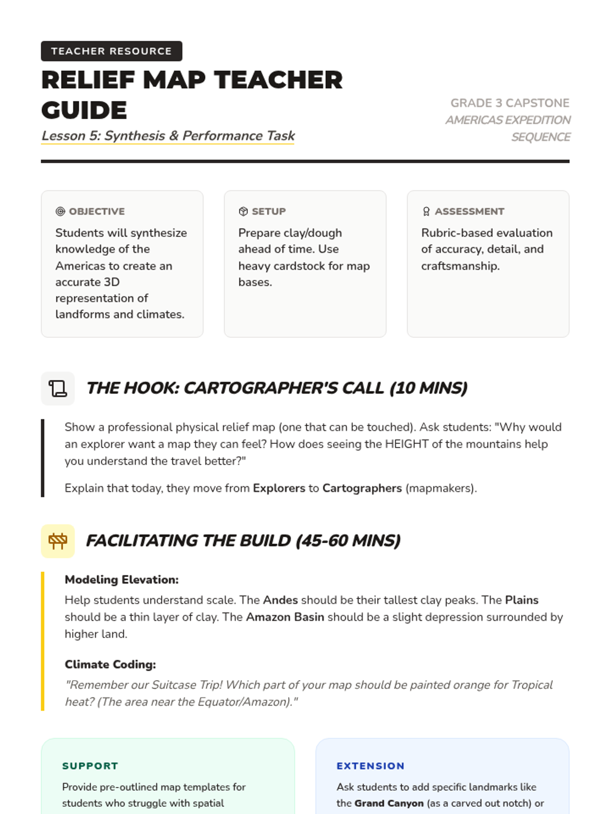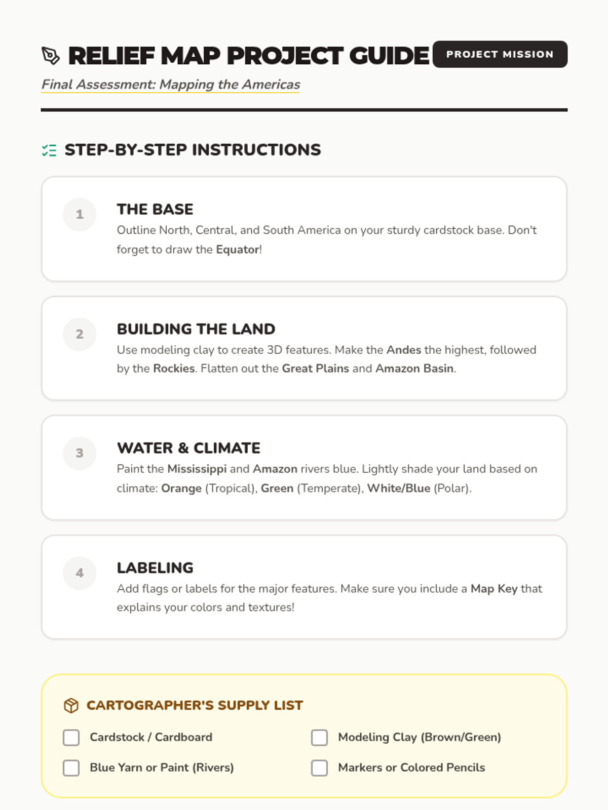 A 5-lesson geography sequence for 3rd graders exploring the continents, landforms, and climate zones of the Americas through a simulated expedition. Students will progress from basic map orientation to creating their own 3D relief maps.