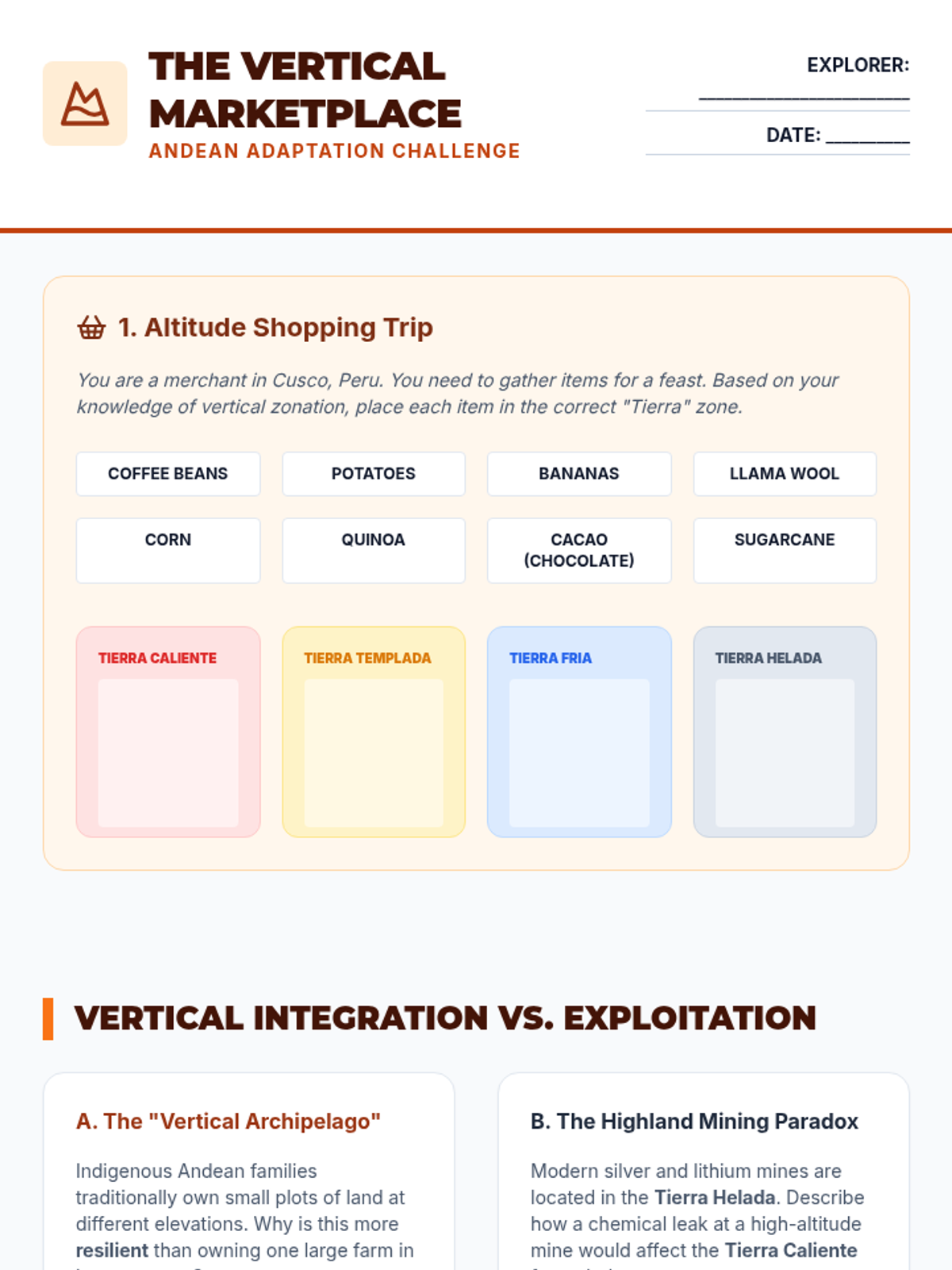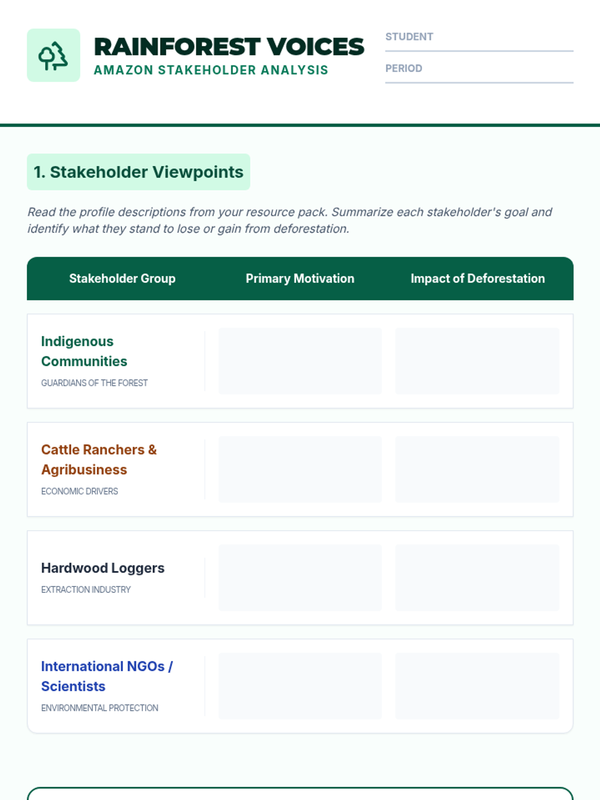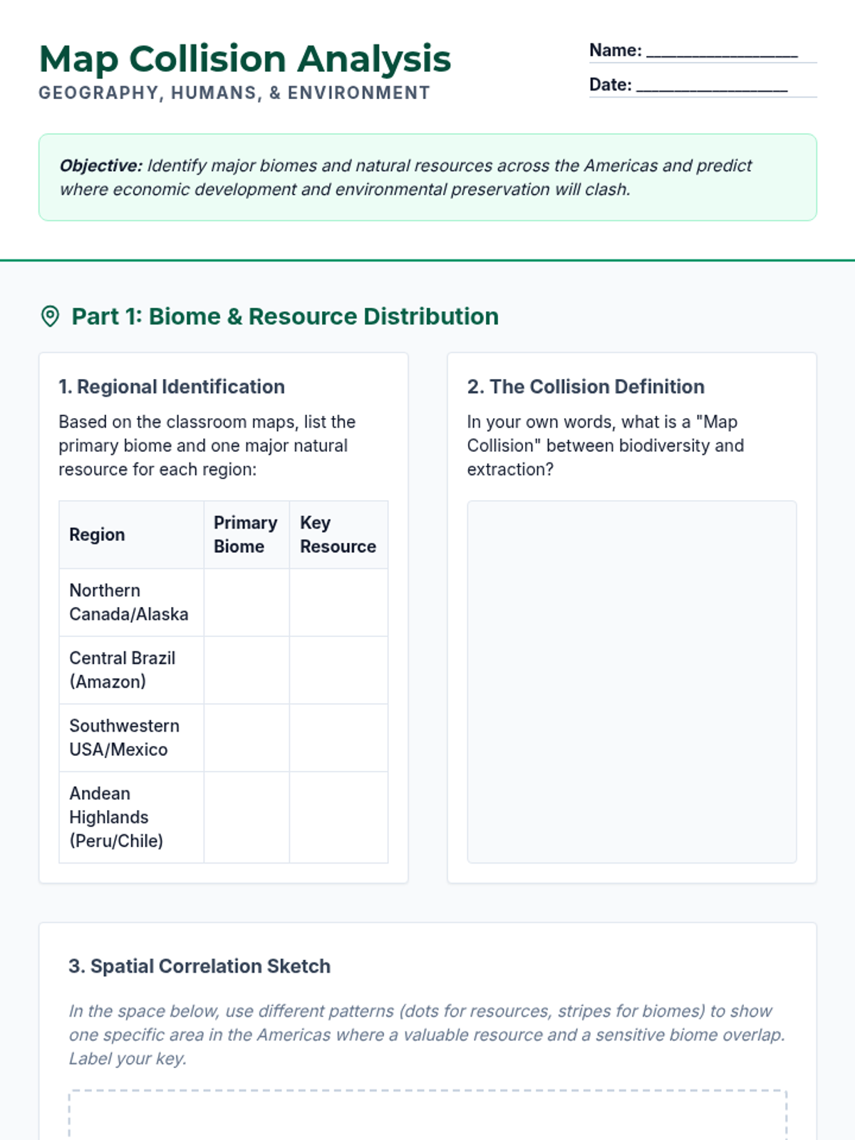 This 9th Grade Social Studies sequence explores the complex relationship between human economic development and environmental preservation across the Americas. Students analyze key geographic concepts such as biome distribution, vertical zonation, and watershed management through case studies in the Amazon, the American West, and the Andes, culminating in a mock diplomatic summit on sustainable development.