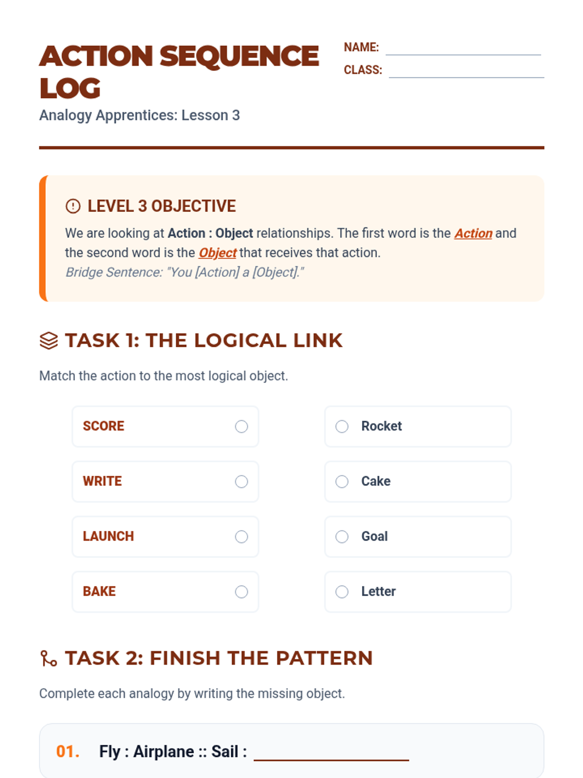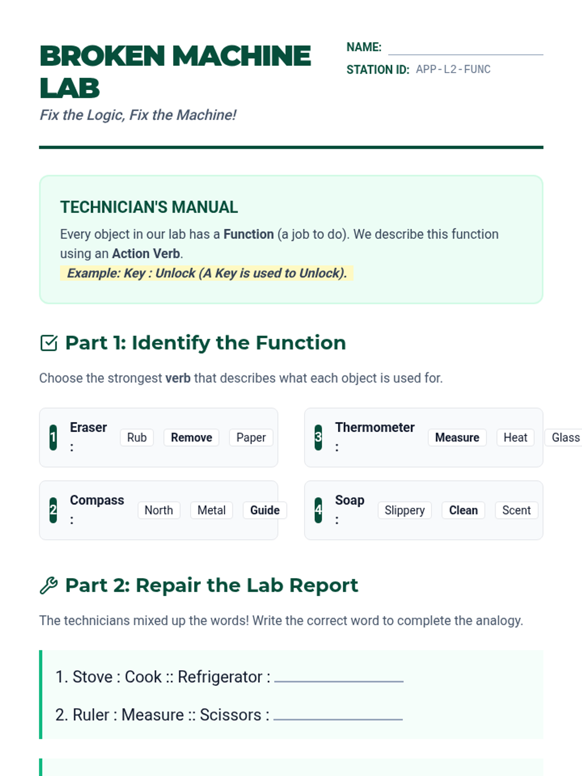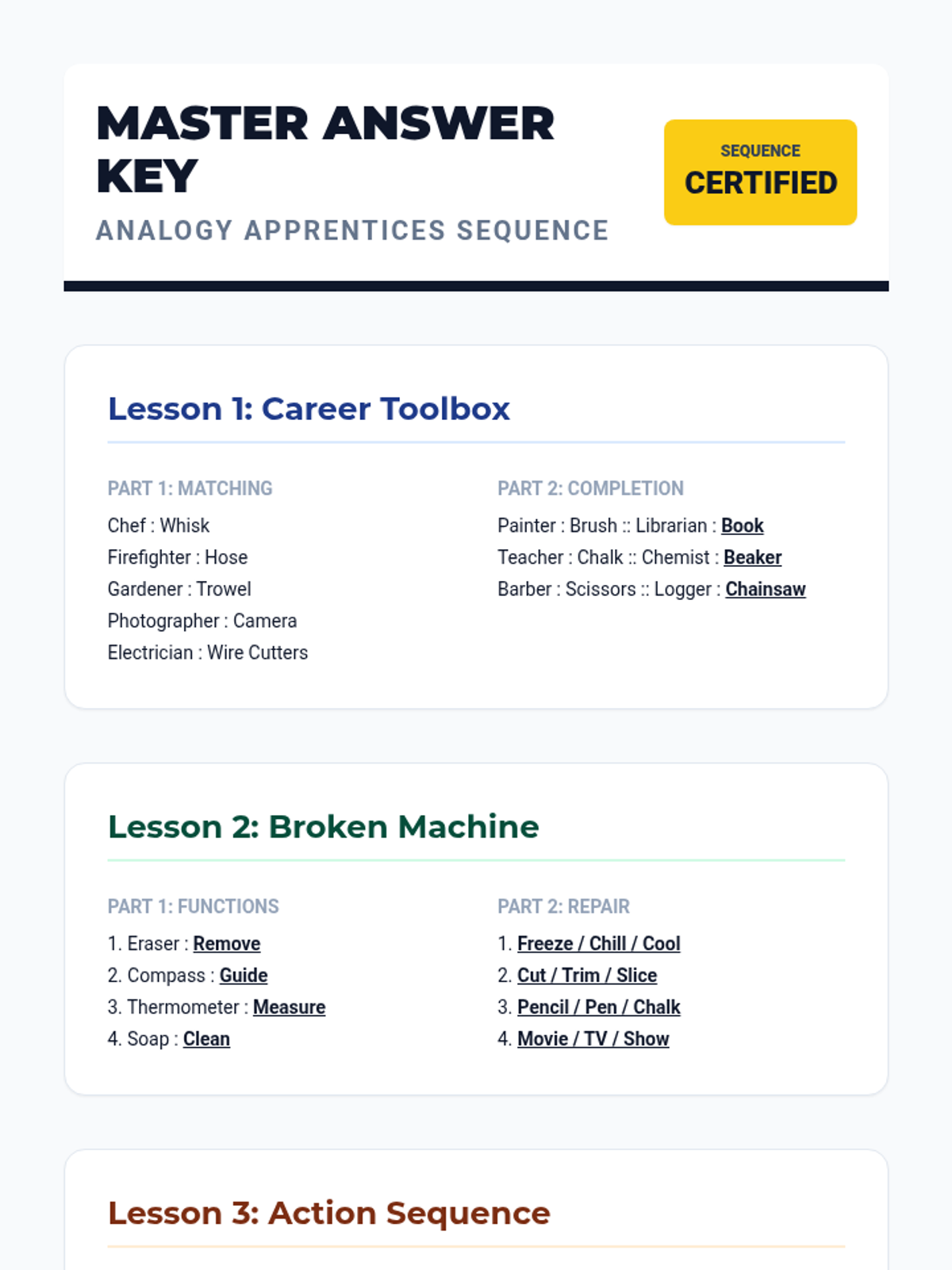 This sequence explores functional relationships in analogies, focusing on how workers, tools, objects, and actions connect logically. Students will develop career vocabulary and functional analysis skills through a 'Logic Workshop' theme.