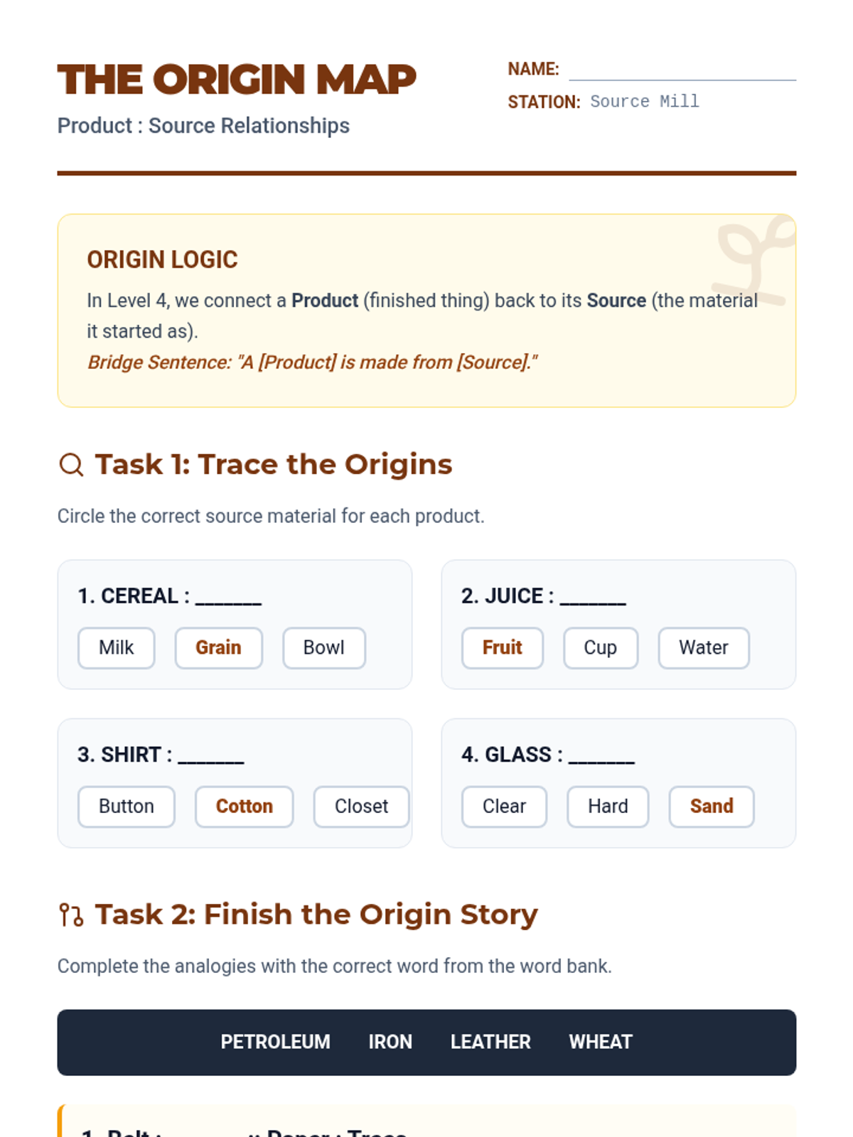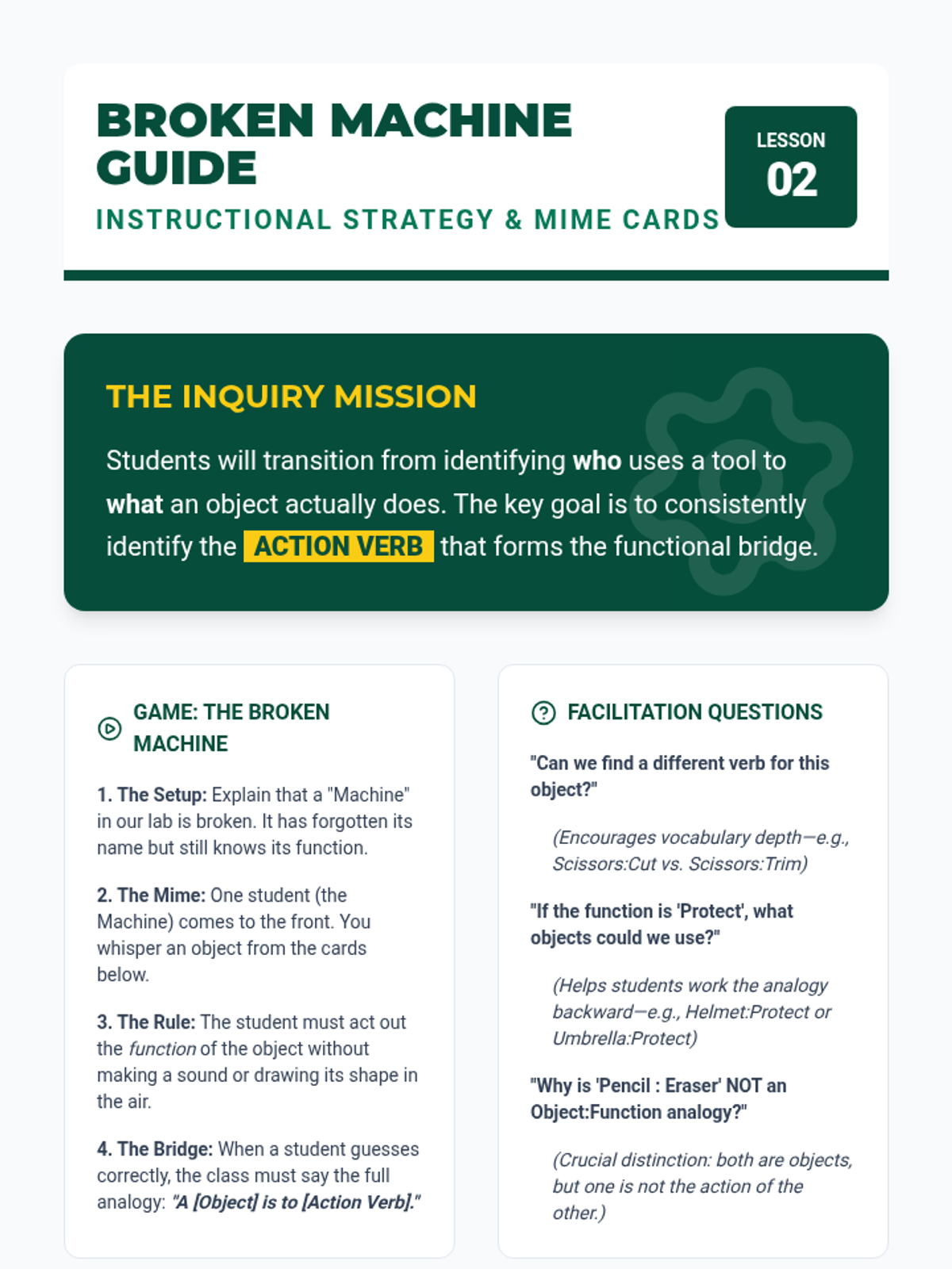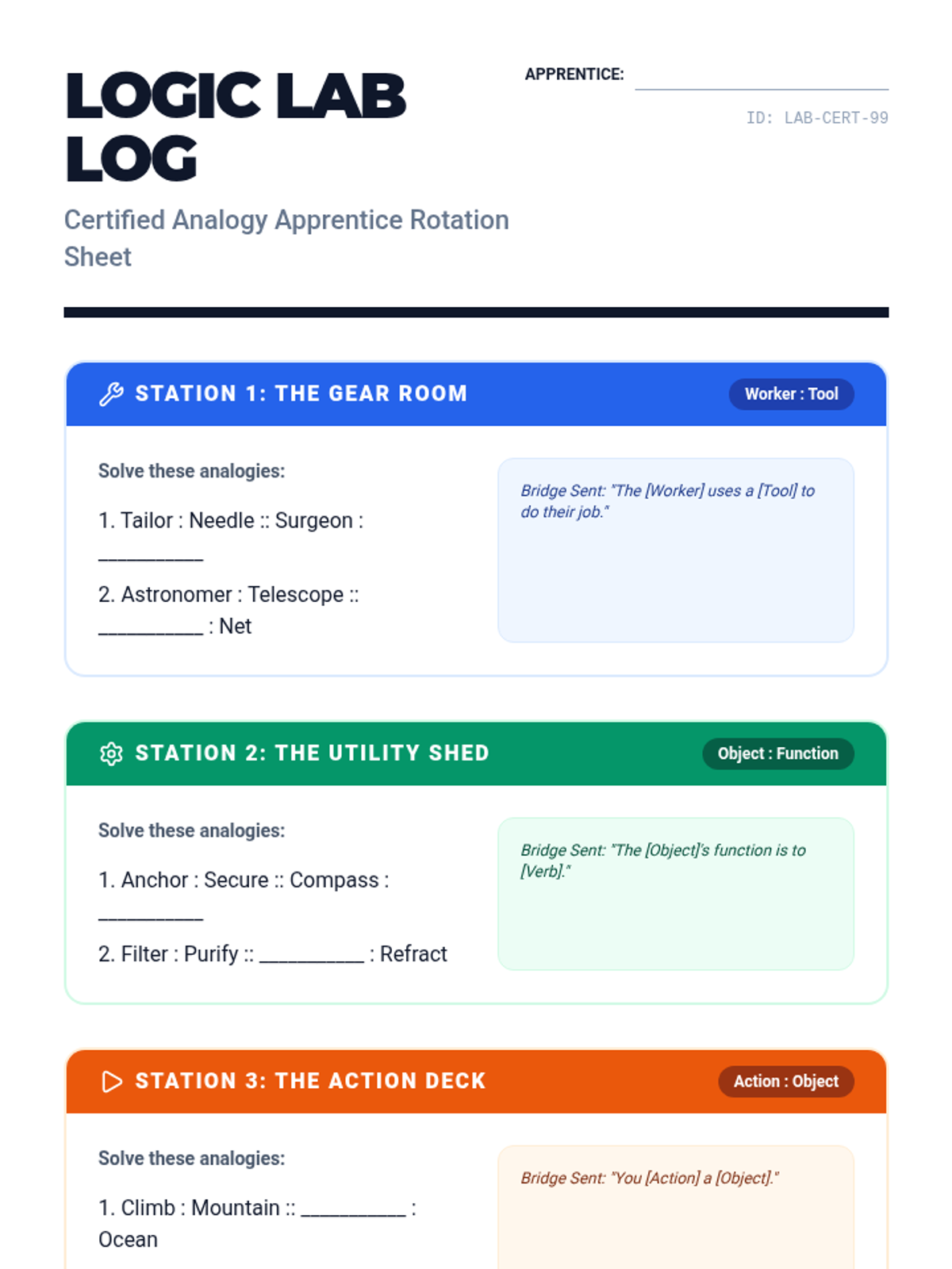 This sequence explores functional relationships in analogies, focusing on how workers, tools, objects, and actions connect logically. Students will develop career vocabulary and functional analysis skills through a 'Logic Workshop' theme.