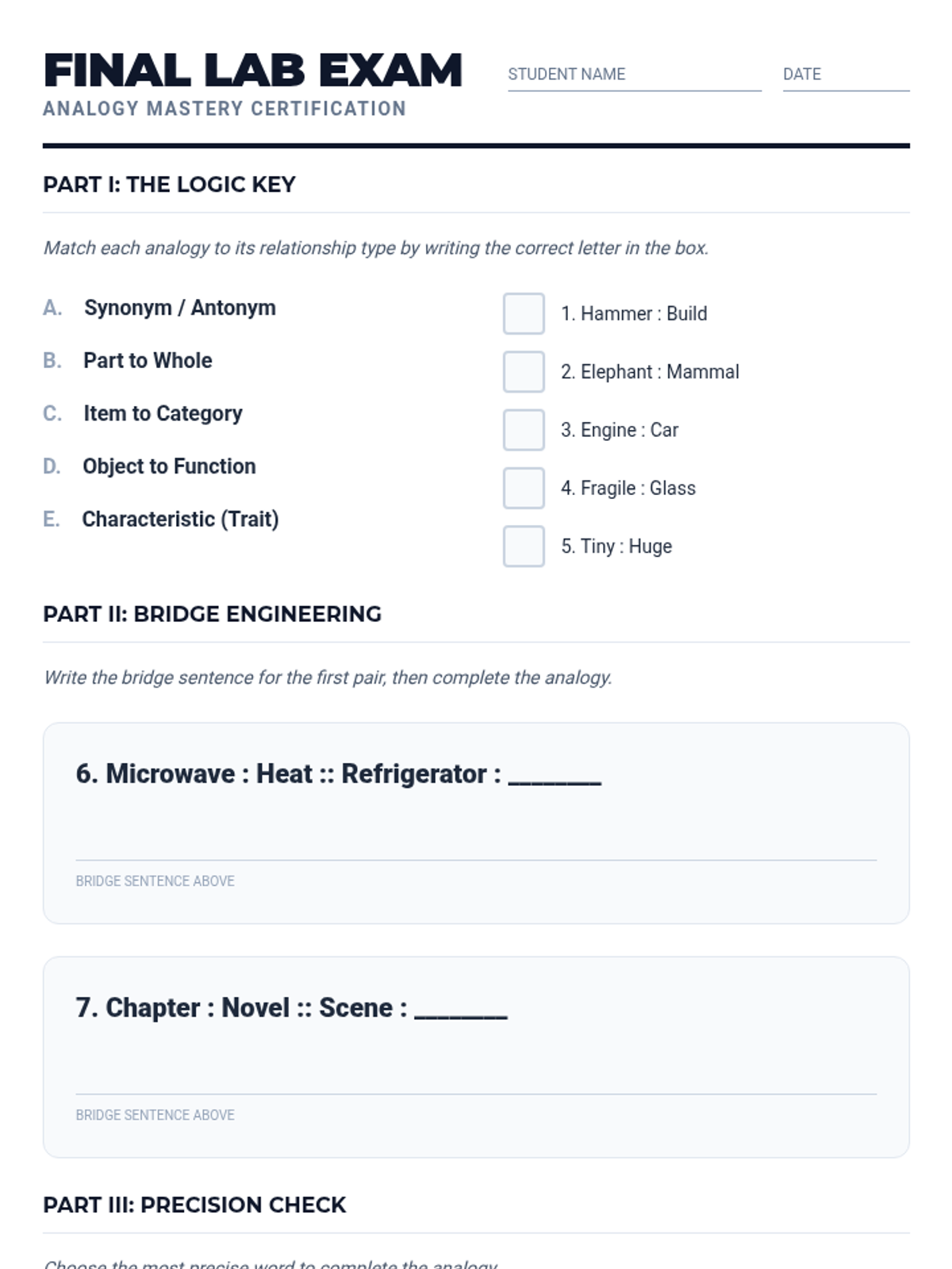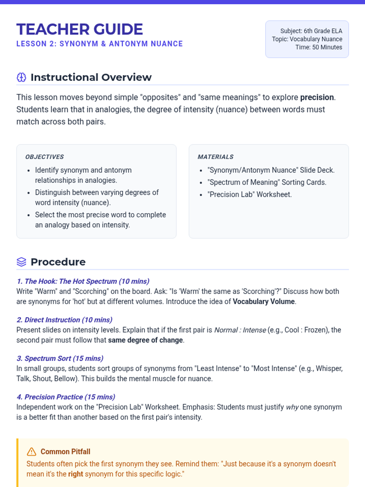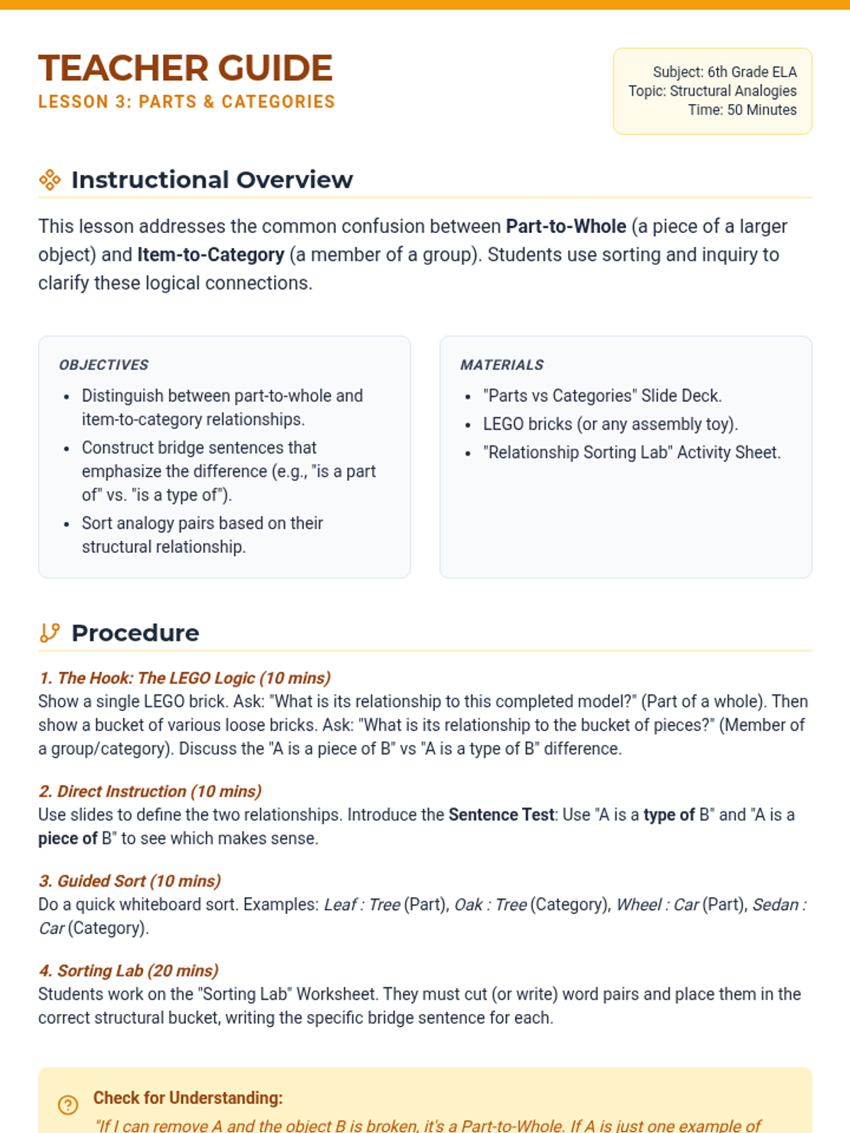 This sequence introduces 6th-grade students to the structure of analogies, focusing on identifying specific relationship types using the 'bridge sentence' strategy. Students progress from simple synonym/antonym pairs to complex structural and functional relationships.