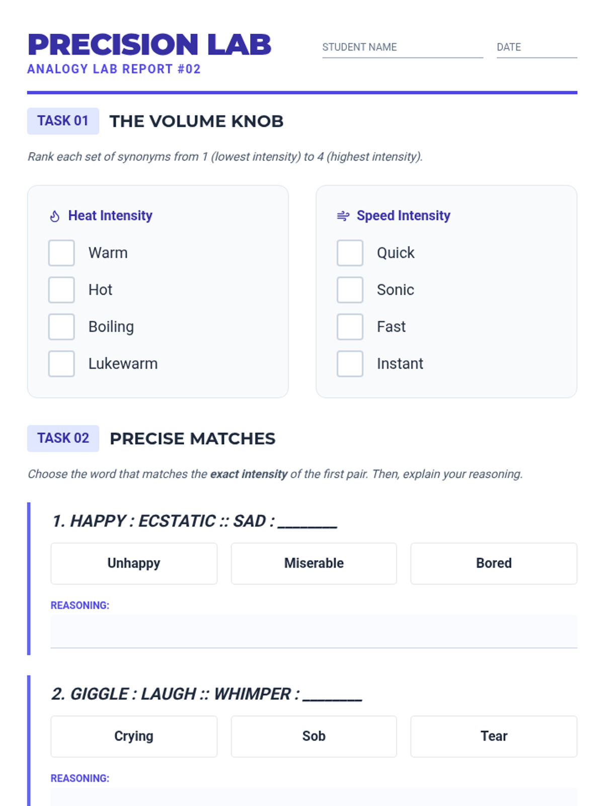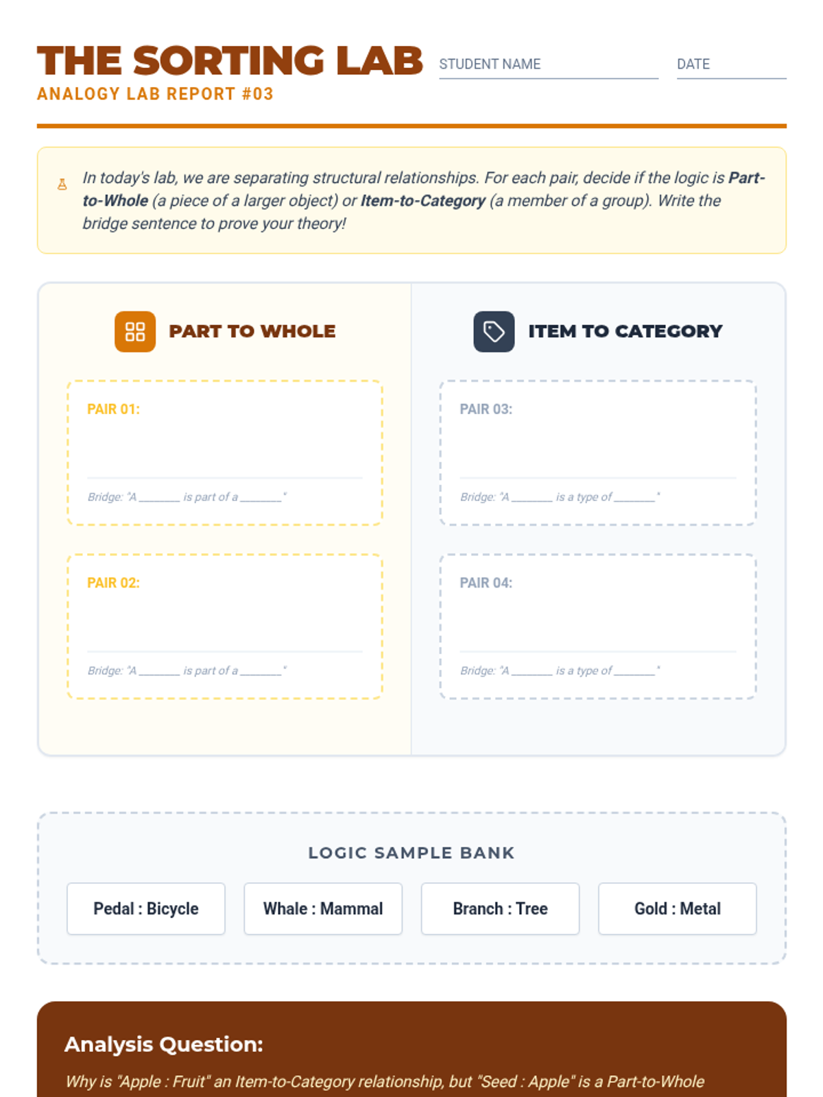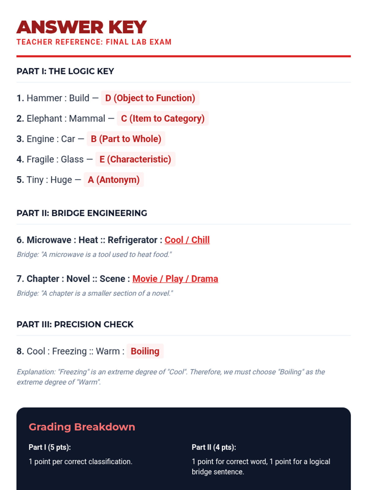 This sequence introduces 6th-grade students to the structure of analogies, focusing on identifying specific relationship types using the 'bridge sentence' strategy. Students progress from simple synonym/antonym pairs to complex structural and functional relationships.