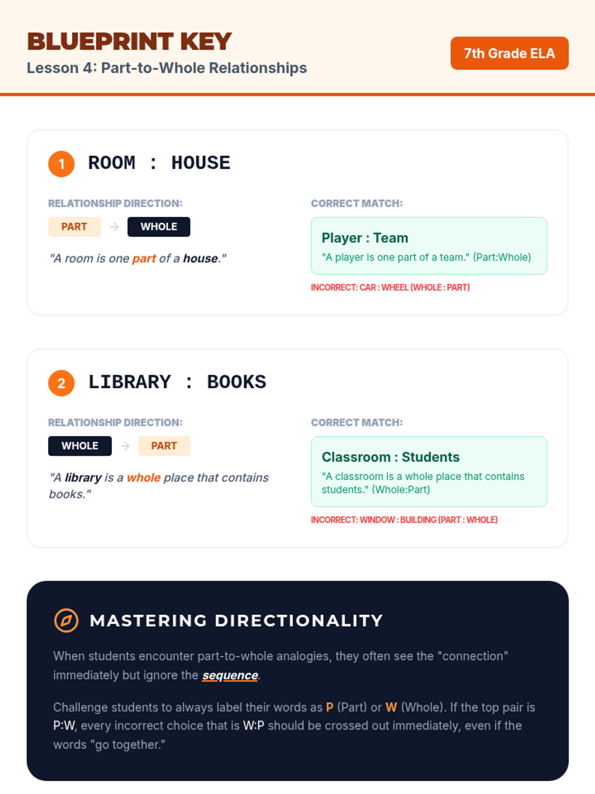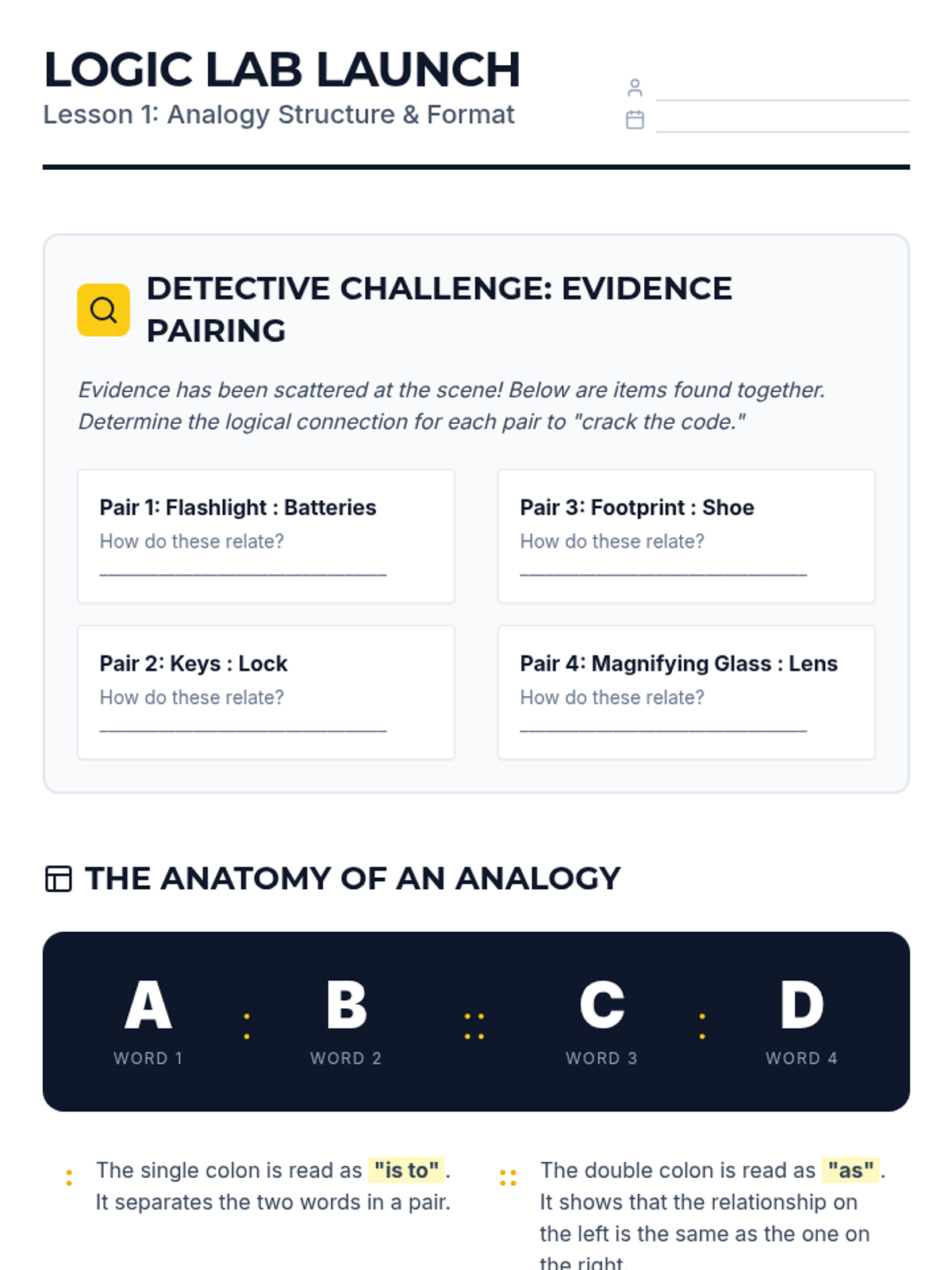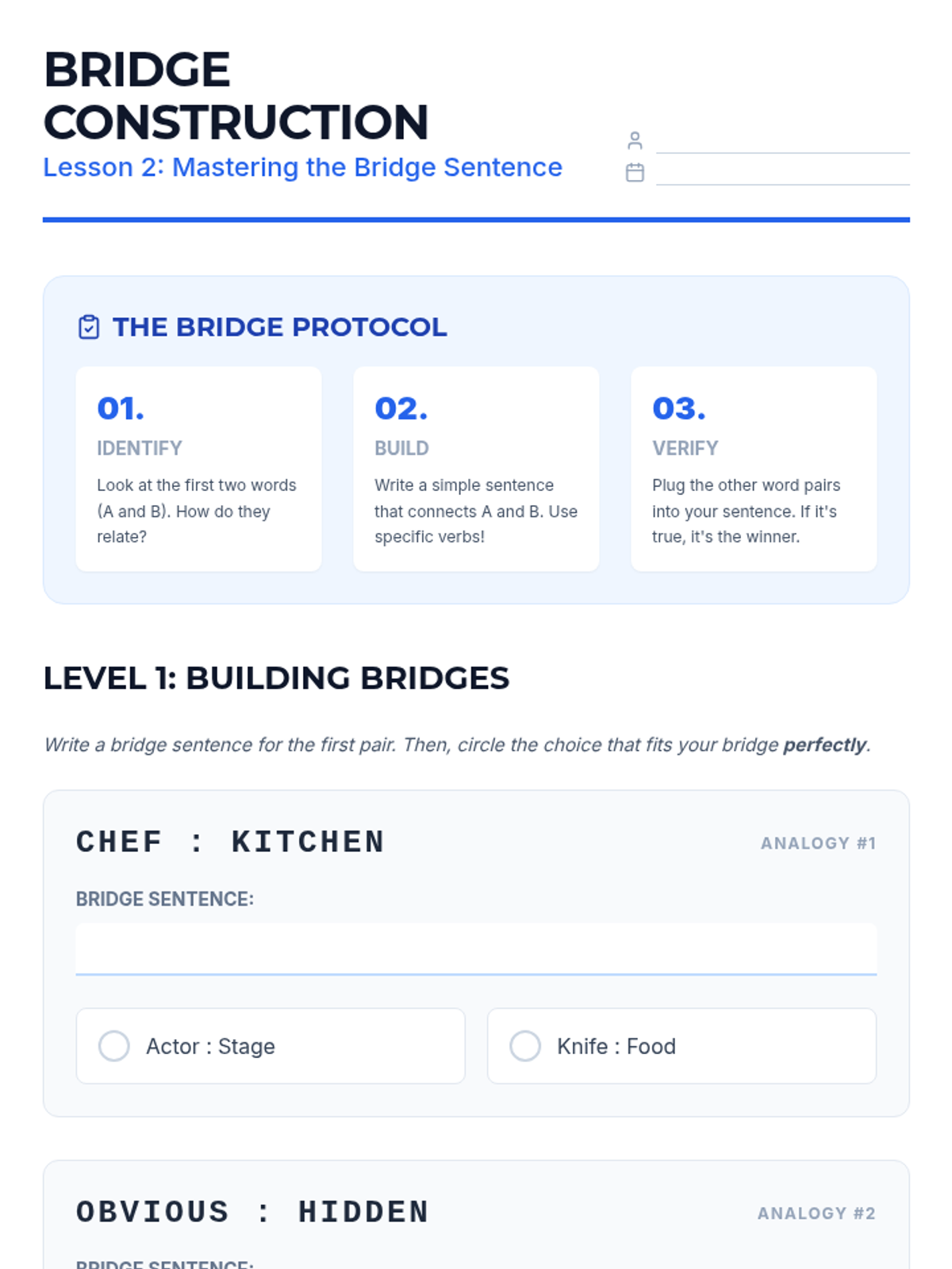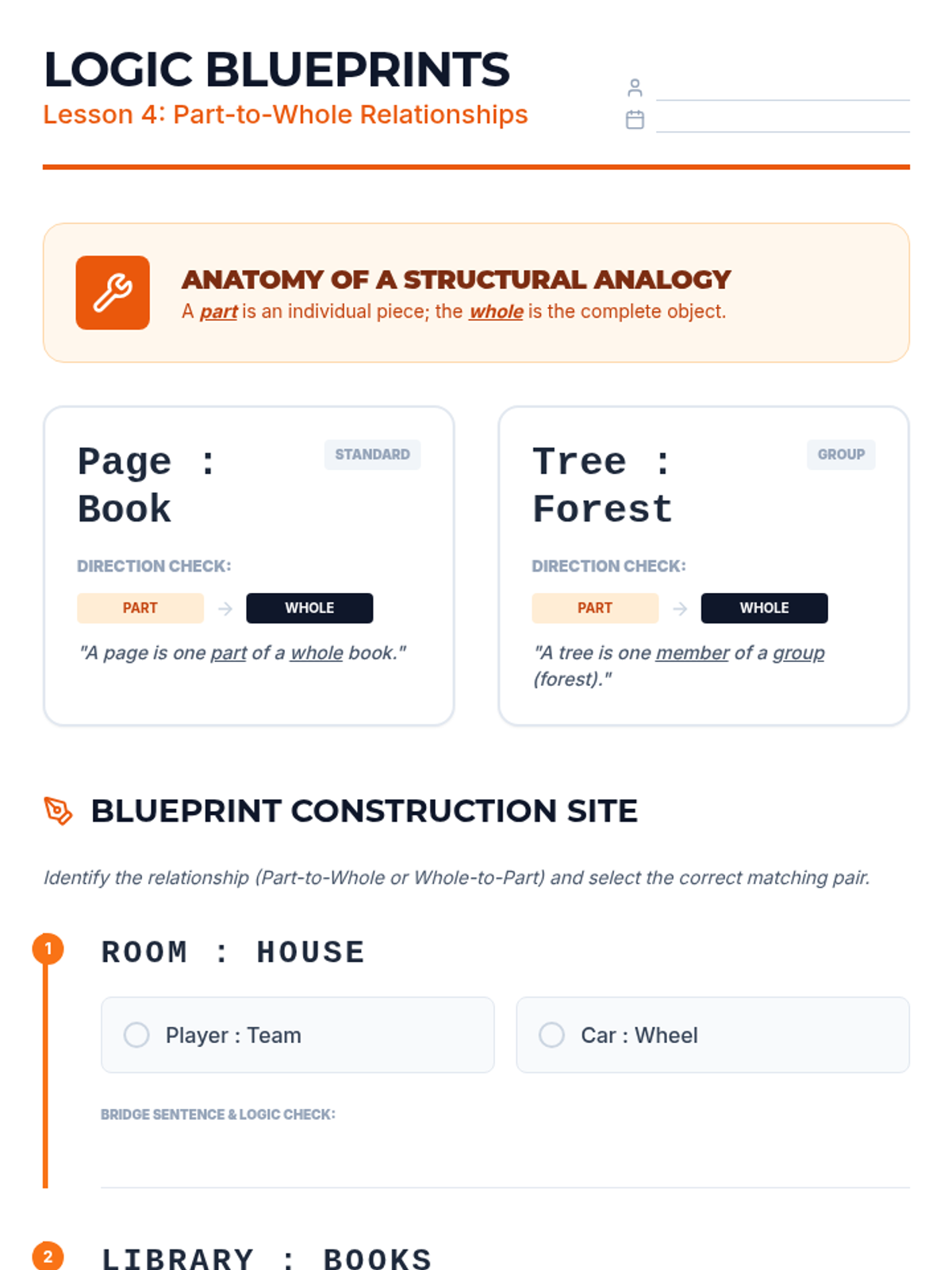 This sequence establishes the fundamental mechanics of solving analogies, focusing on the 'bridge sentence' strategy to articulate relationships. Students move from simple synonym and antonym pairs to part-to-whole relationships, learning to formalize logical thinking into sentence structures.