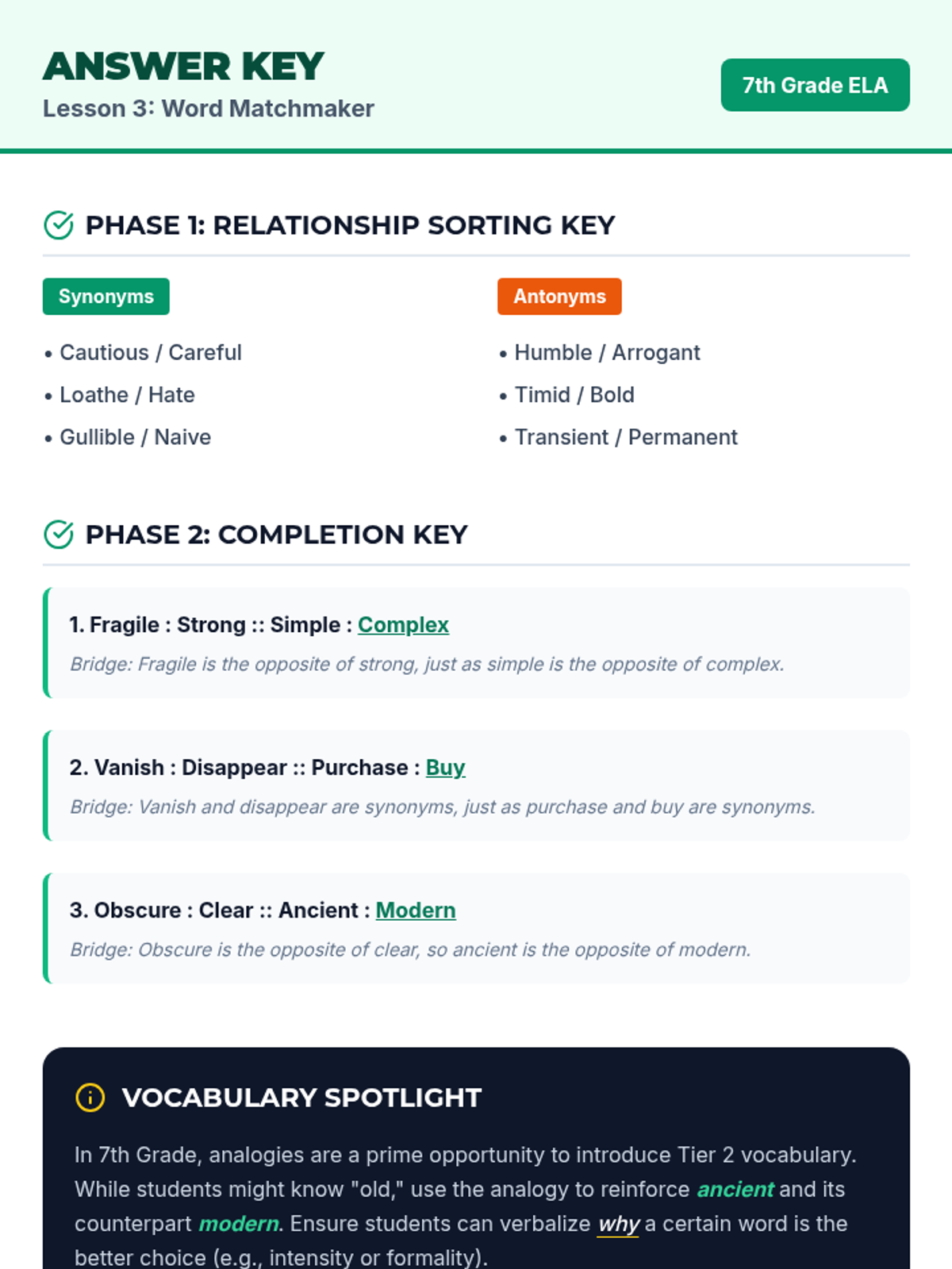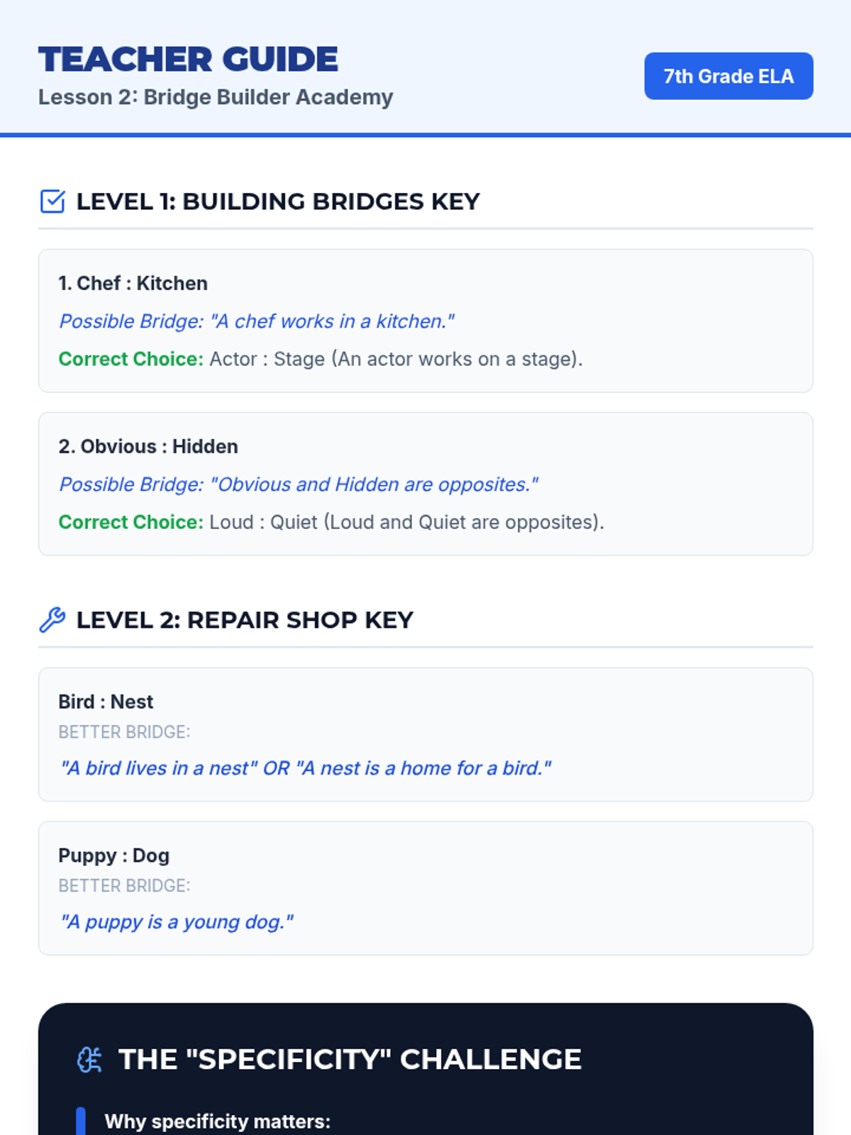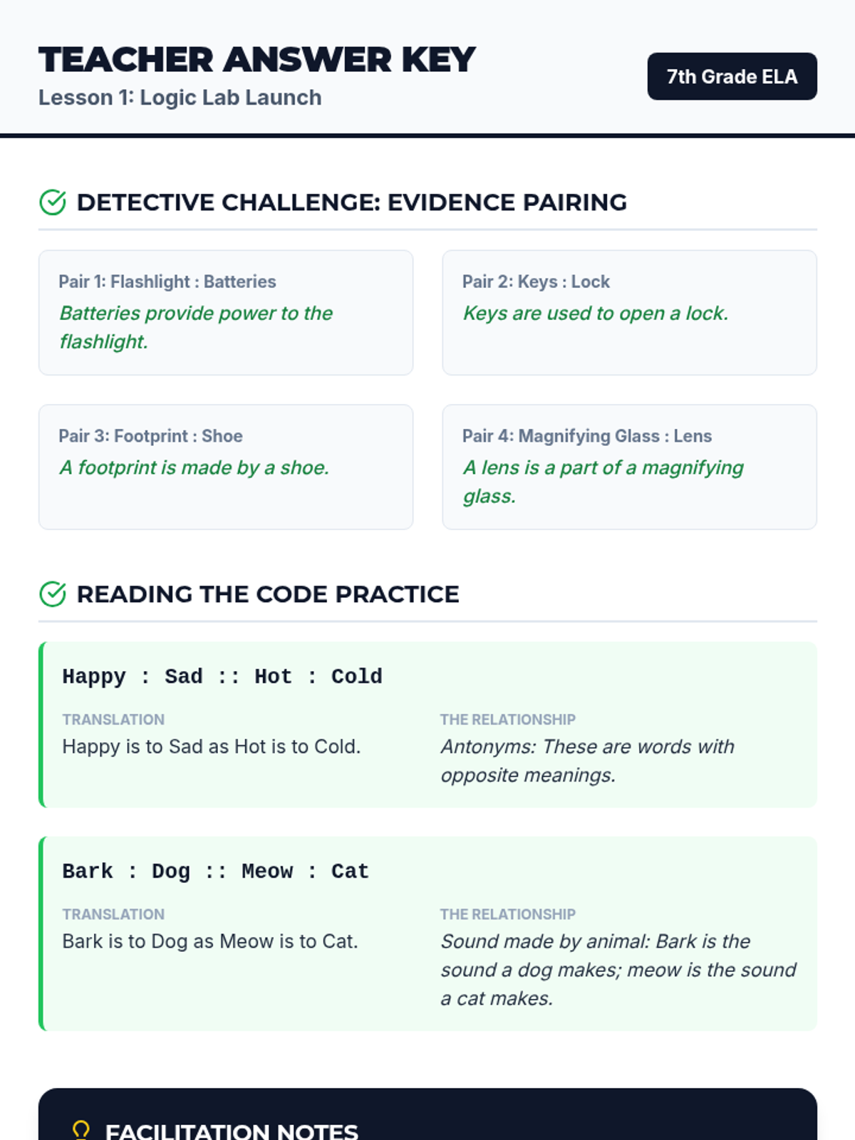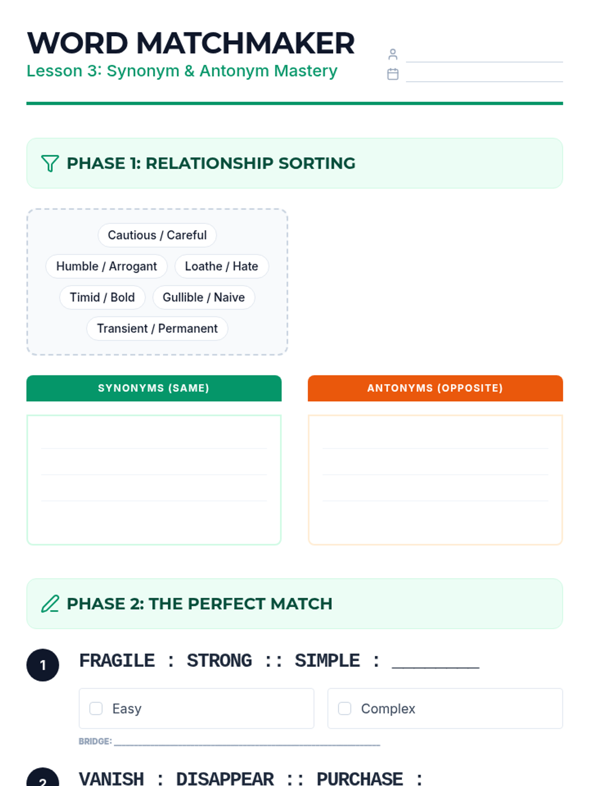 This sequence establishes the fundamental mechanics of solving analogies, focusing on the 'bridge sentence' strategy to articulate relationships. Students move from simple synonym and antonym pairs to part-to-whole relationships, learning to formalize logical thinking into sentence structures.