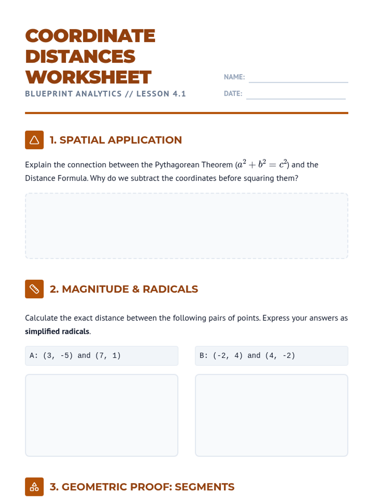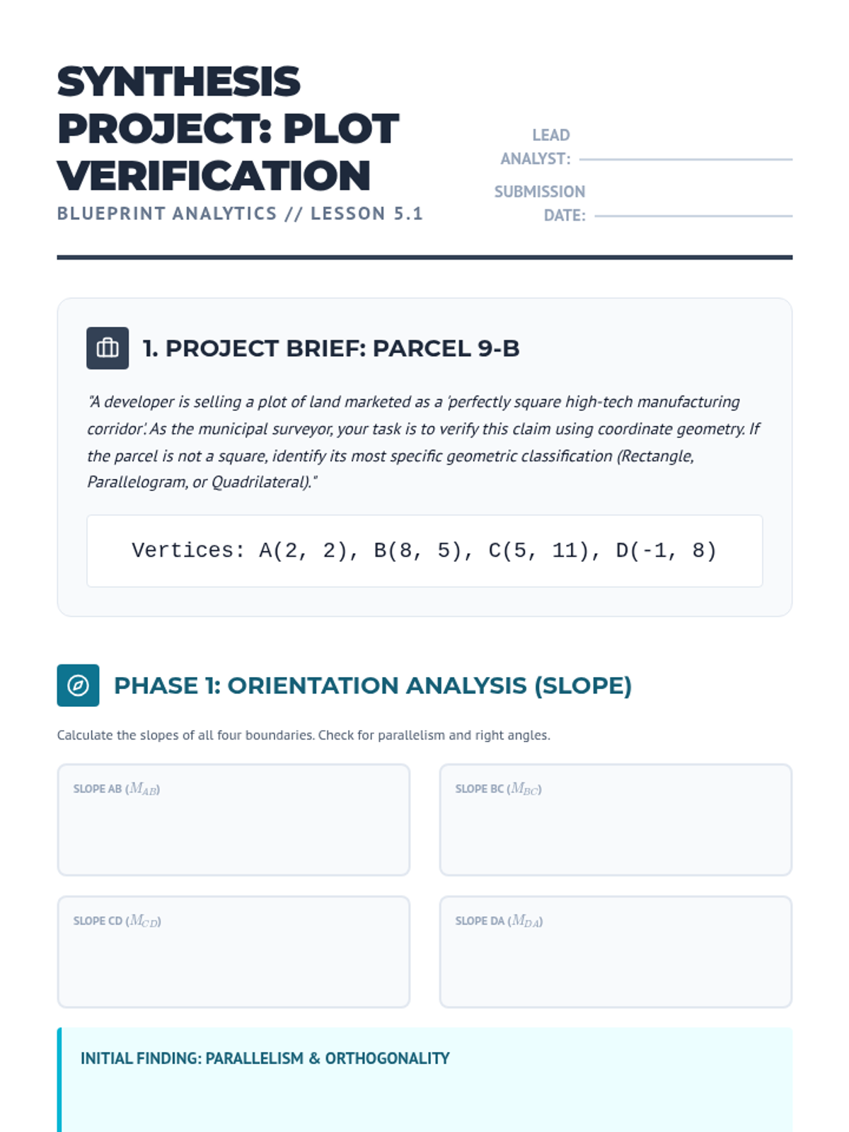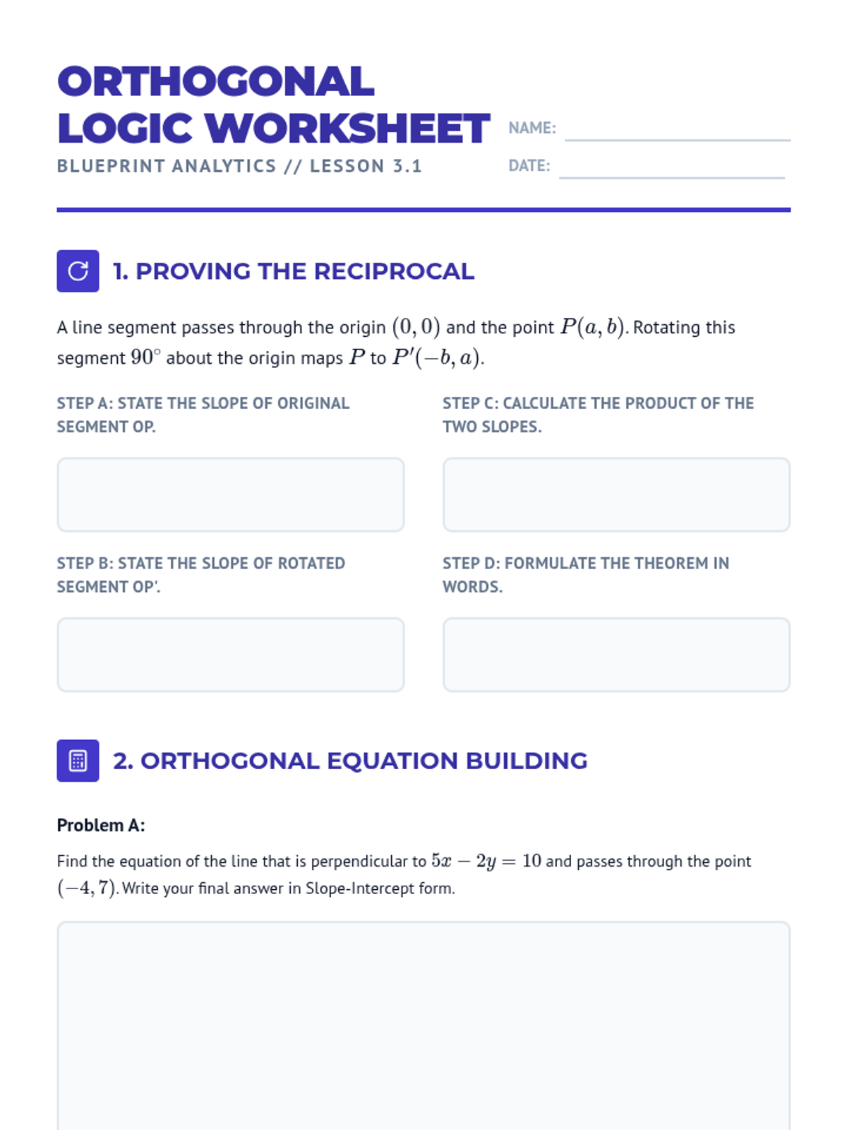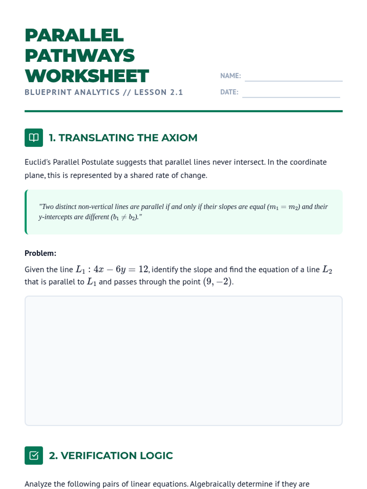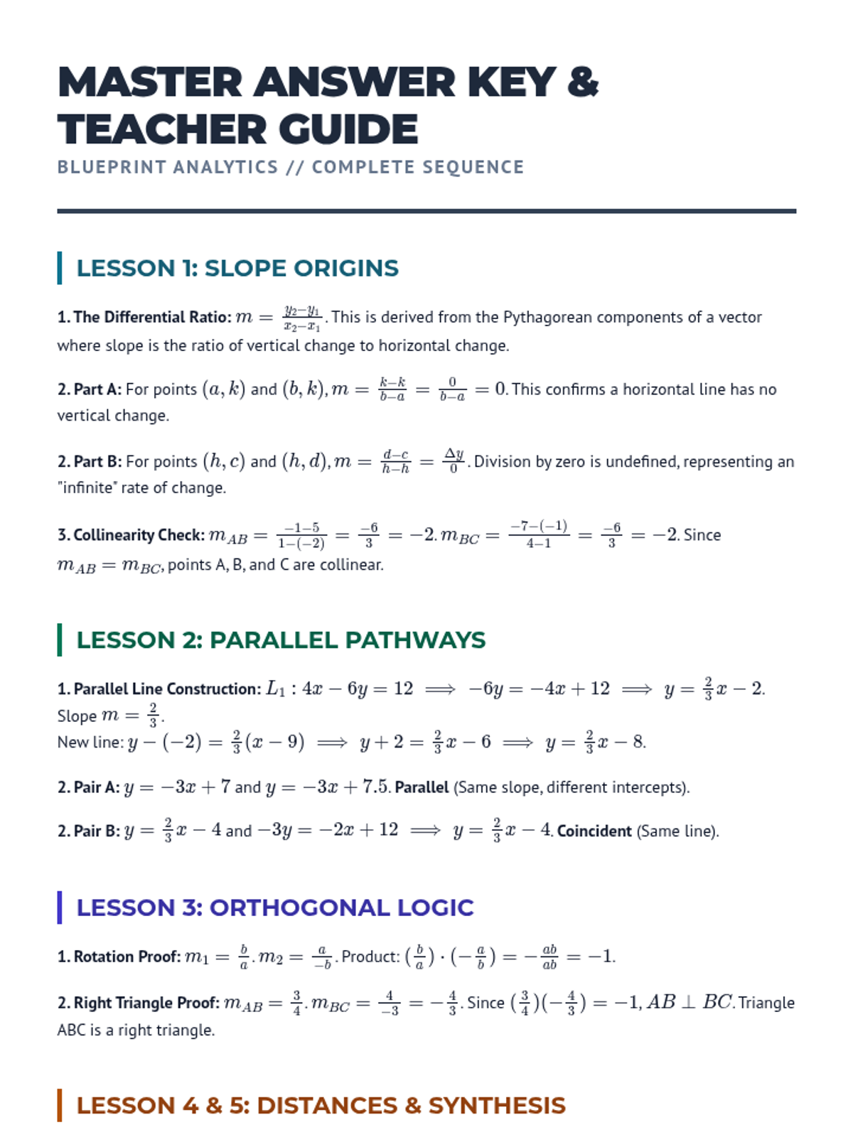 A rigorous undergraduate sequence bridging basic graphing and formal analytic geometry. Students derive slope properties, prove parallel and perpendicular conditions algebraically, and synthesize these concepts to verify geometric relationships using the distance formula and linear equations.