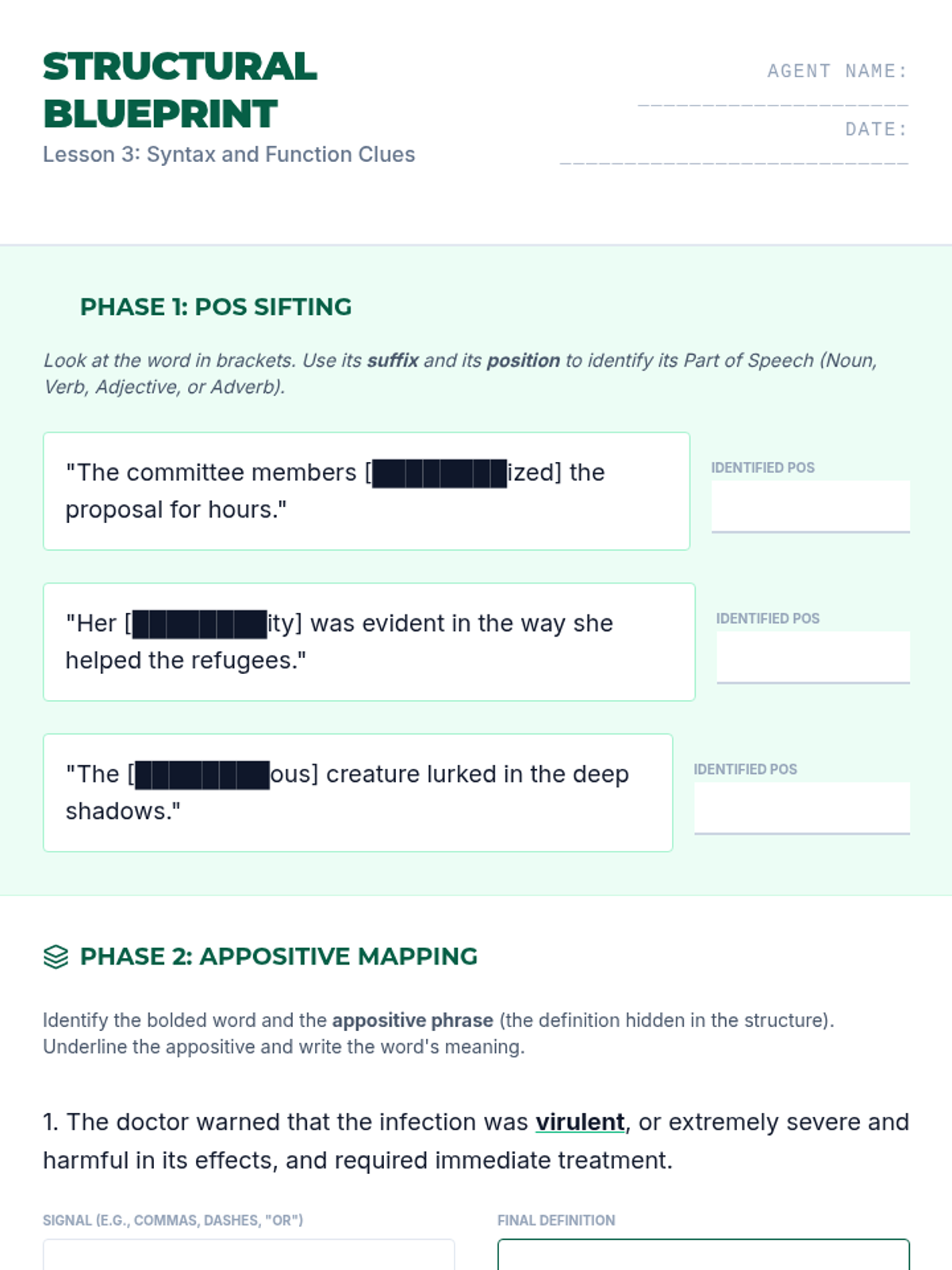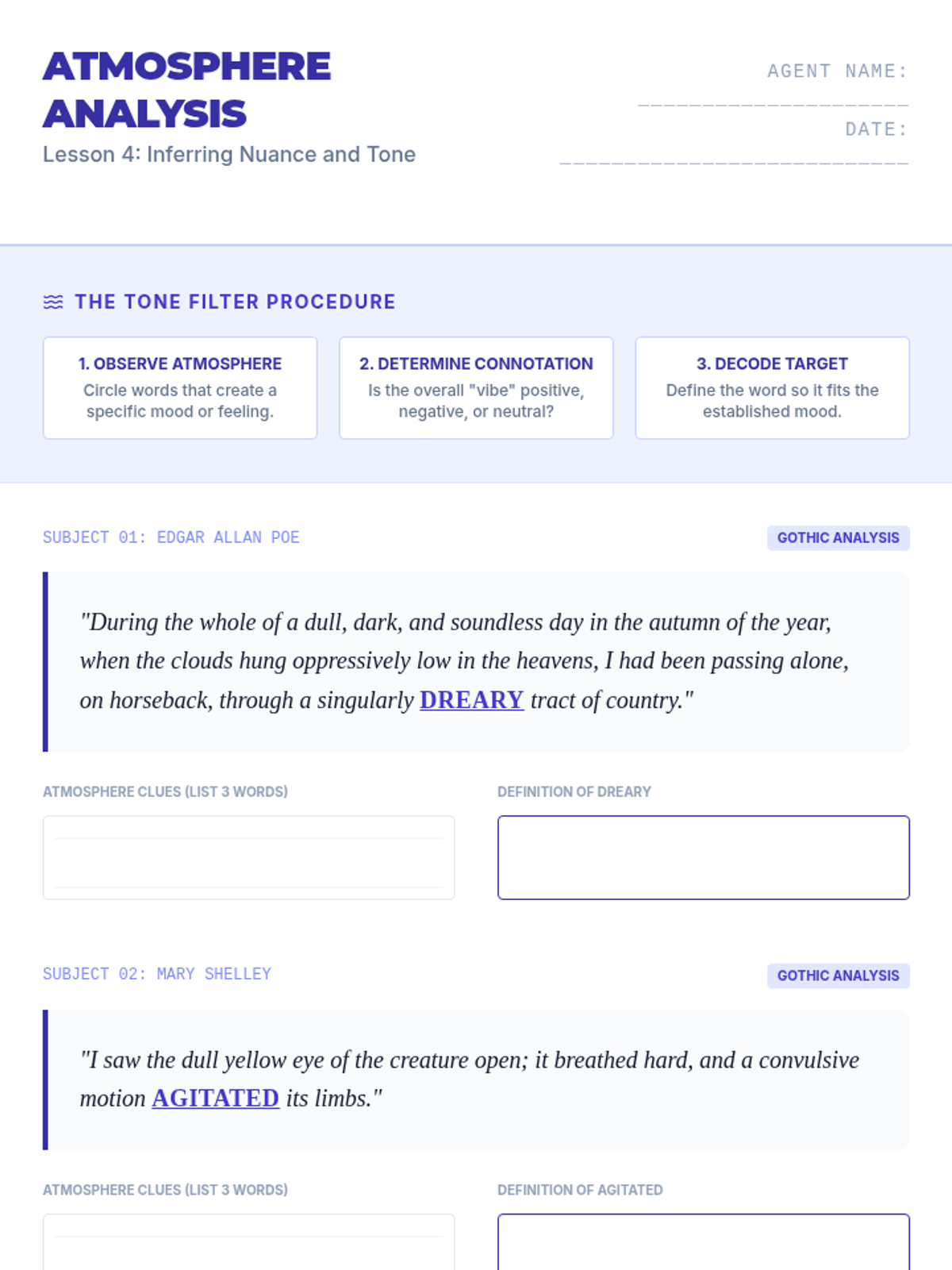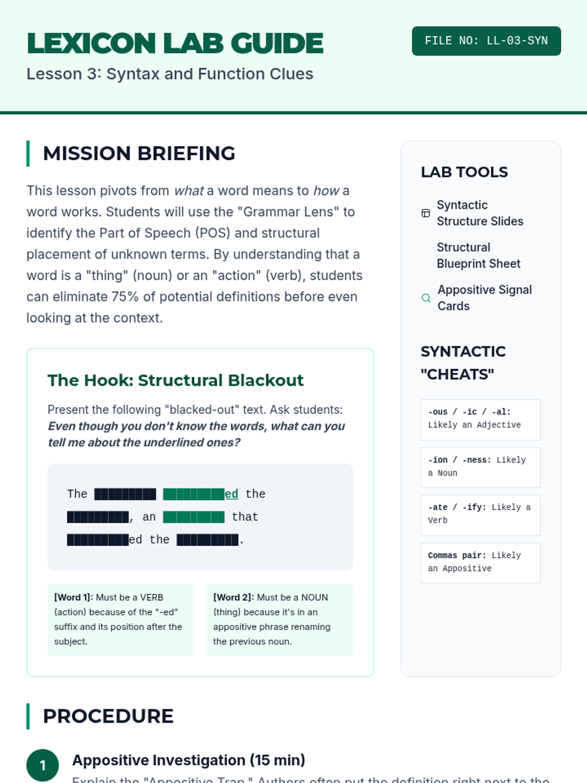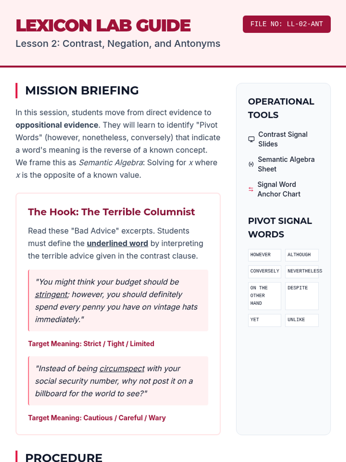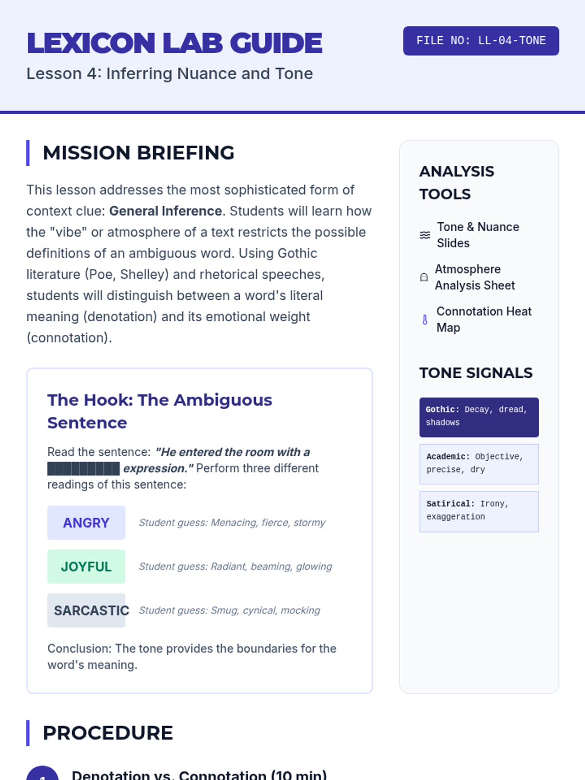 A comprehensive 10th-grade sequence that moves from basic synonym identification to advanced analytical strategies for decoding high-lexile vocabulary. Students use the IDEAS framework, syntactic analysis, and tonal inference to master the skill of determining word meaning in complex texts.
