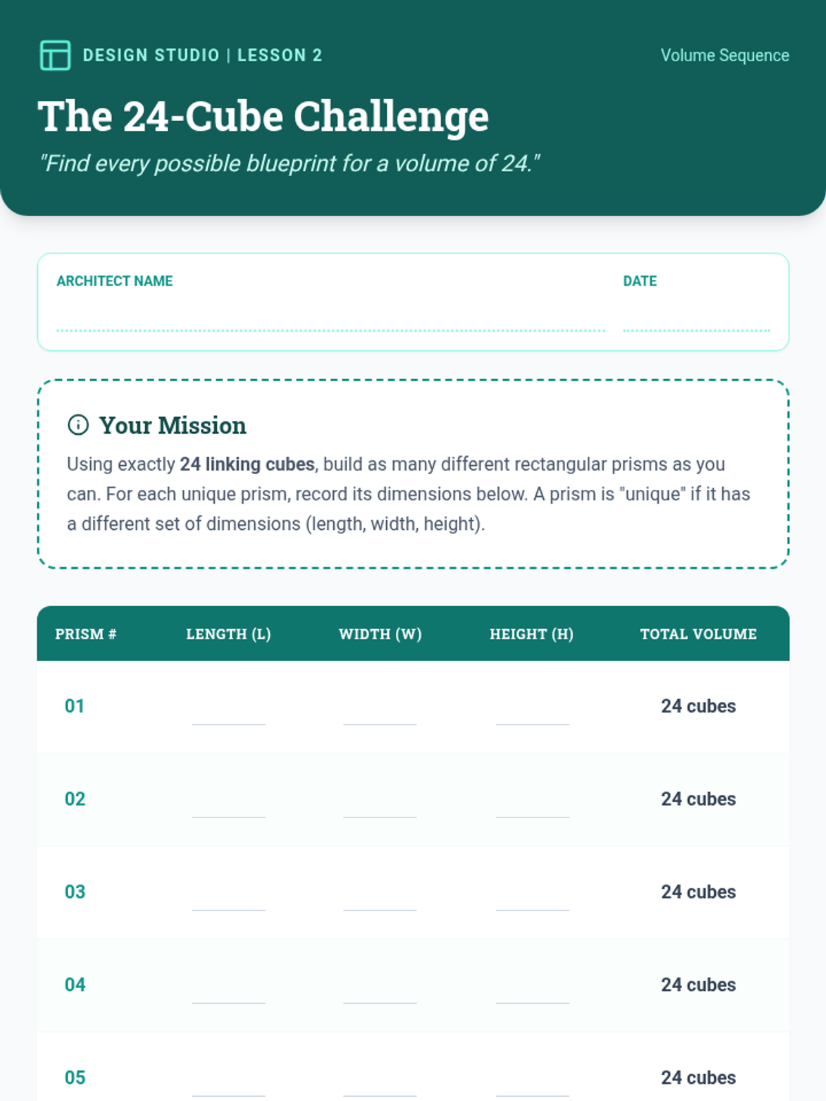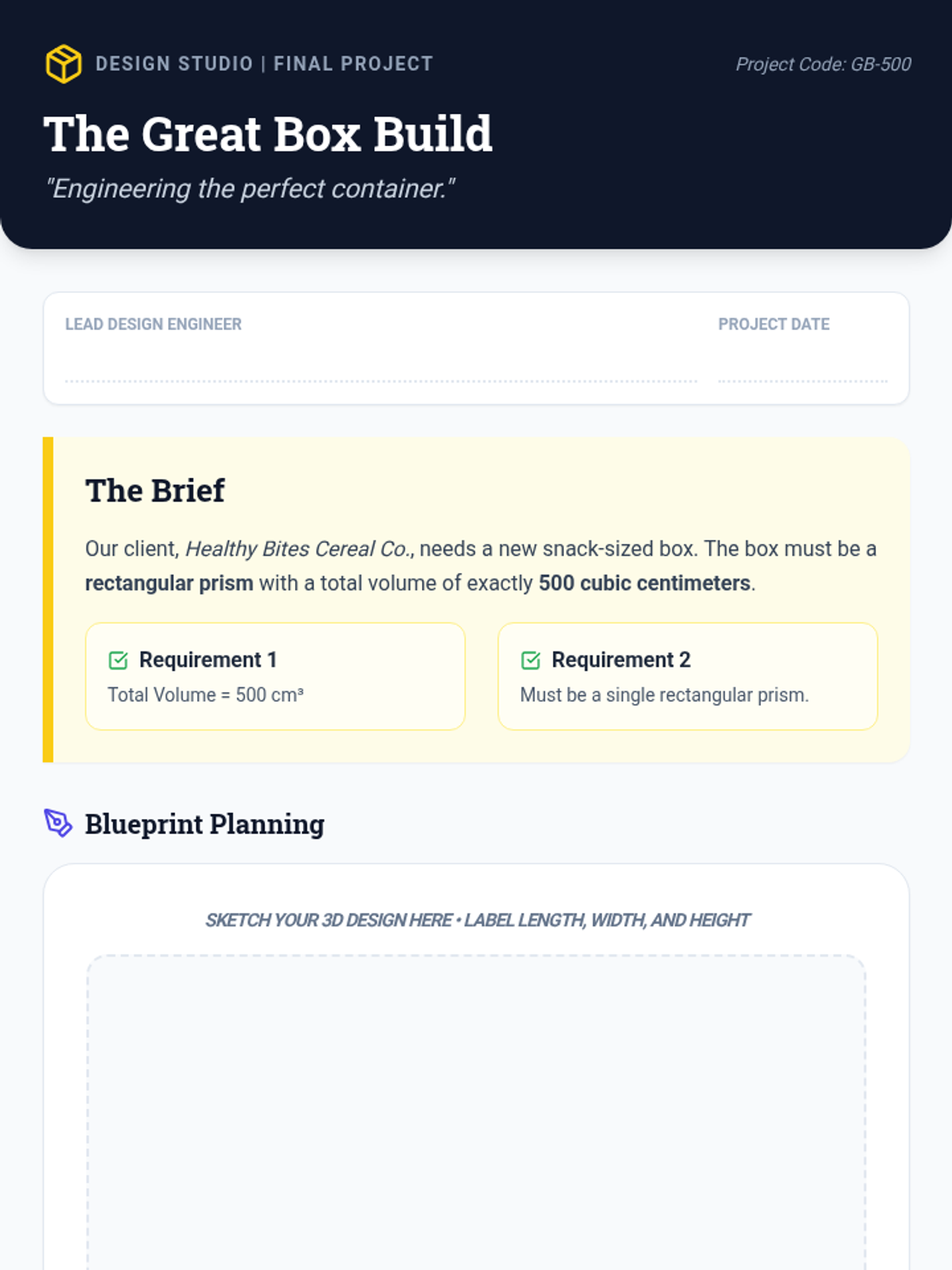 A project-based unit where 5th-grade students transition from 2D shapes to 3D figures, acting as packaging engineers to explore volume, structural properties, and the volume formula.