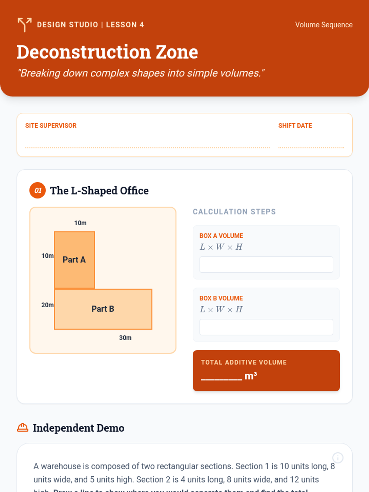 A four-day intensive unit on decomposing rectilinear figures to find total area, progressing from basic strategies to complex real-world architectural challenges. Students act as 'Blueprint Builders' to master vertical cuts, horizontal cuts, and additive/subtractive methods.