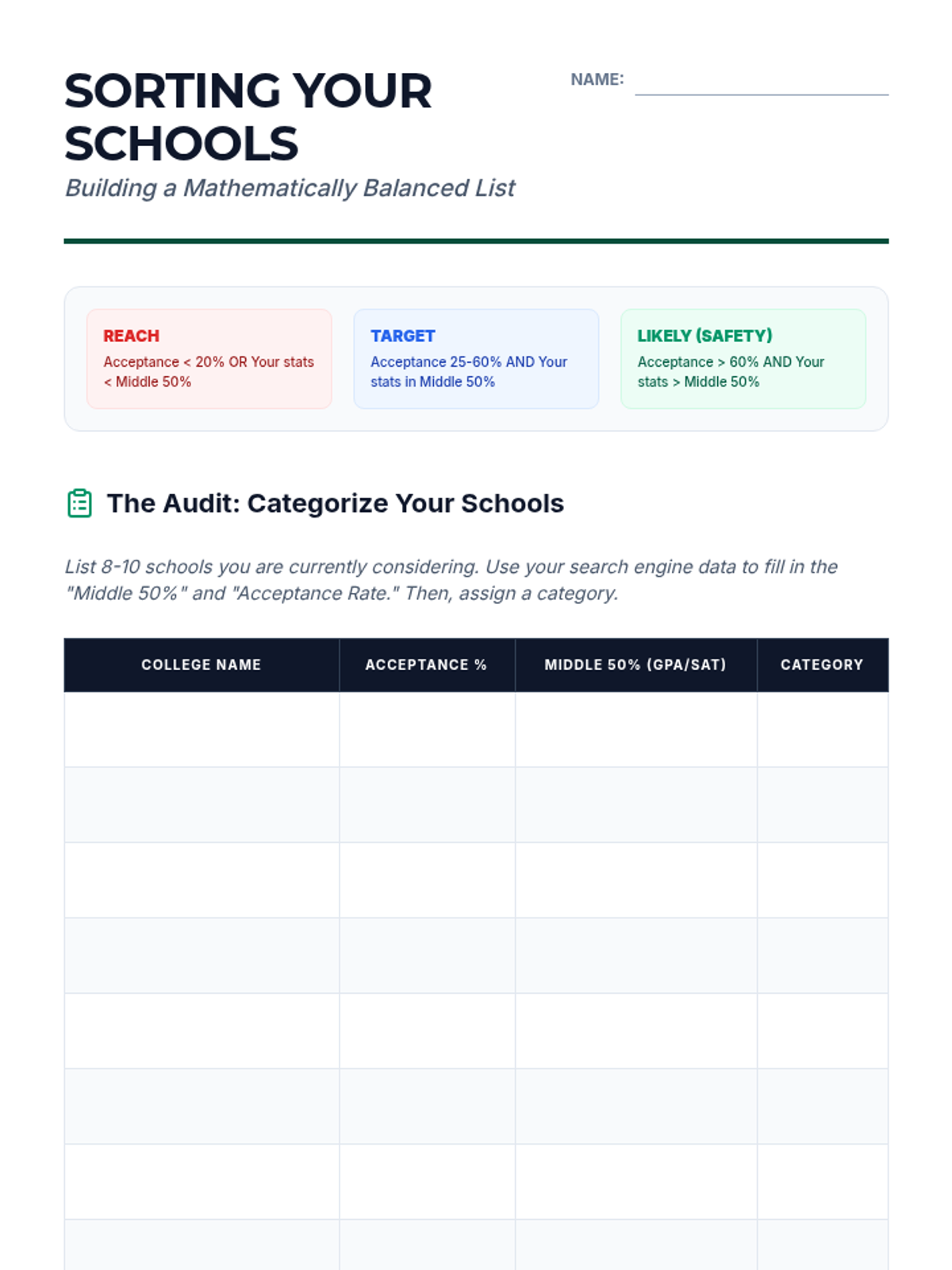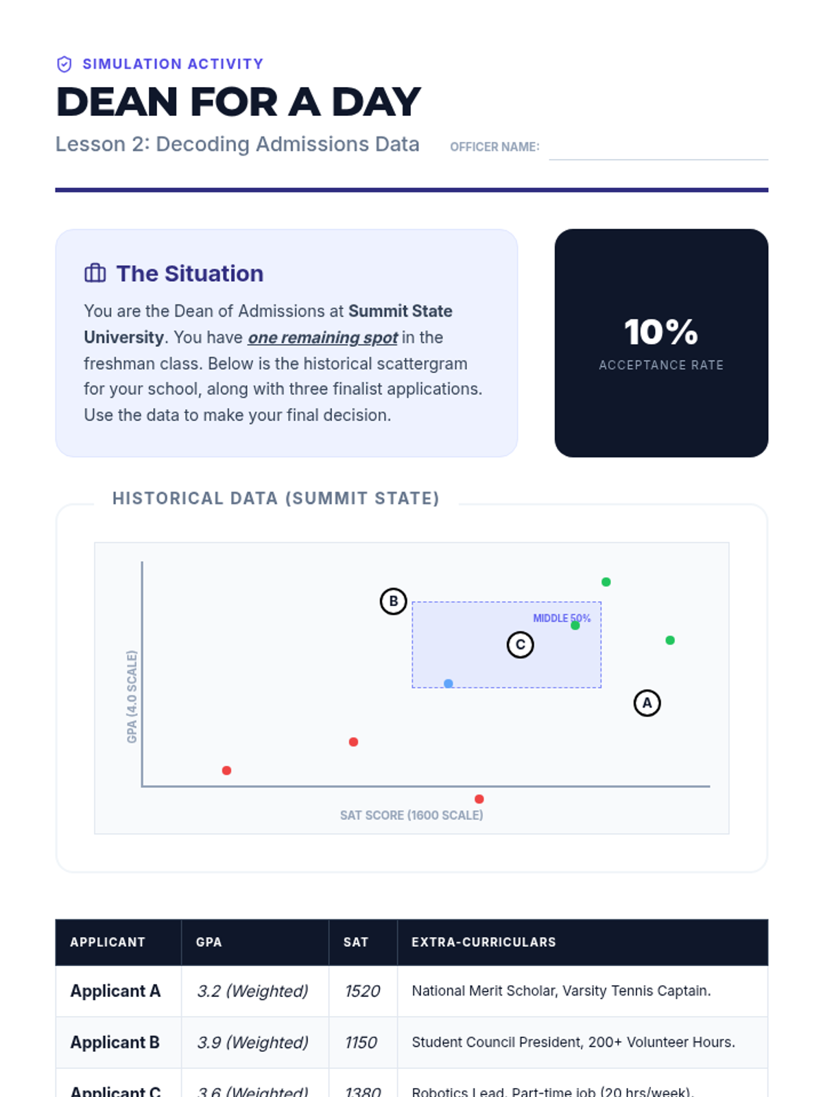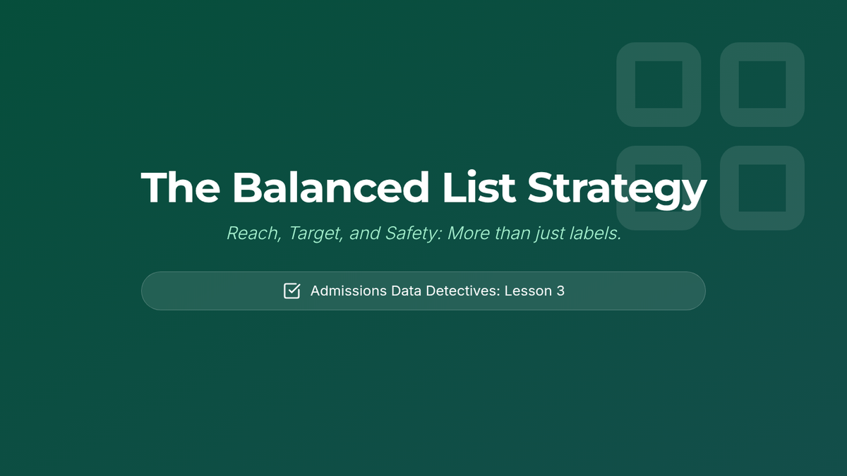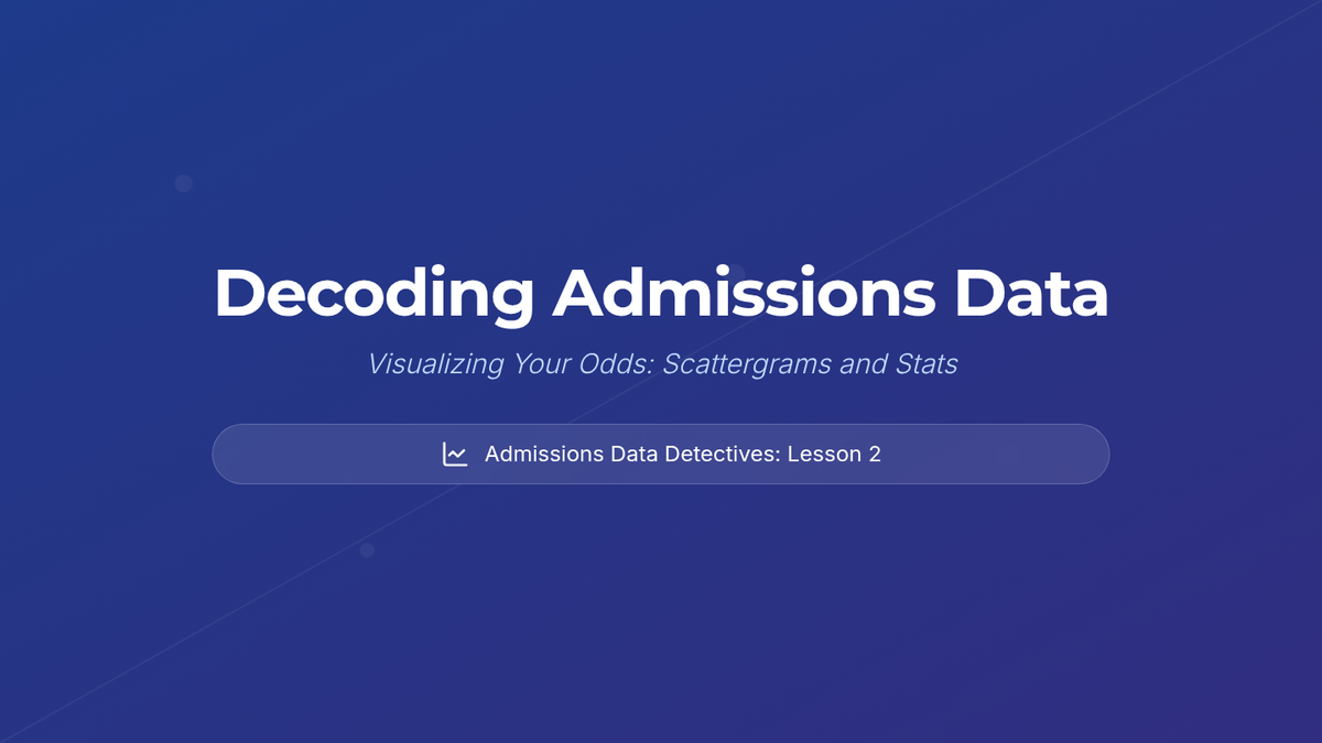 A data-centric sequence for 11th graders focusing on interpreting admissions statistics, scattergrams, and graduation rates to build a balanced college list of reach, target, and safety schools.