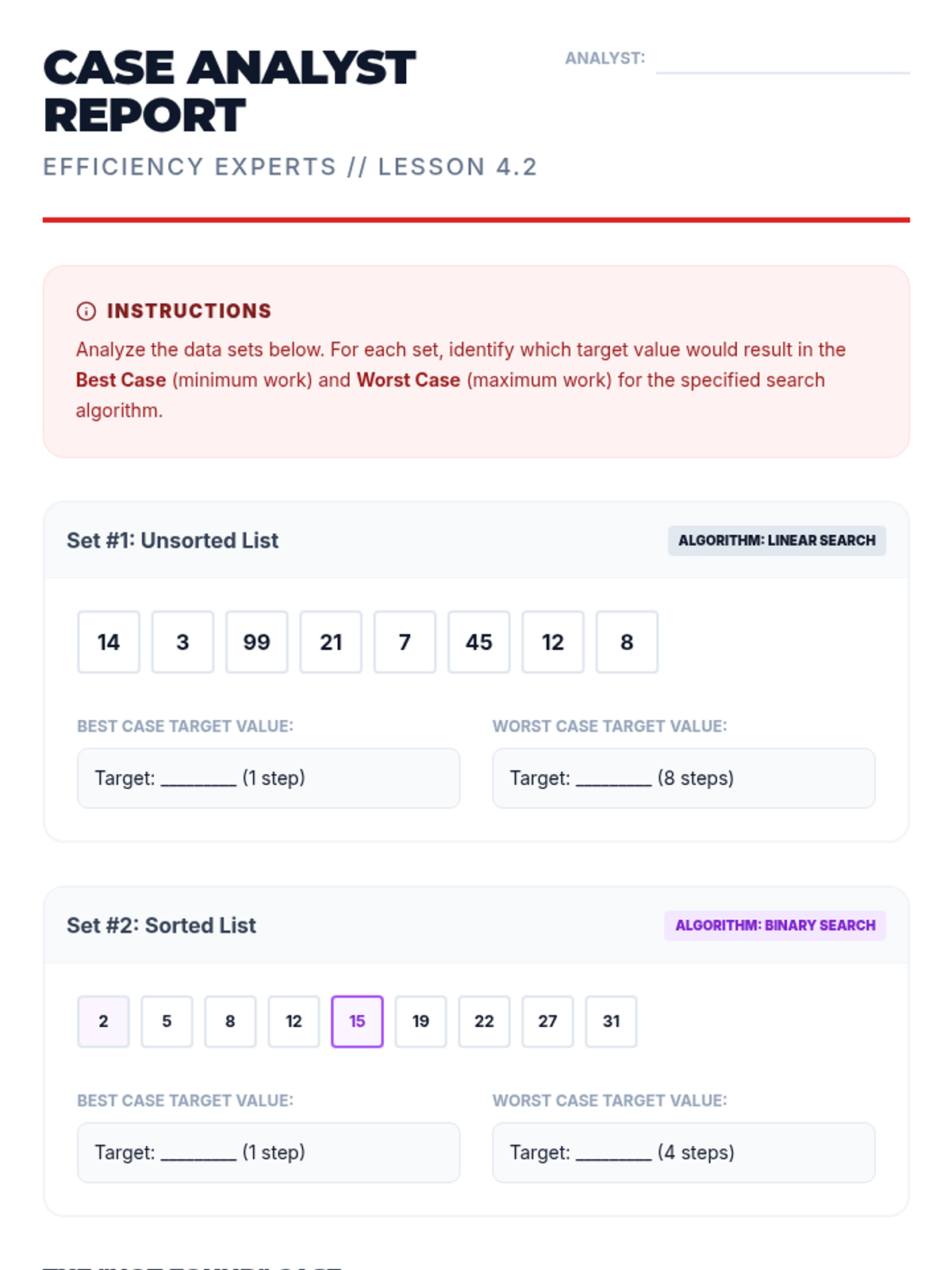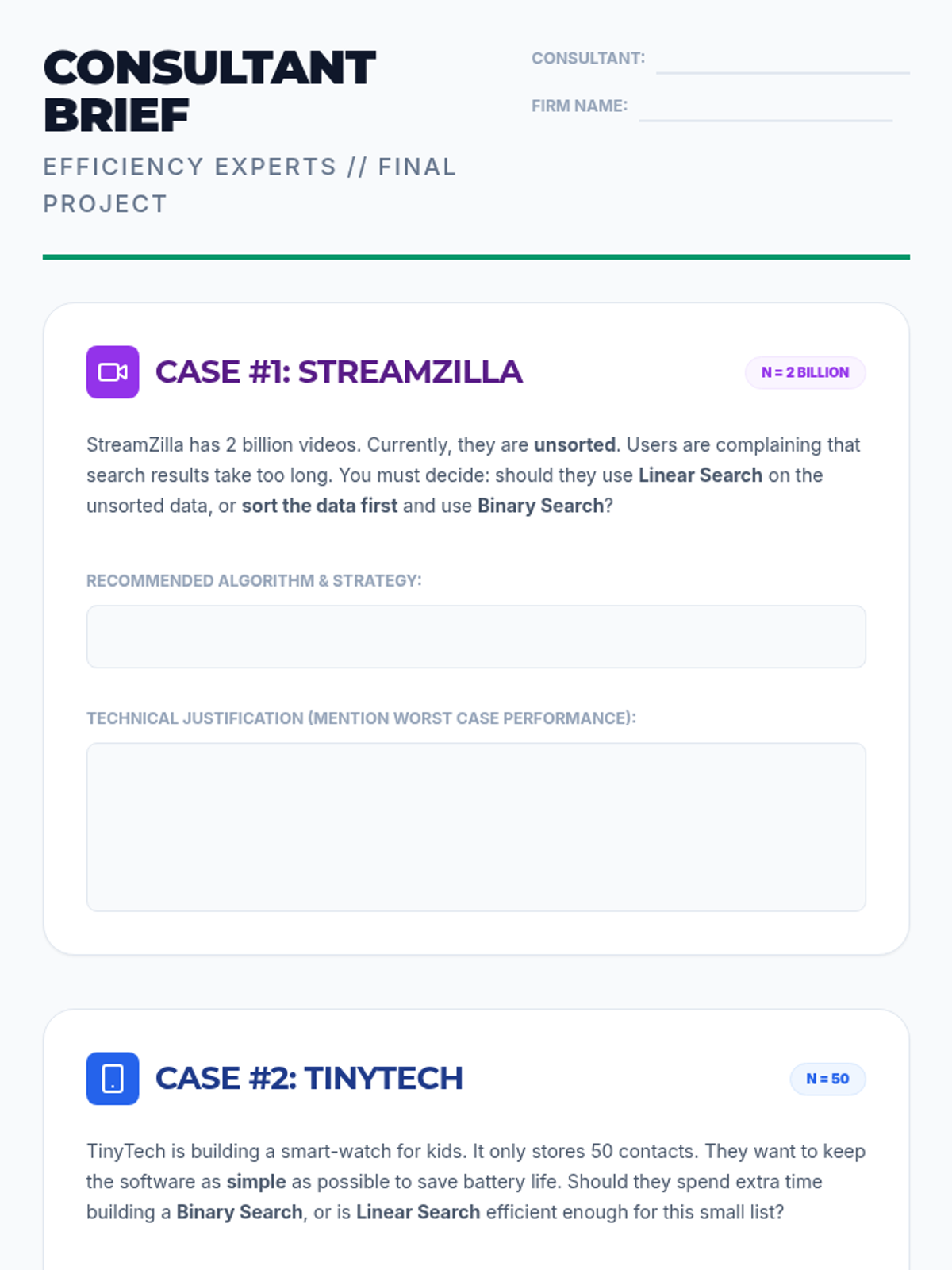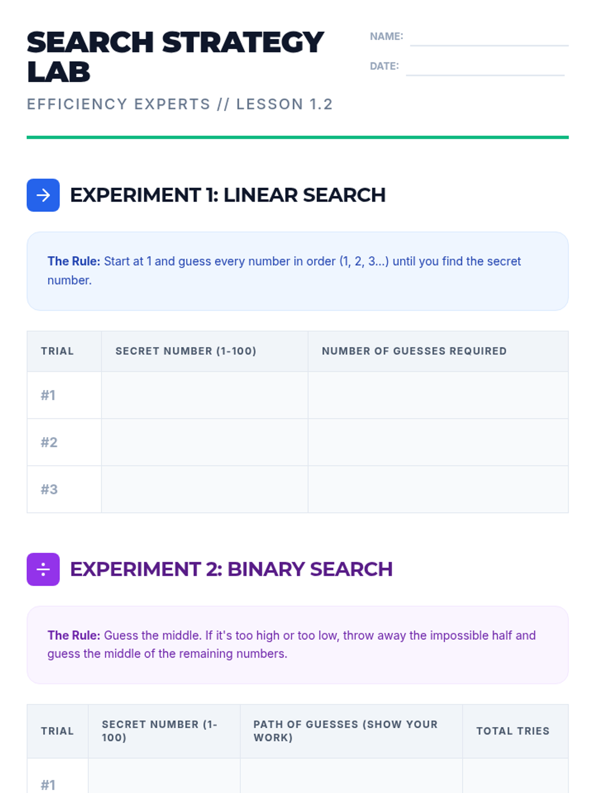 A 5-lesson sequence for 6th graders exploring algorithmic efficiency, search methods, and computational thinking through hands-on games, data visualization, and scenario analysis.