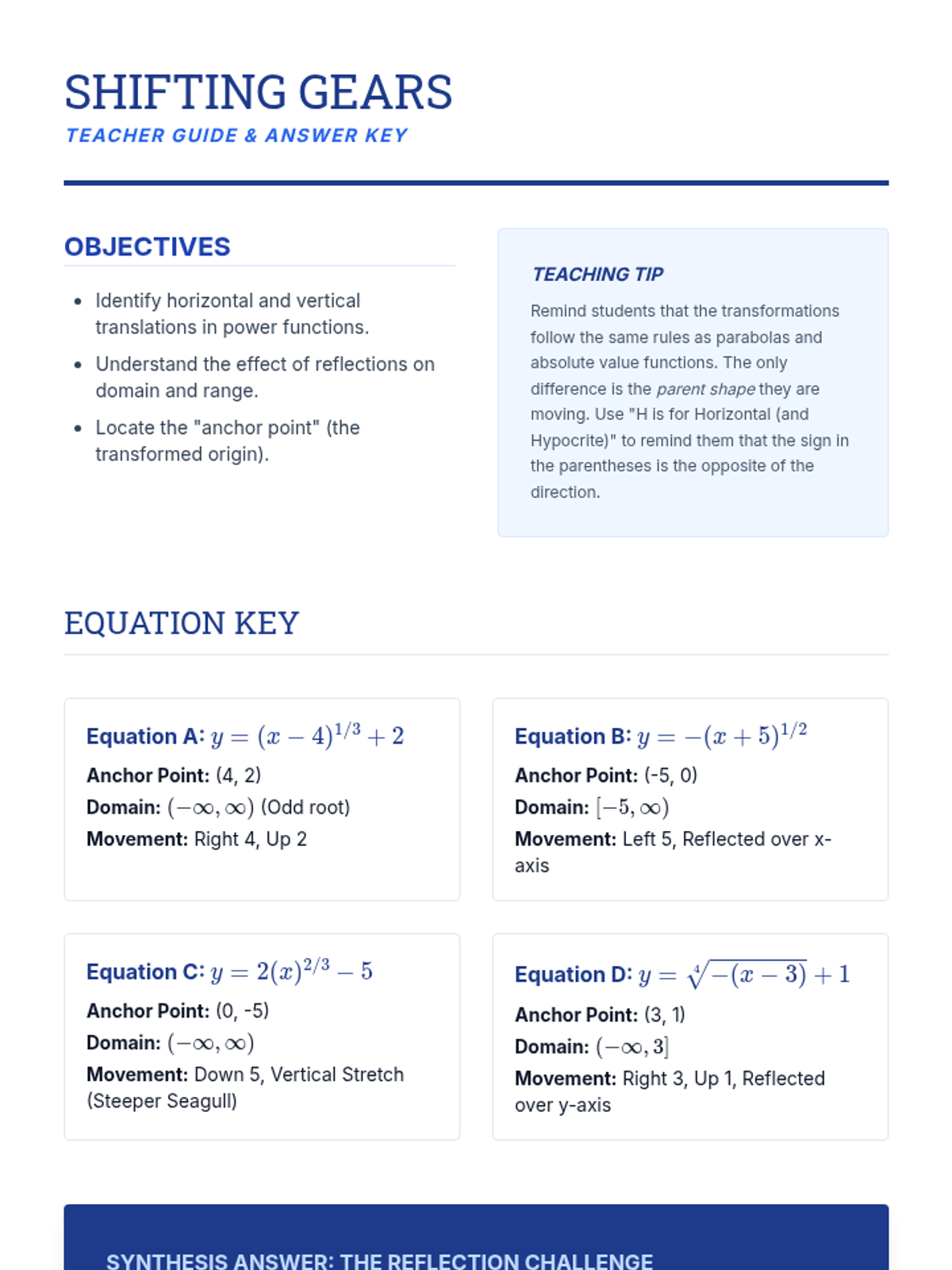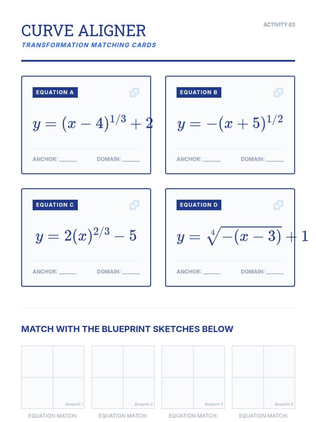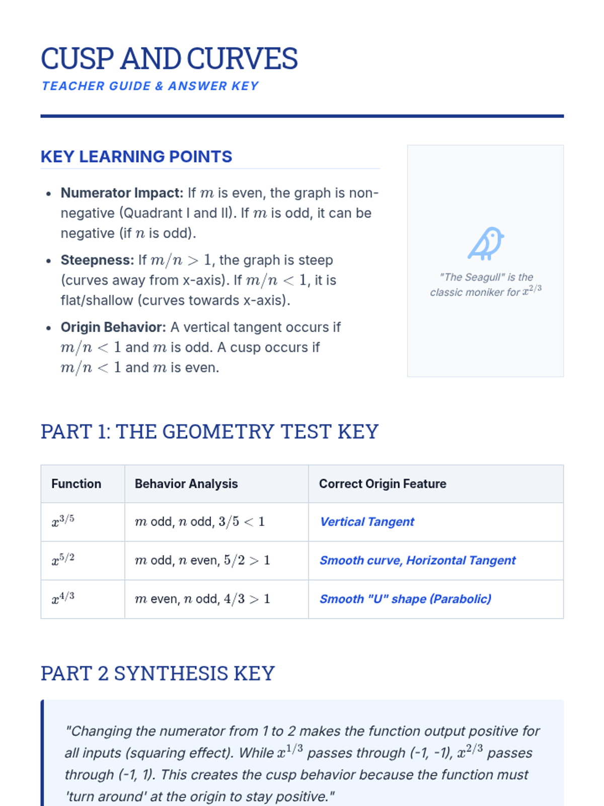 This sequence explores the relationship between rational exponents and the geometric behavior of power functions. Students analyze how numerators and denominators dictate domain, range, shape, and growth rates through inquiry and visual sketching.