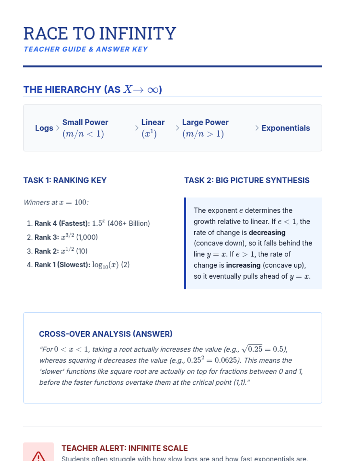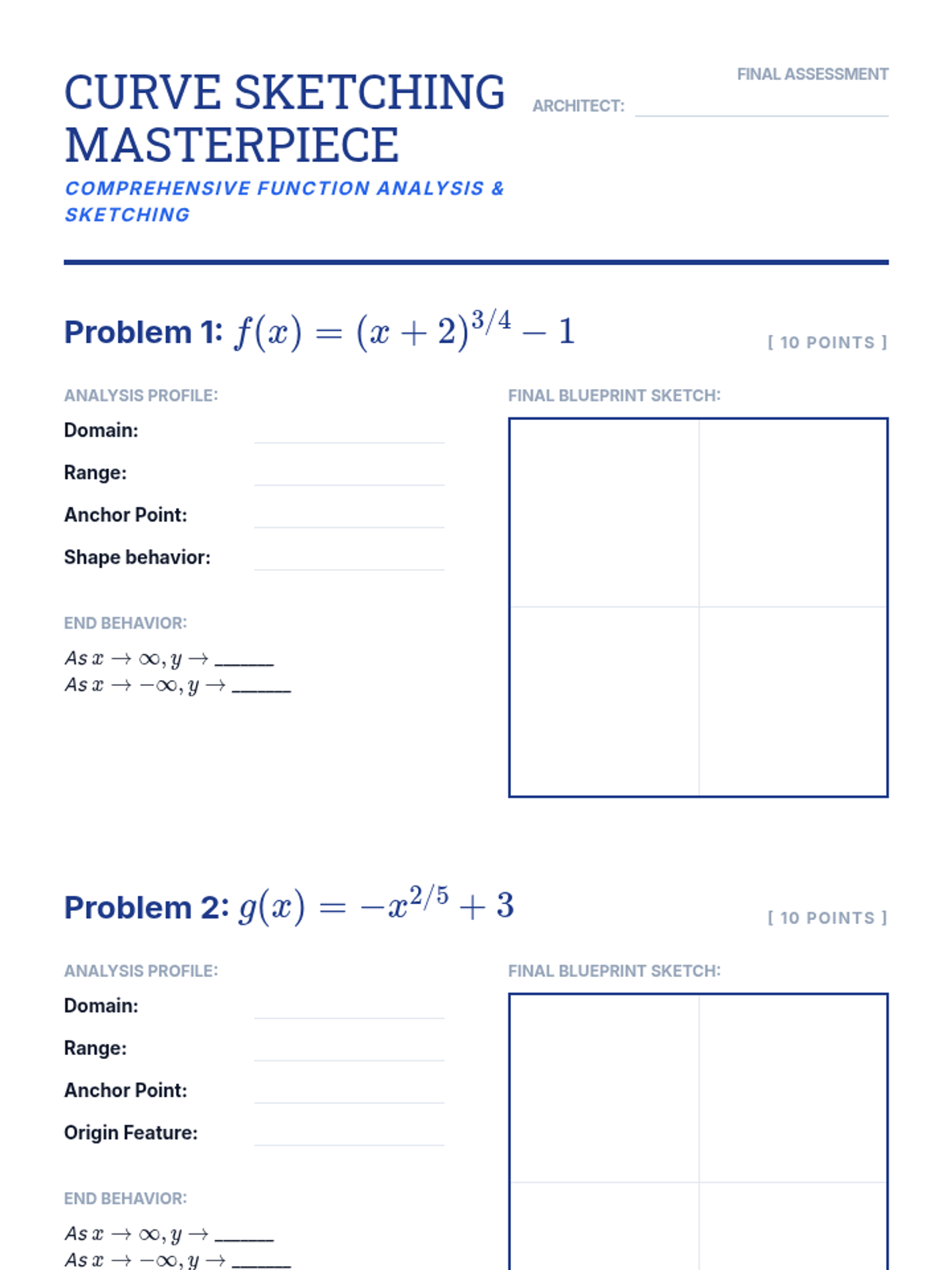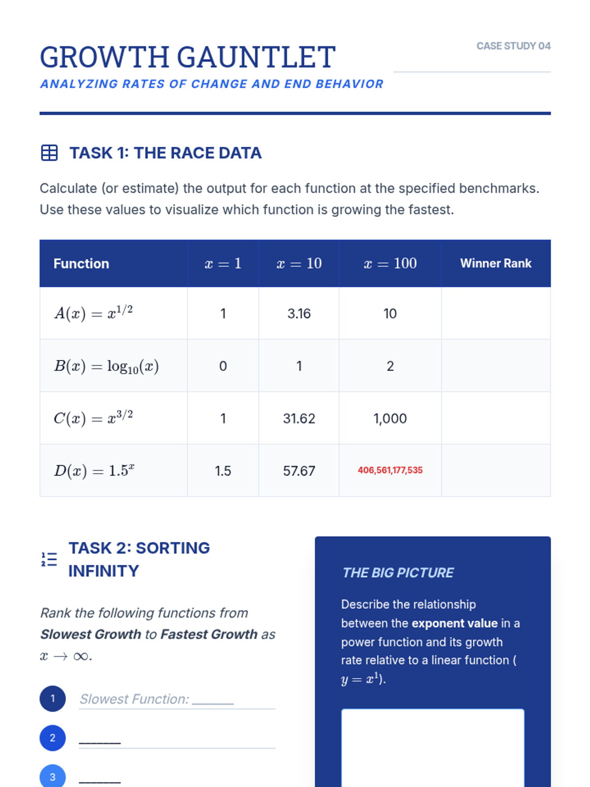This sequence explores the relationship between rational exponents and the geometric behavior of power functions. Students analyze how numerators and denominators dictate domain, range, shape, and growth rates through inquiry and visual sketching.