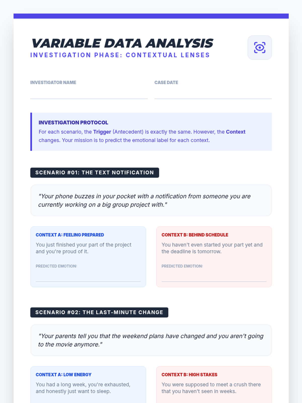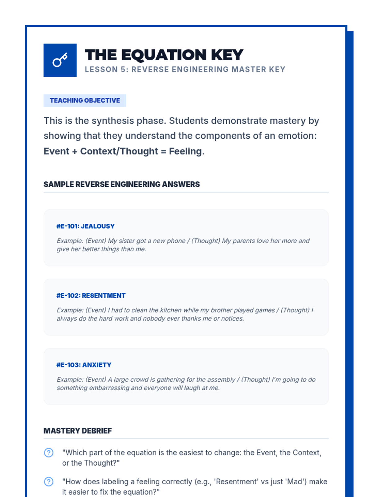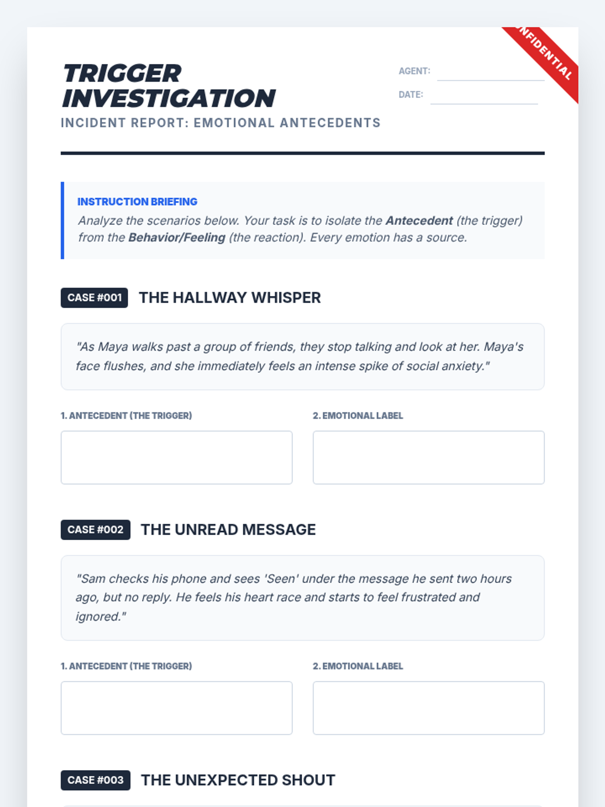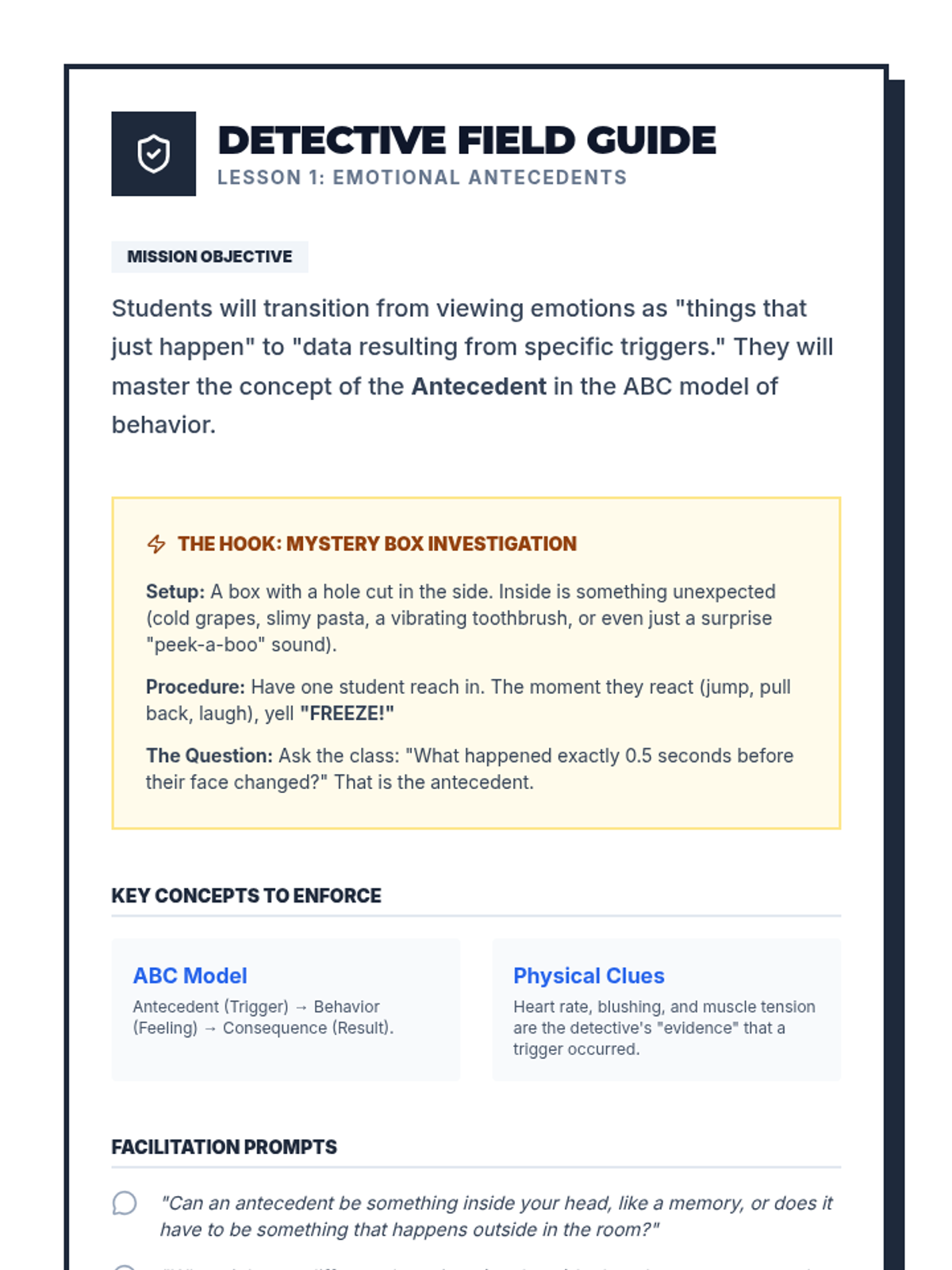 This sequence treats emotions as data to be investigated through an analytical lens. Students apply the ABC model (Antecedent-Behavior-Consequence) to emotions, exploring how triggers, context, and thoughts interact to create complex emotional experiences.