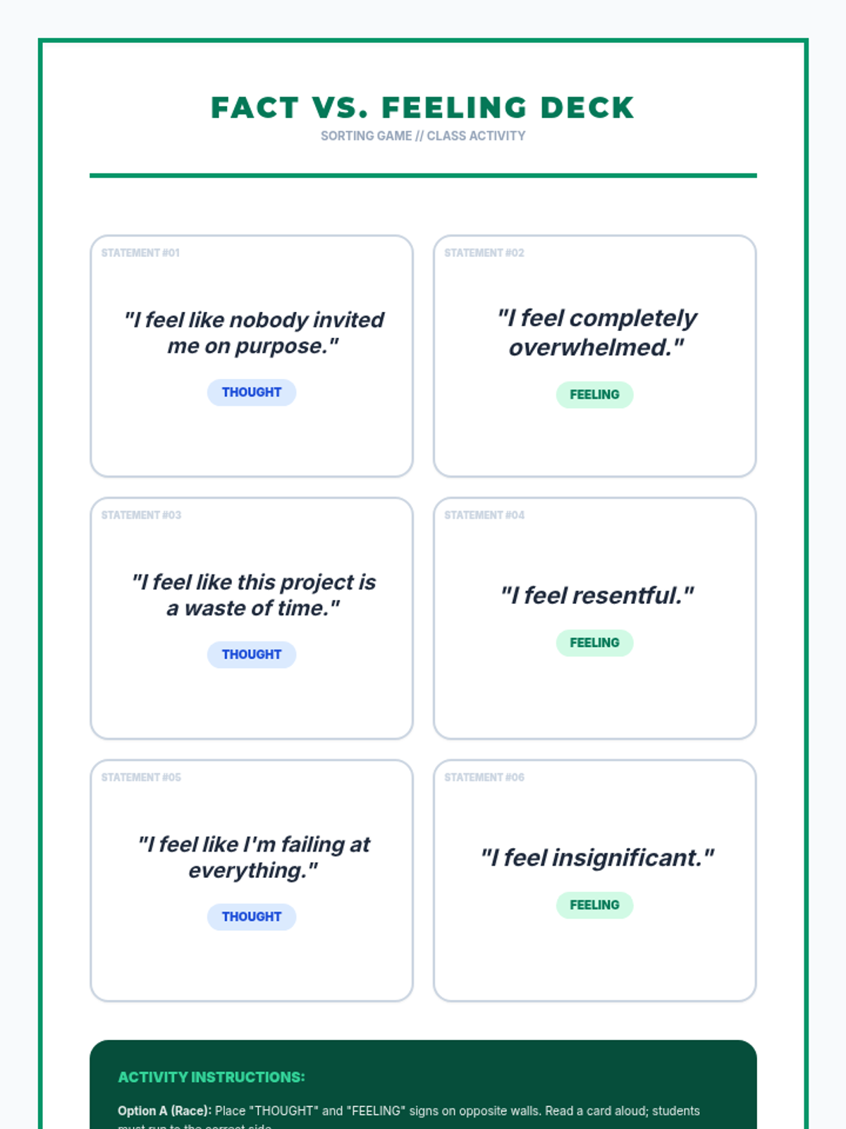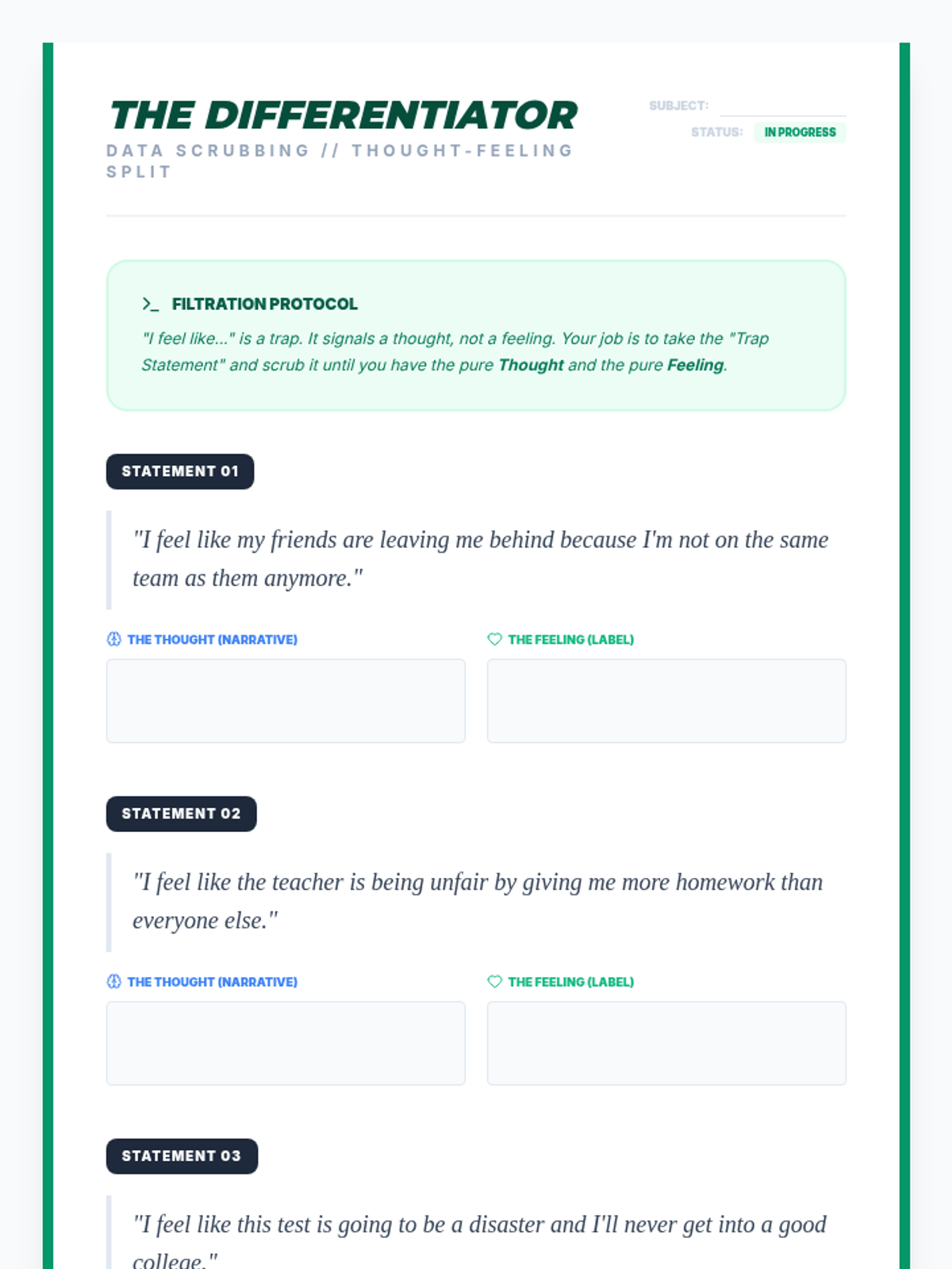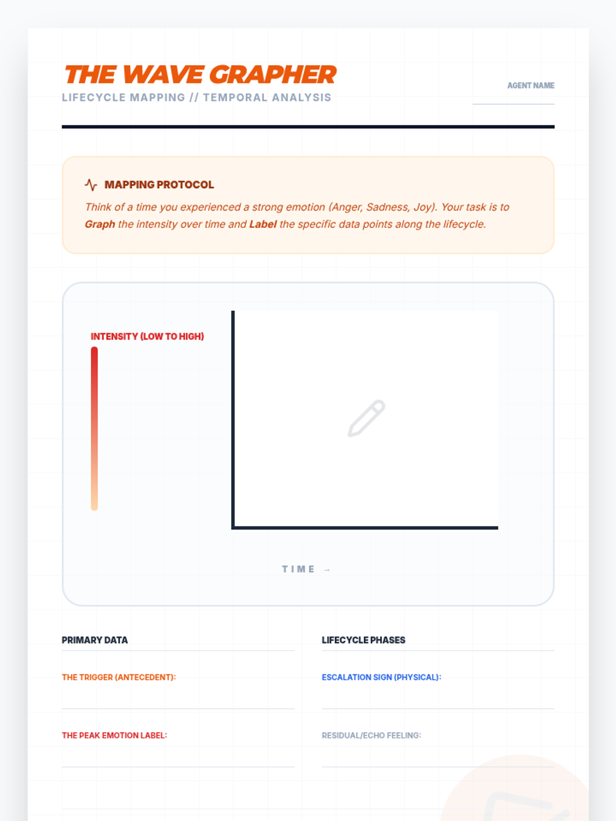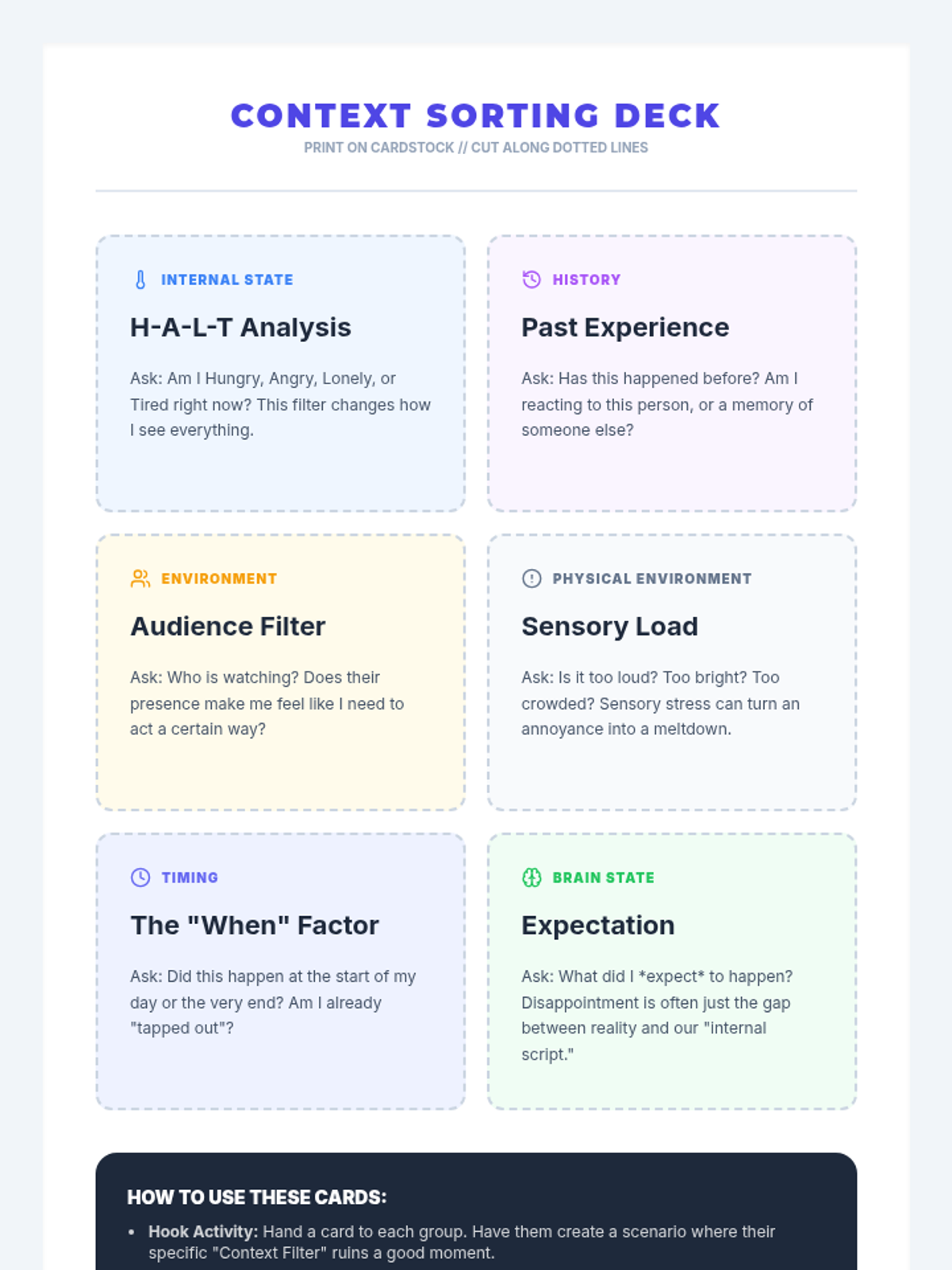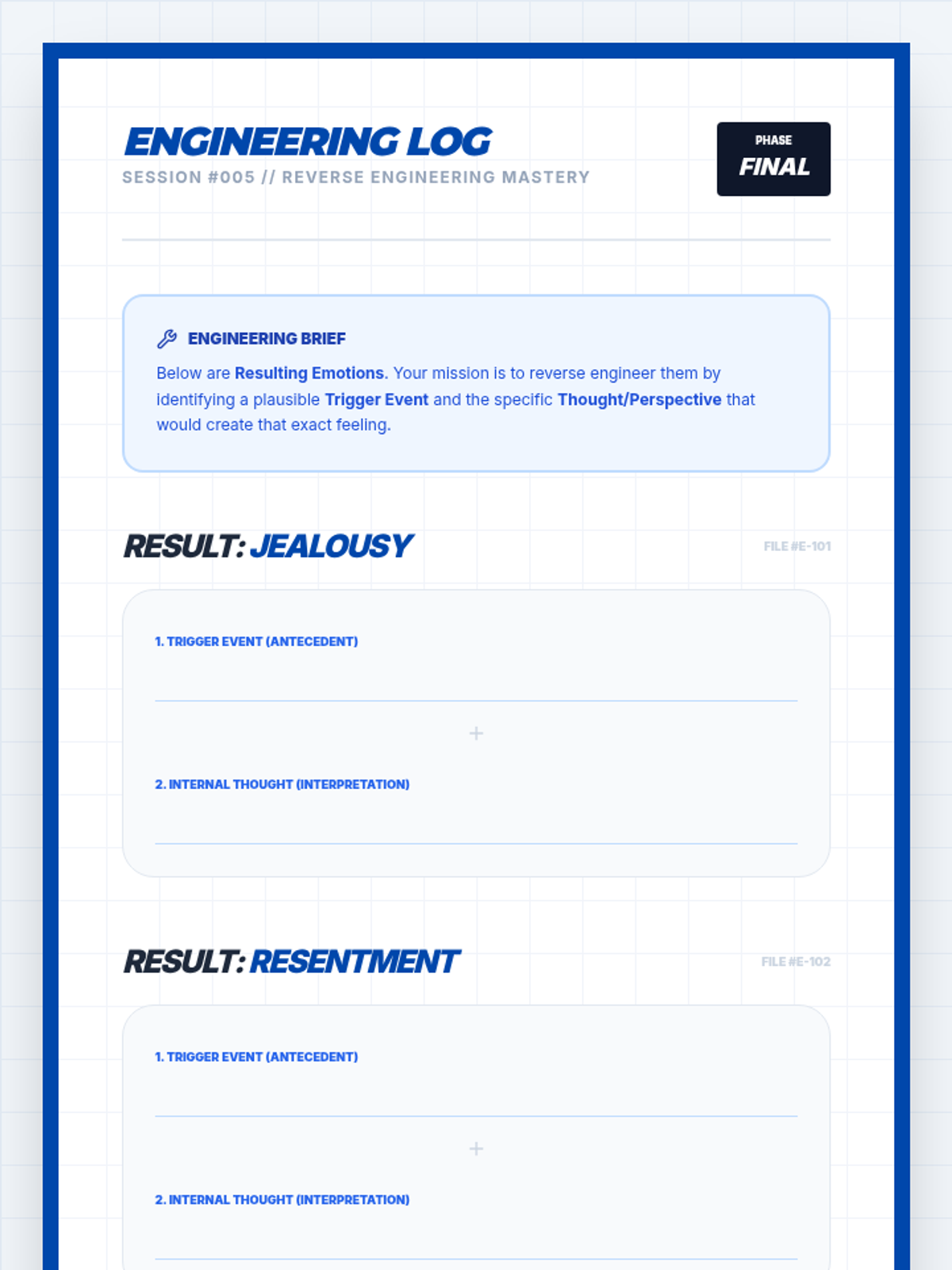 This sequence treats emotions as data to be investigated through an analytical lens. Students apply the ABC model (Antecedent-Behavior-Consequence) to emotions, exploring how triggers, context, and thoughts interact to create complex emotional experiences.