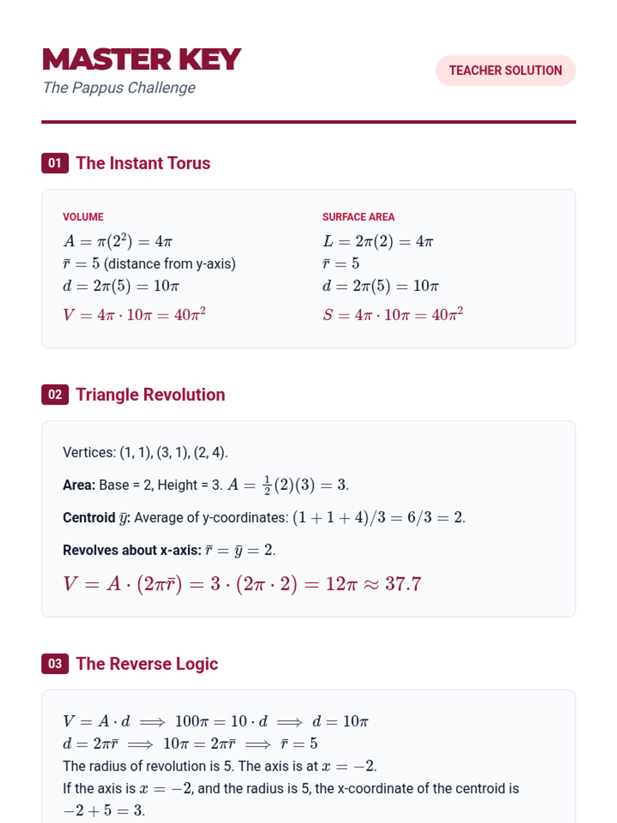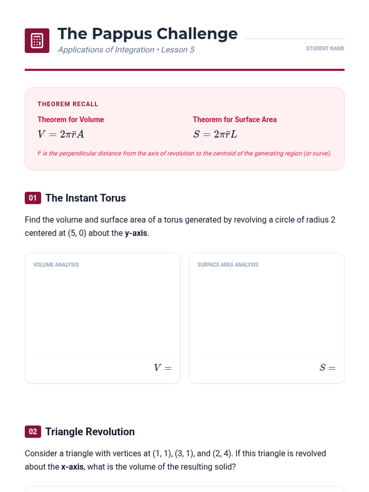 A comprehensive 11th Grade Calculus sequence covering applications of integration including arc length, surface area of revolution, centroids, and the theorems of Pappus. Students explore the geometric properties of curves and regions using analytical methods.