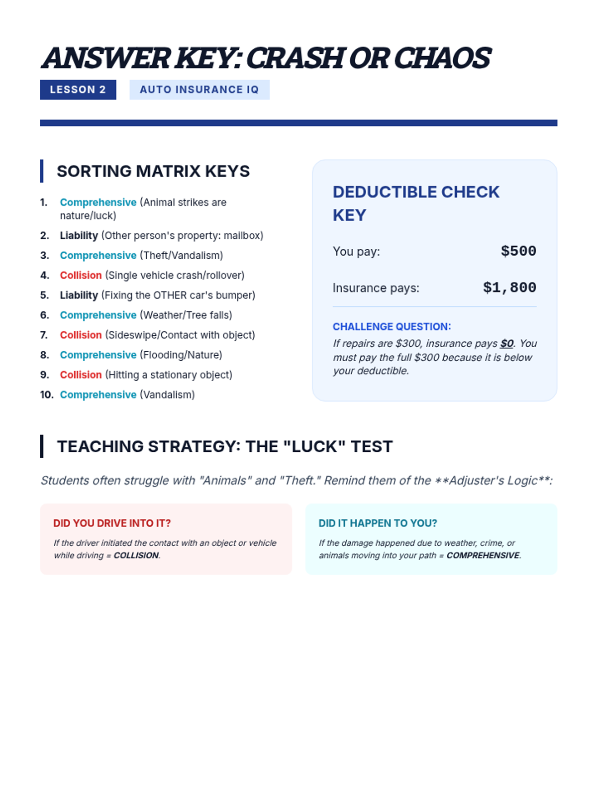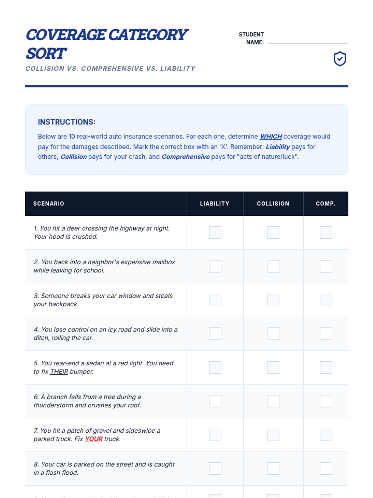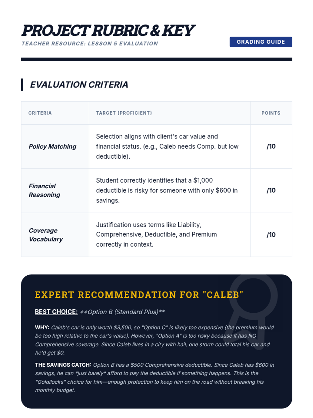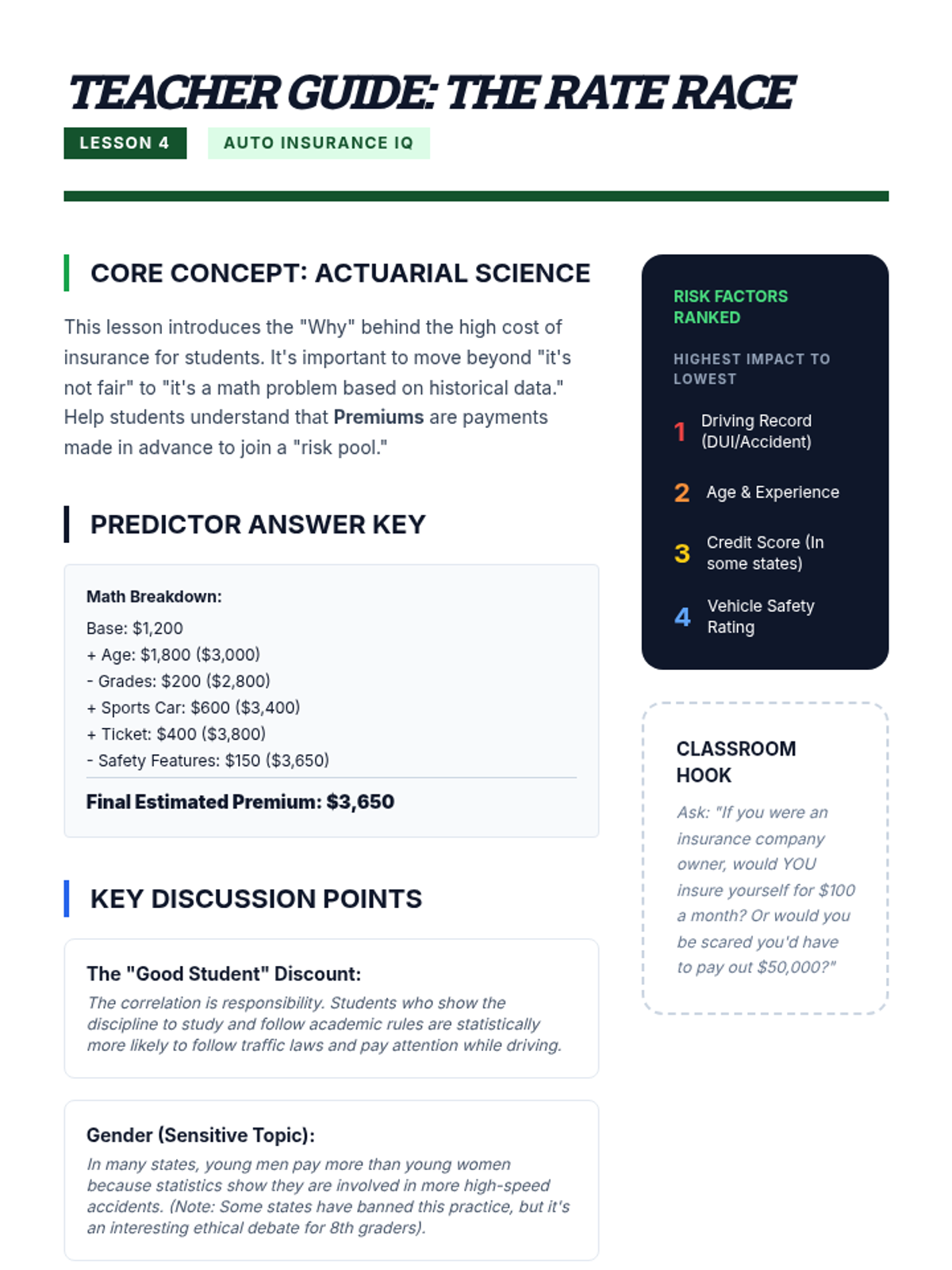 A comprehensive 5-lesson unit for 8th graders on auto insurance, covering liability, collision, comprehensive coverage, rate factors, and policy selection using real-world scenarios.