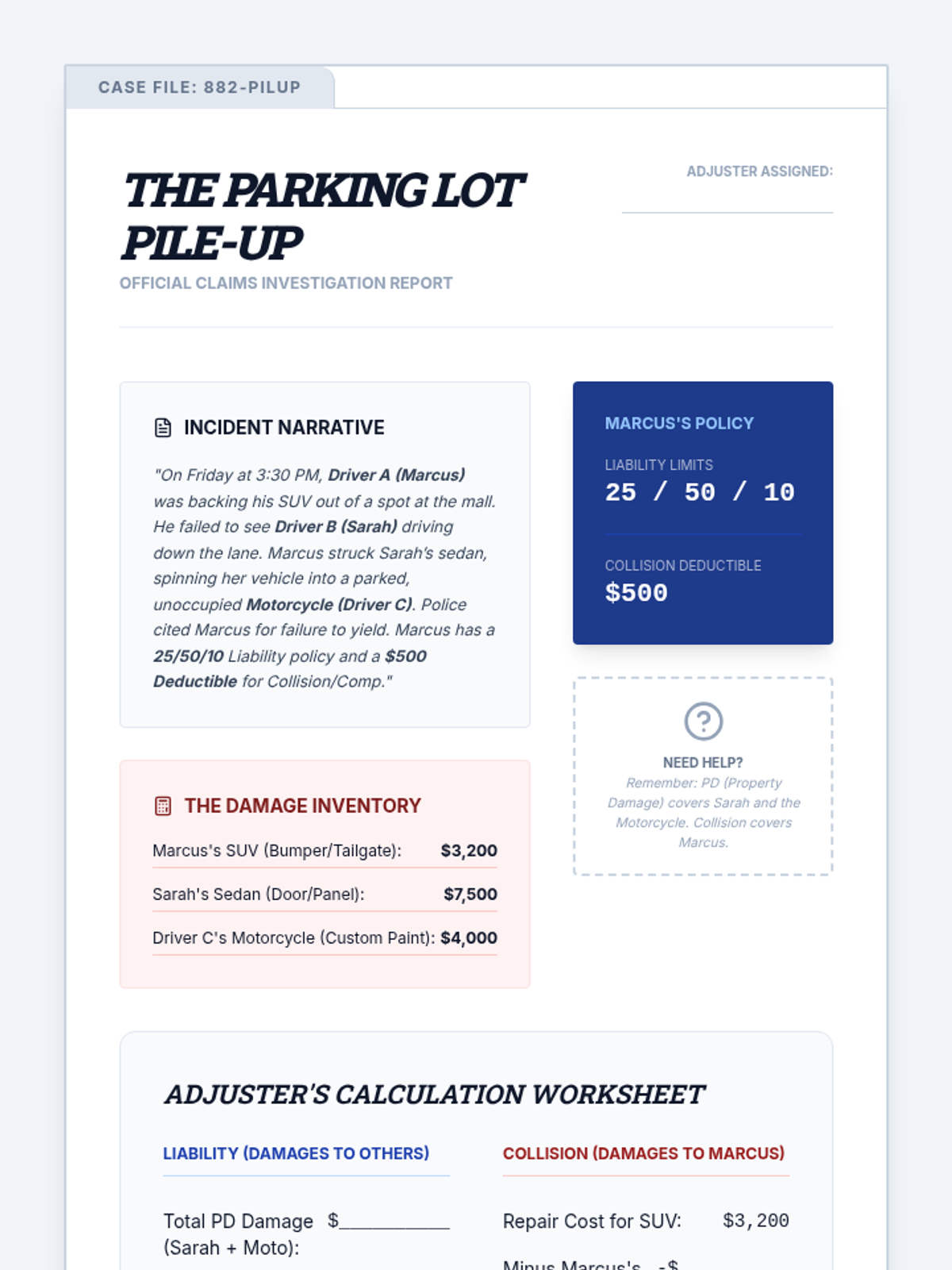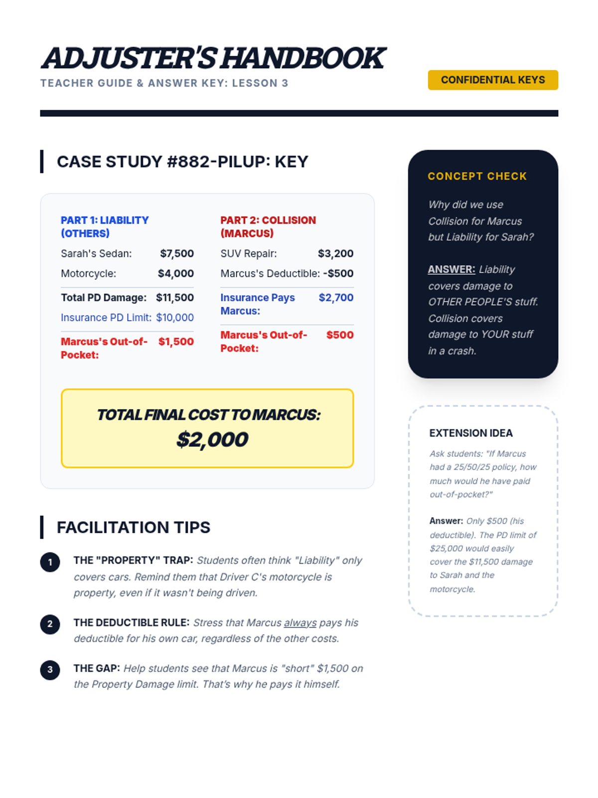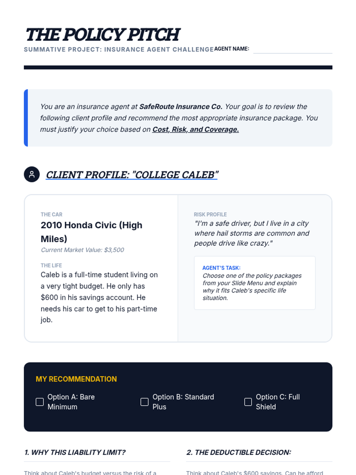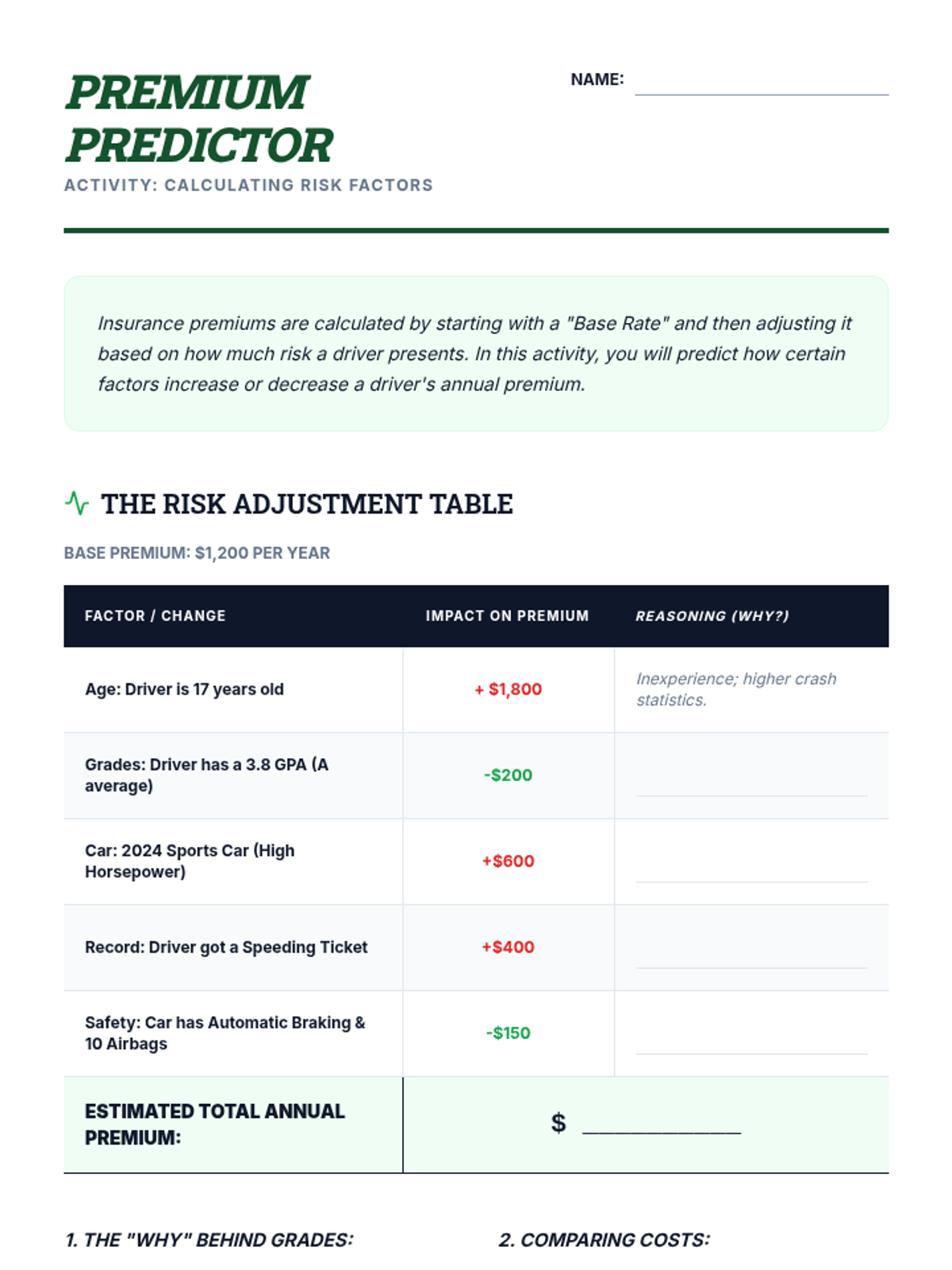 A comprehensive 5-lesson unit for 8th graders on auto insurance, covering liability, collision, comprehensive coverage, rate factors, and policy selection using real-world scenarios.