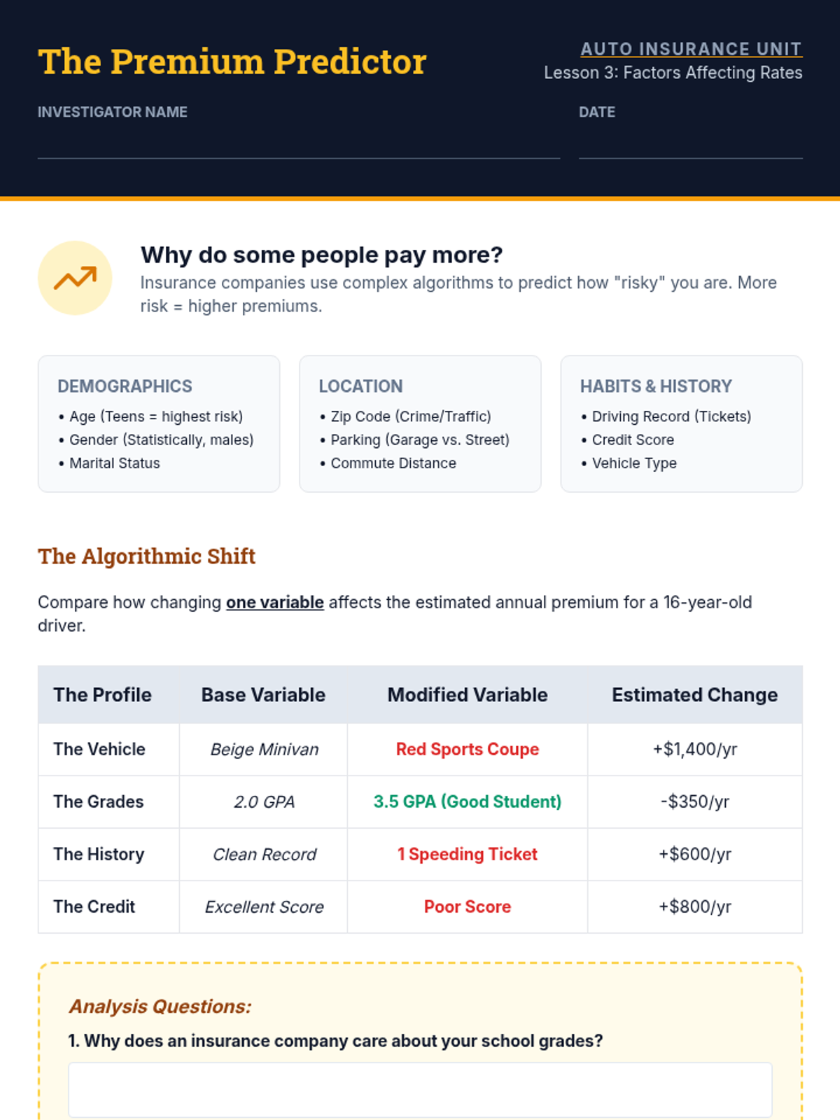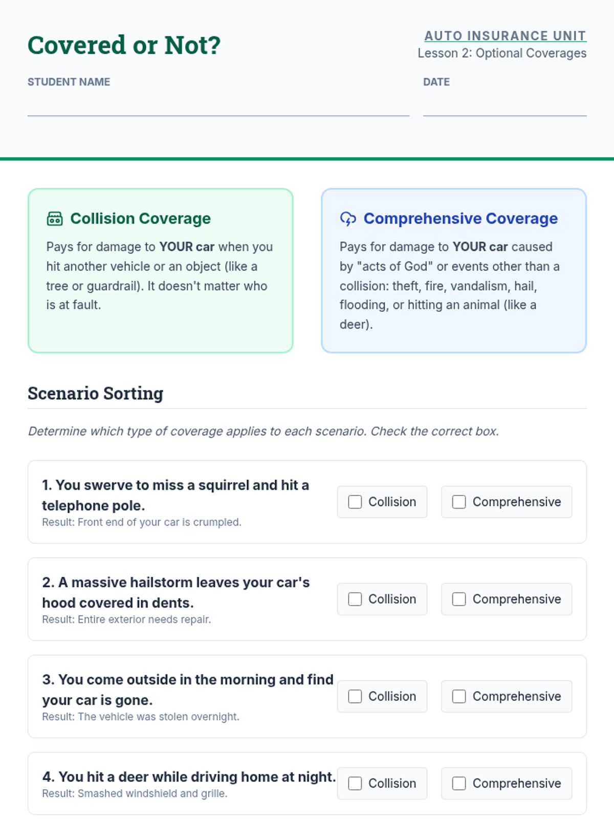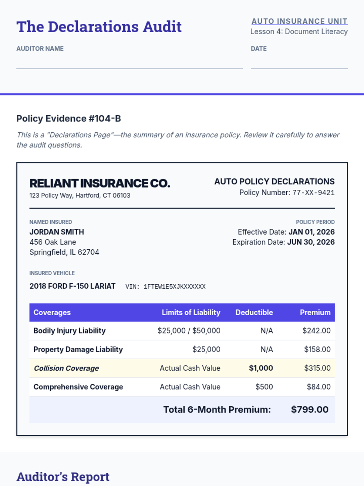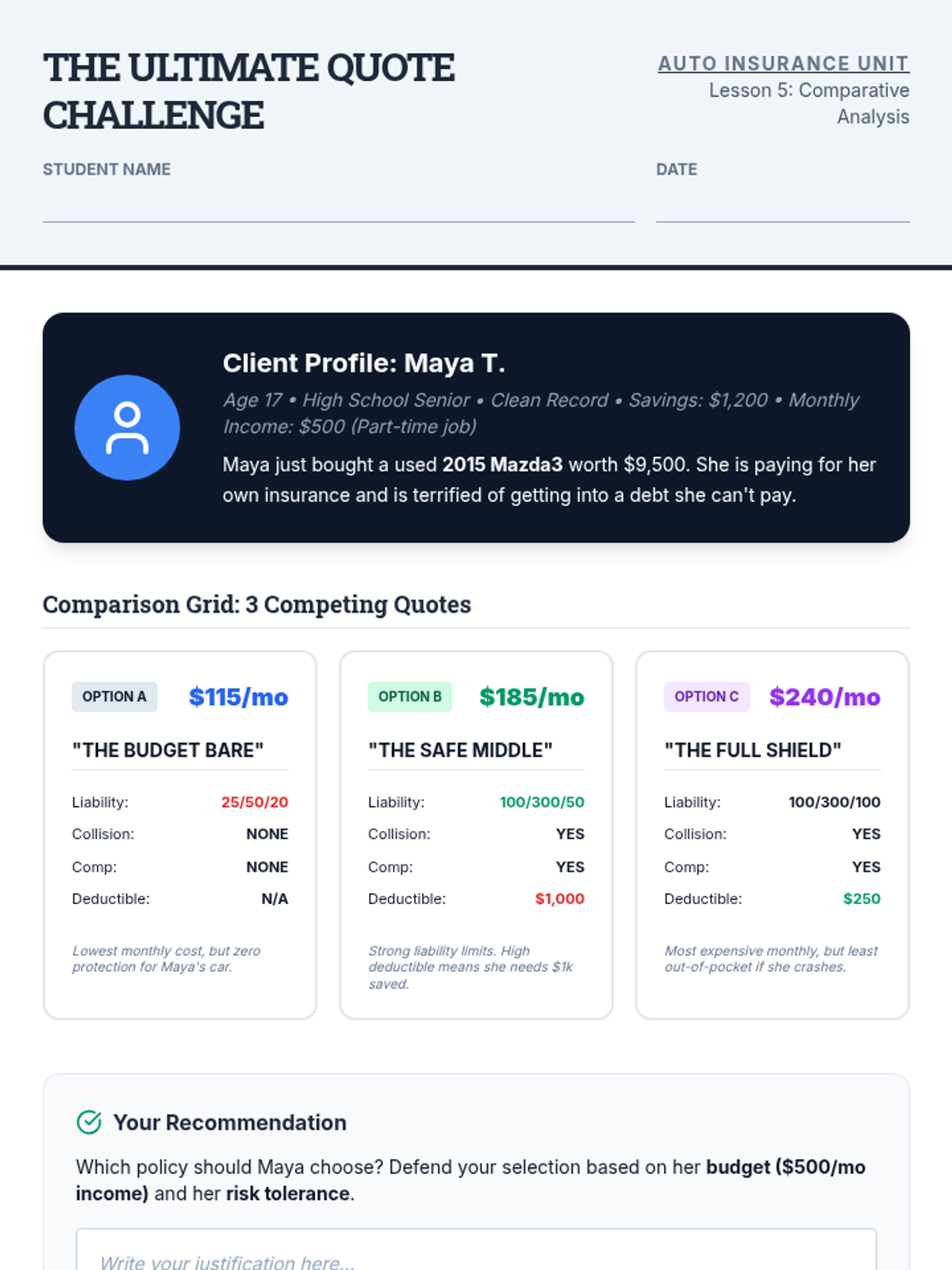 A comprehensive unit for 10th graders on auto insurance, covering liability limits, optional coverages, rate factors, policy reading, and quote comparison through real-world case studies and simulations.
