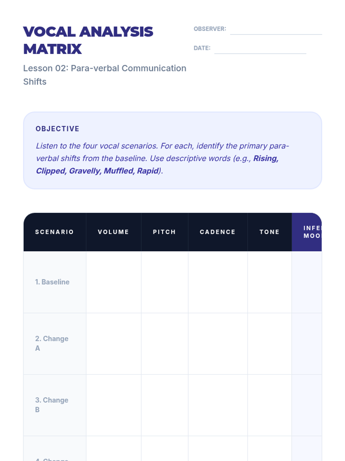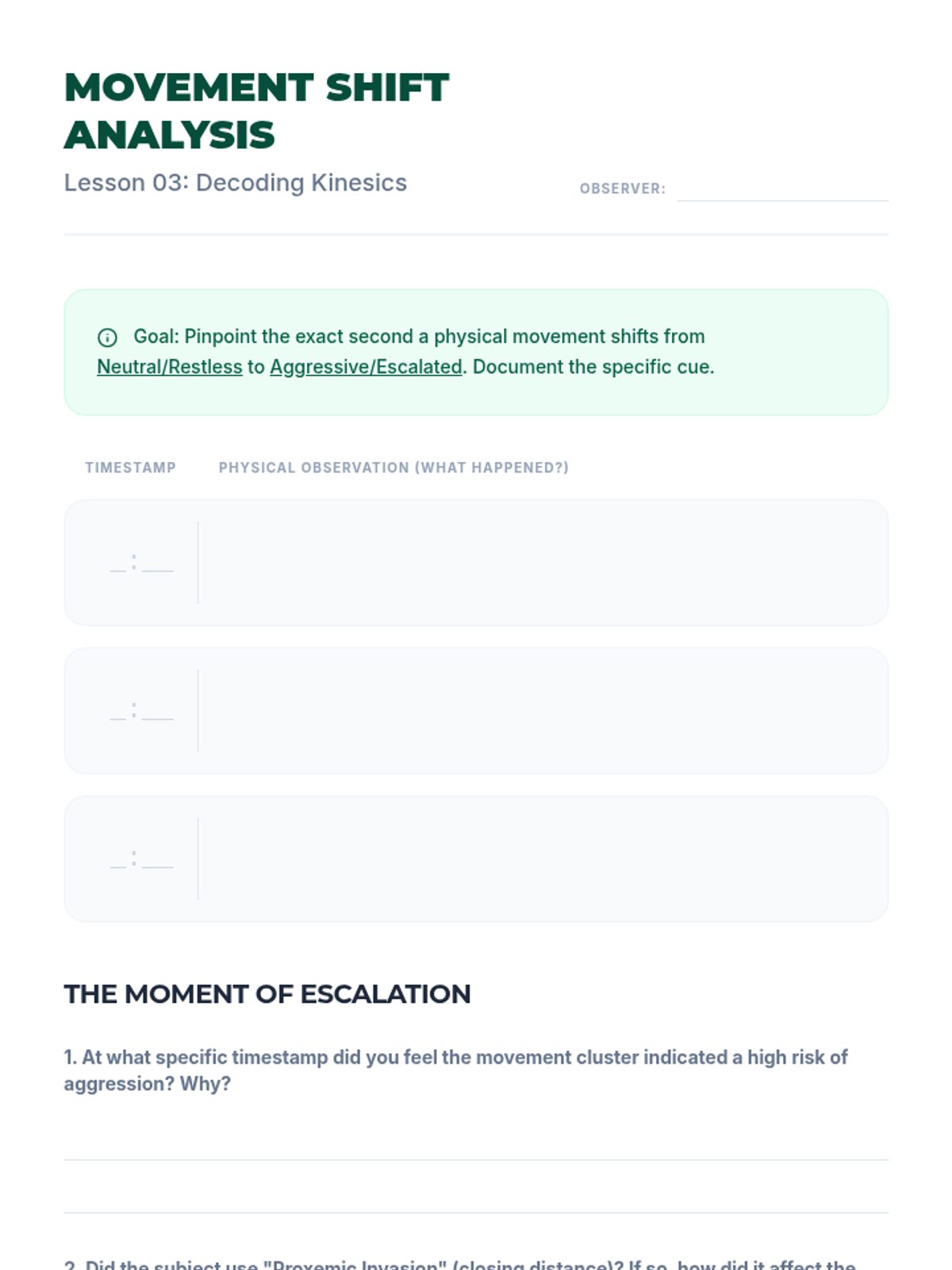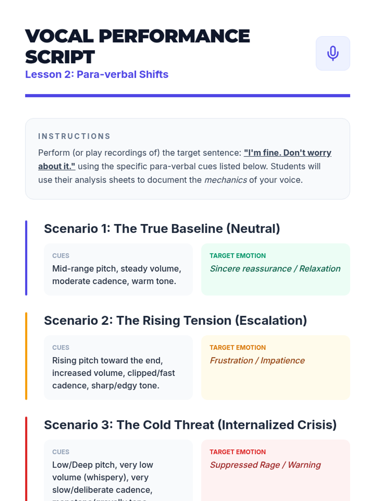 A comprehensive 5-lesson unit for 12th-grade students on identifying behavioral baselines and recognizing early warning signs of emotional escalation through analytical observation of verbal, para-verbal, and non-verbal cues.