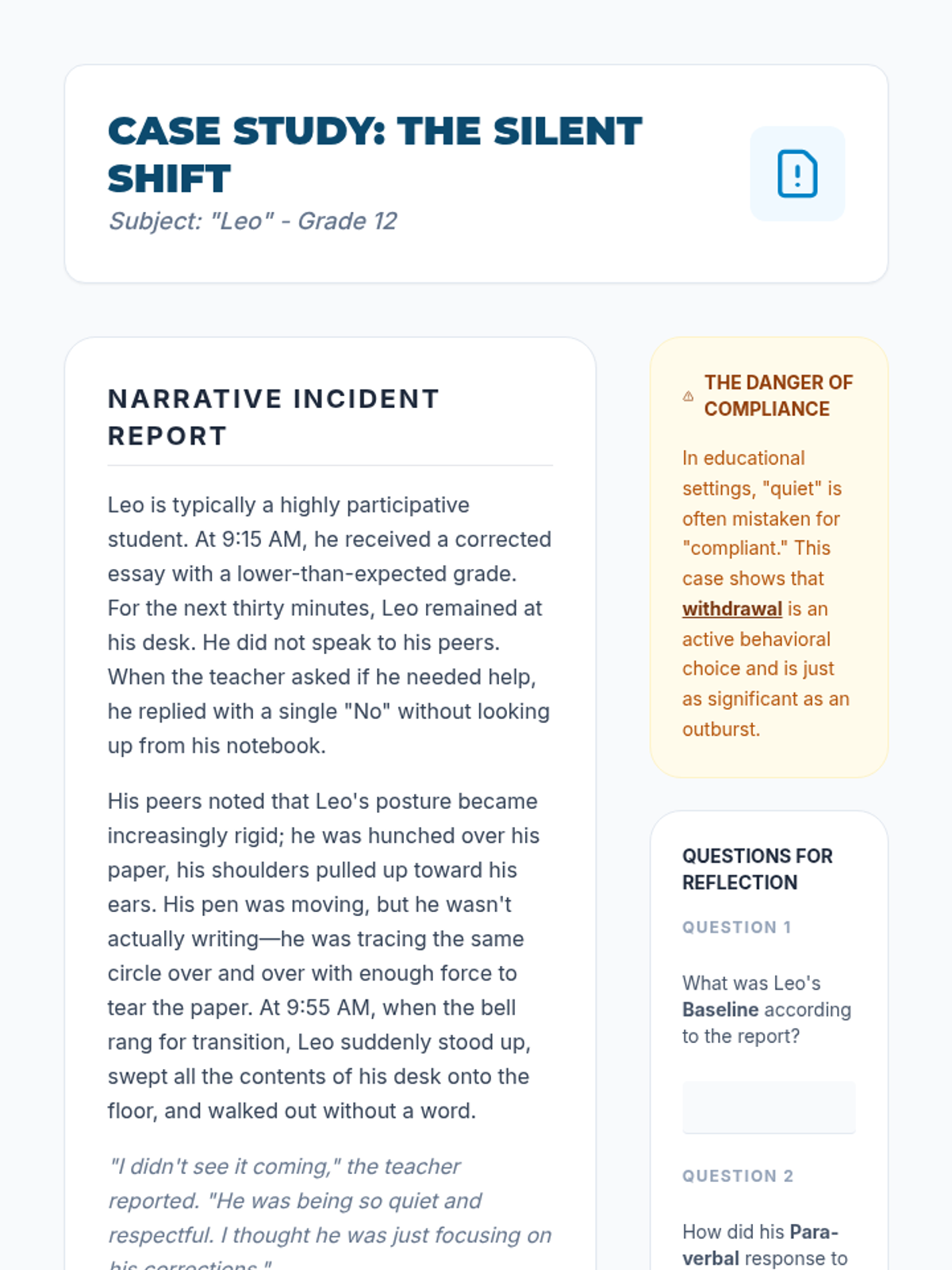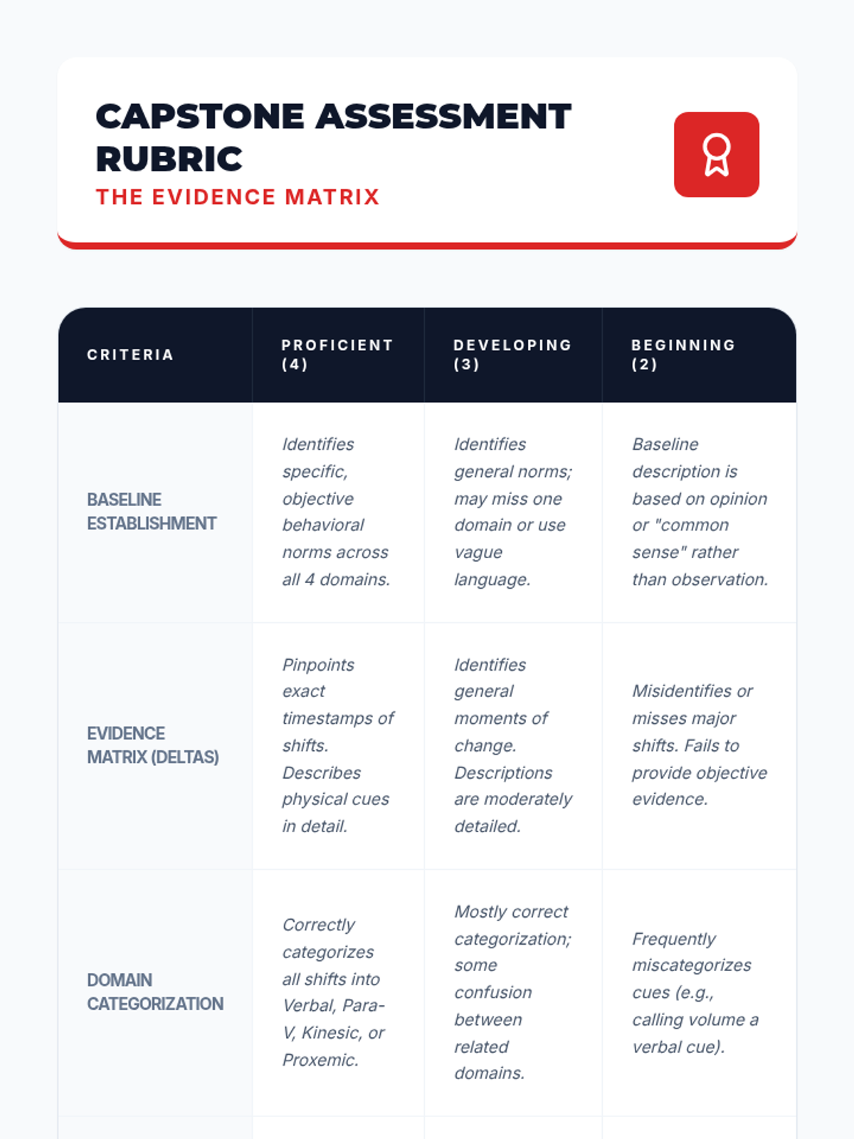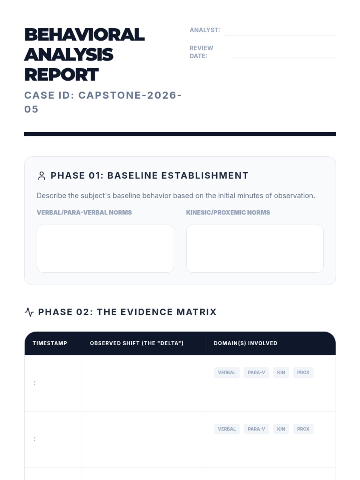 A comprehensive 5-lesson unit for 12th-grade students on identifying behavioral baselines and recognizing early warning signs of emotional escalation through analytical observation of verbal, para-verbal, and non-verbal cues.