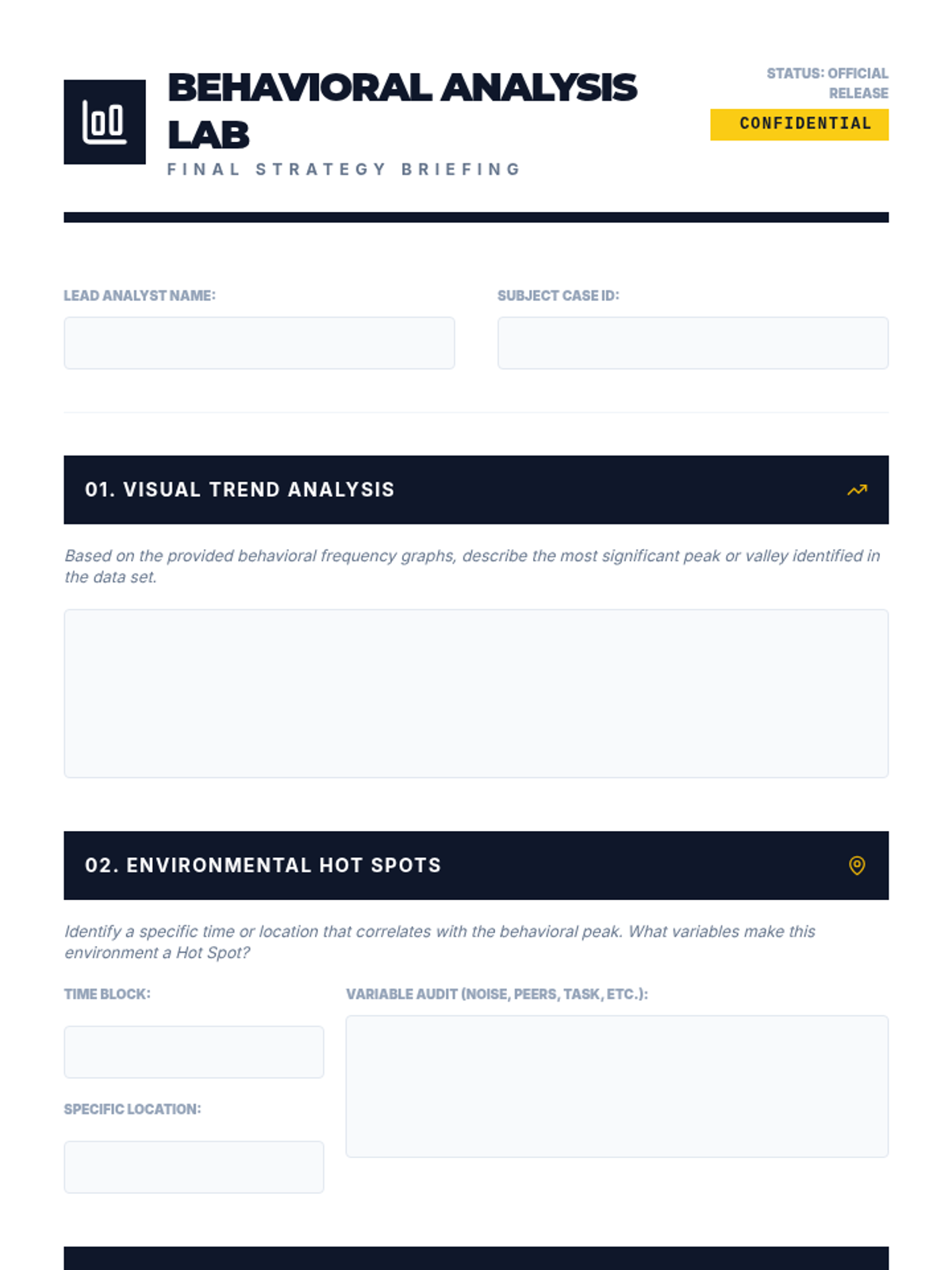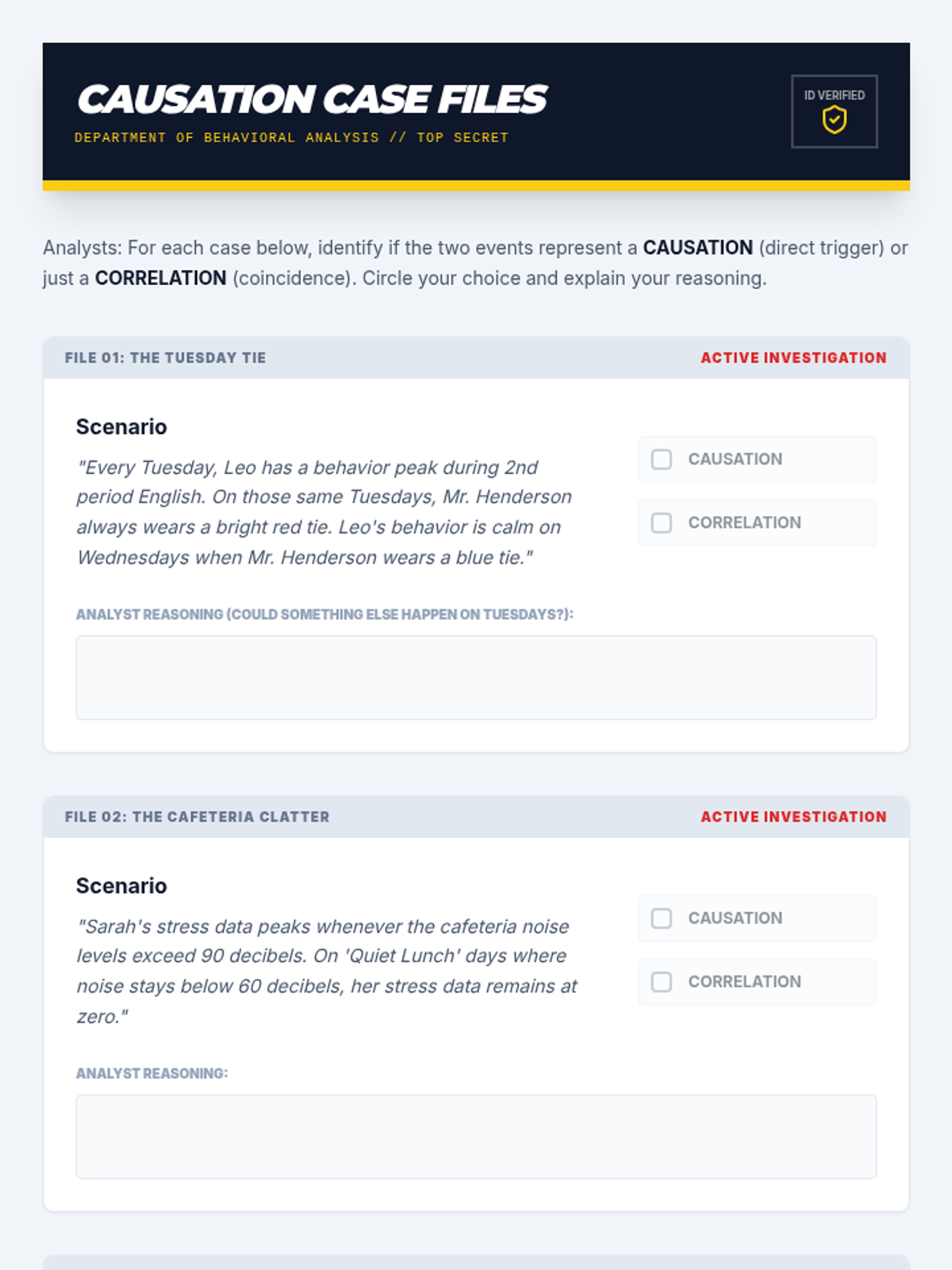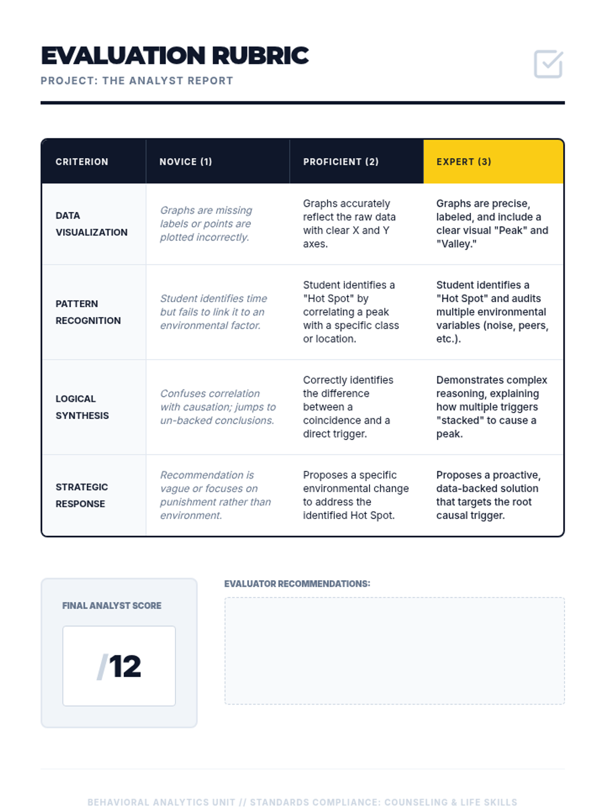 A comprehensive unit where 7th-grade students act as data analysts to interpret behavior charts, identifying patterns, triggers, and environmental correlations to better understand behavioral data.