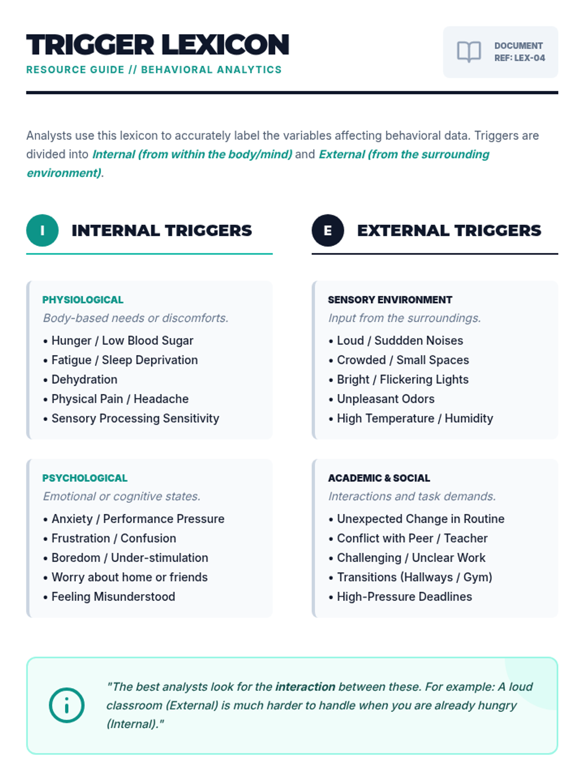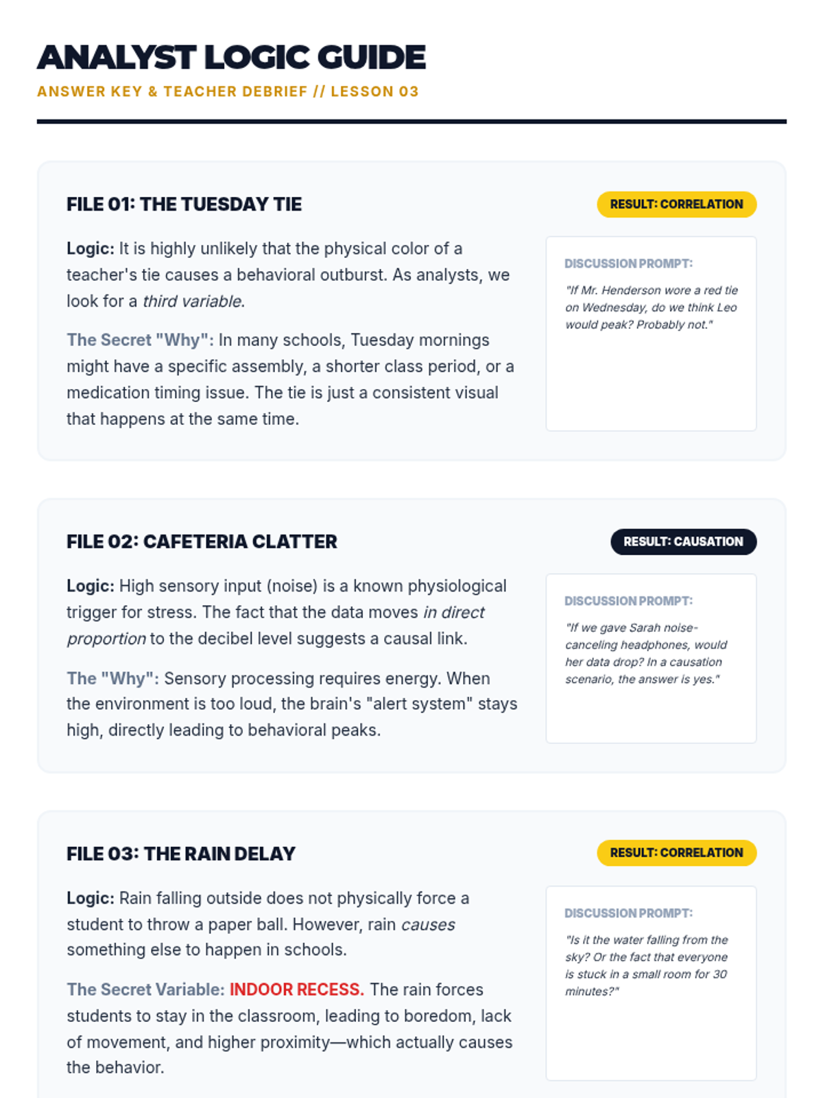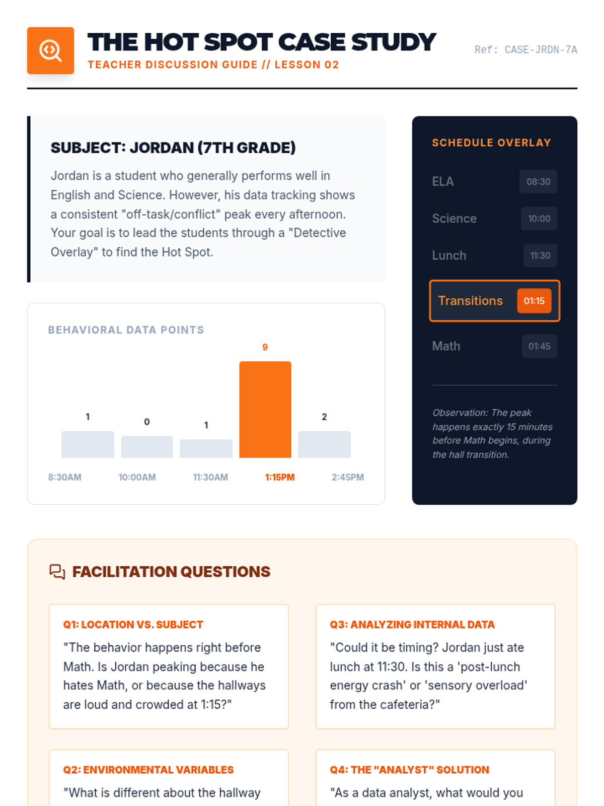 A comprehensive unit where 7th-grade students act as data analysts to interpret behavior charts, identifying patterns, triggers, and environmental correlations to better understand behavioral data.