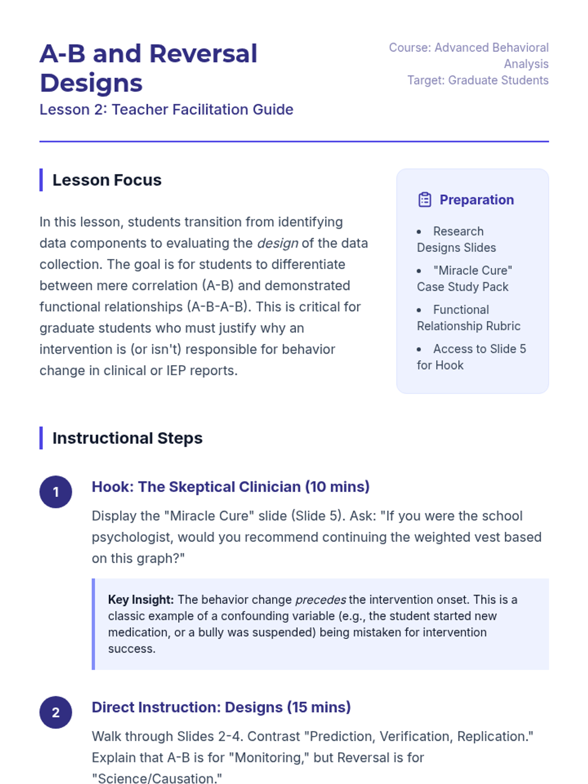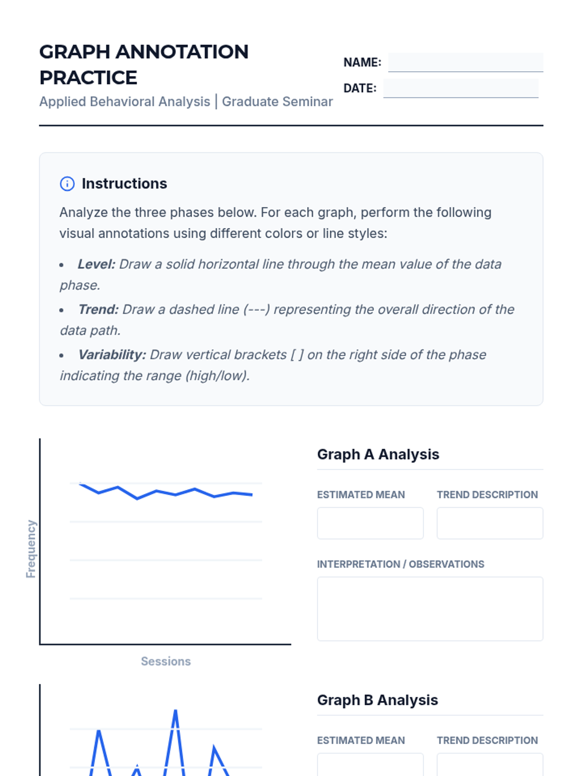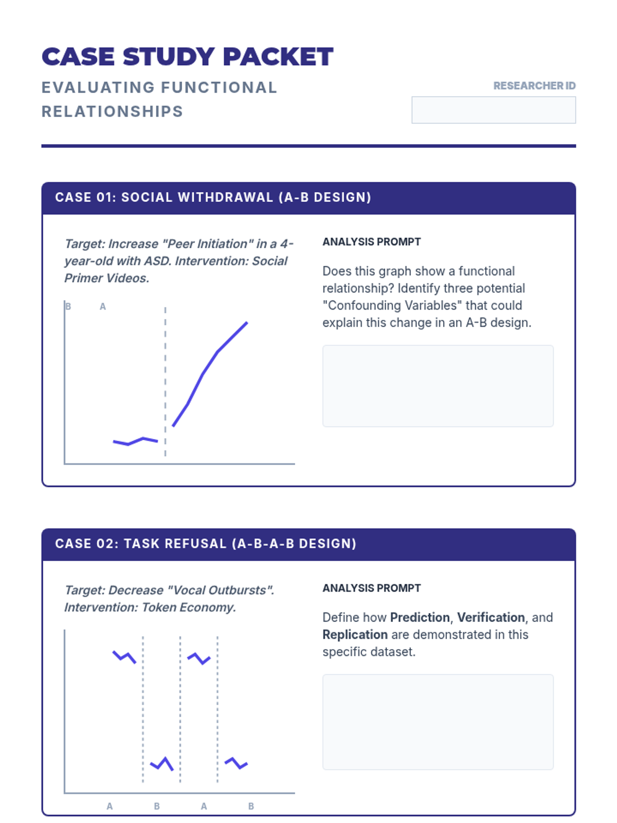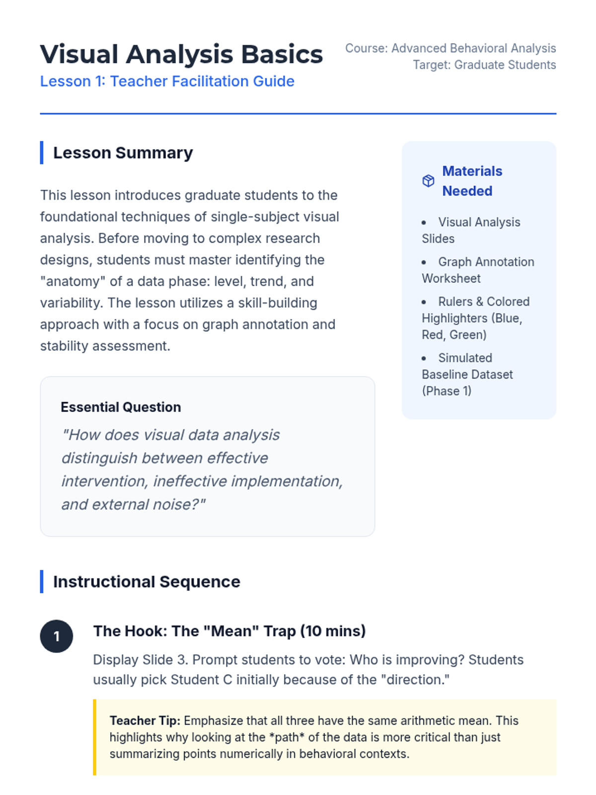 This graduate-level sequence focuses on the visual analysis of single-subject behavioral data. Students progress from identifying core components like level and trend to interpreting complex research designs, establishing data-based decision rules, and communicating technical findings to parents and stakeholders.