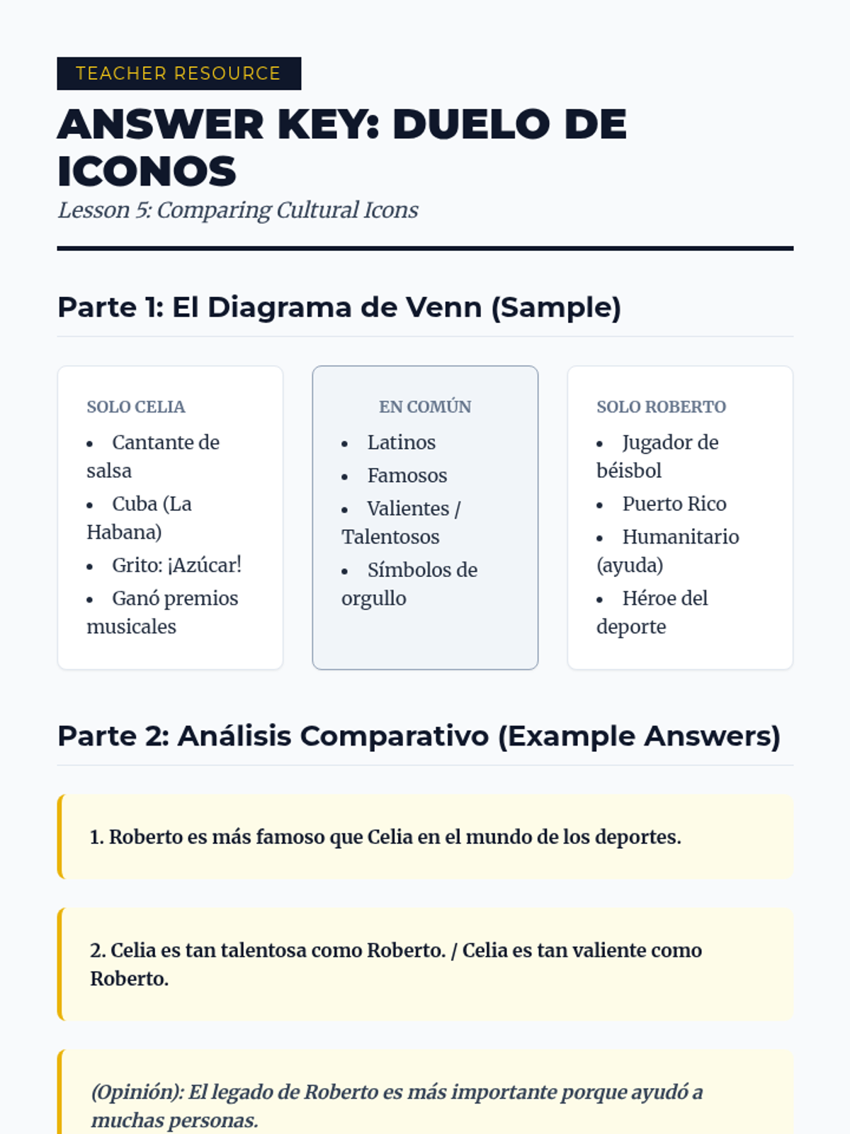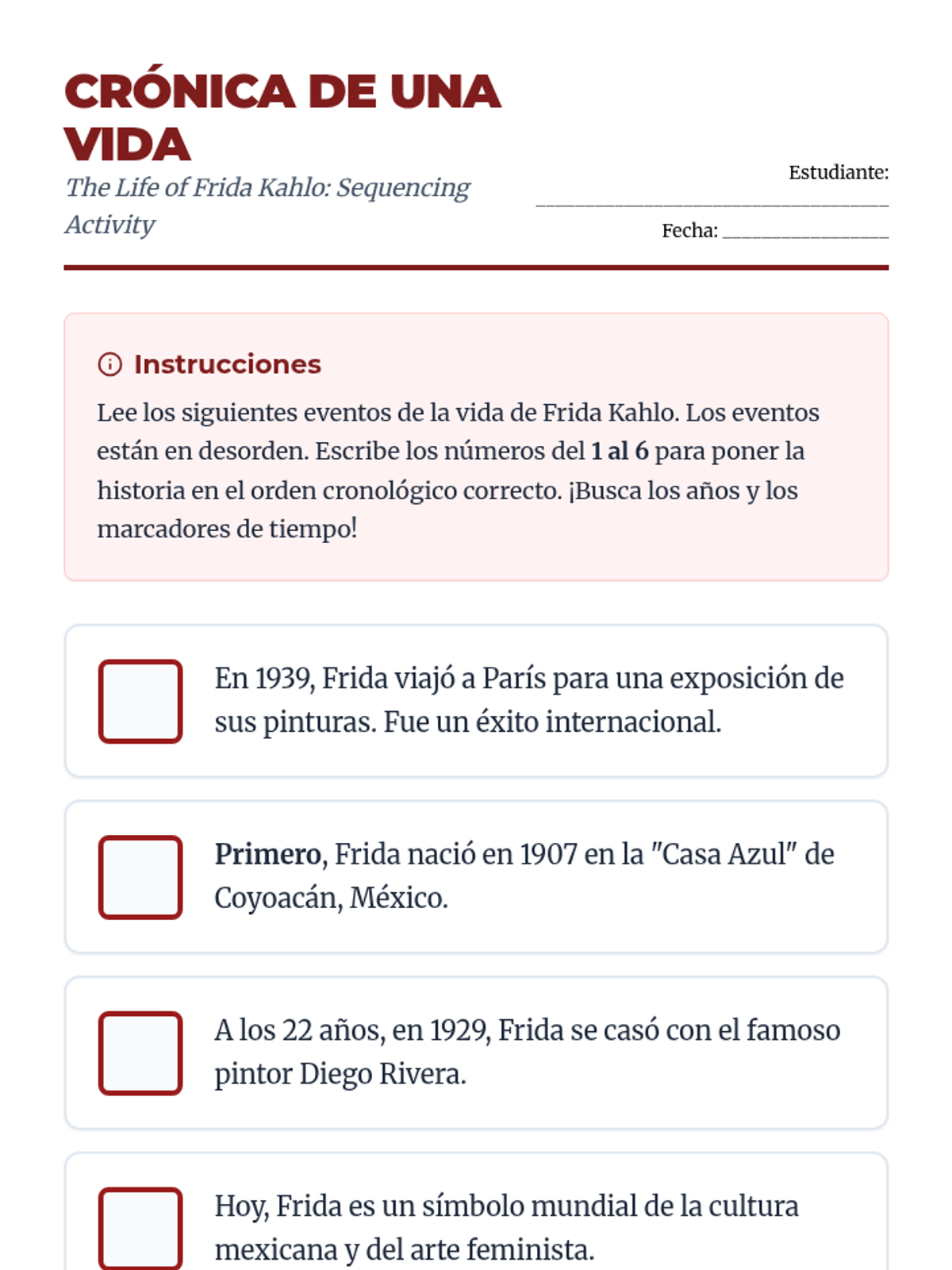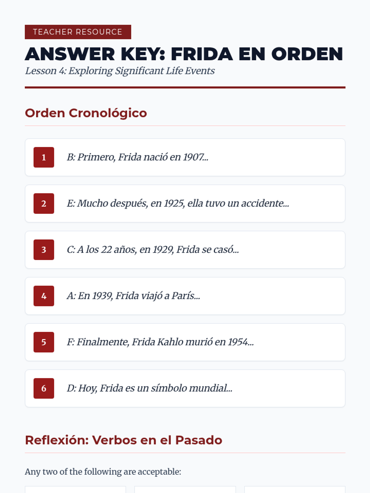 A beginner Spanish reading sequence that uses biographical narratives of historical and contemporary figures to teach grammar (ser/estar, reflexives, possessives) and cultural competence. Students progress from describing identity to analyzing life events and comparing cultural impacts.
