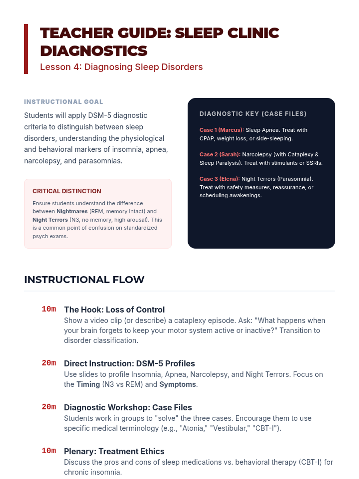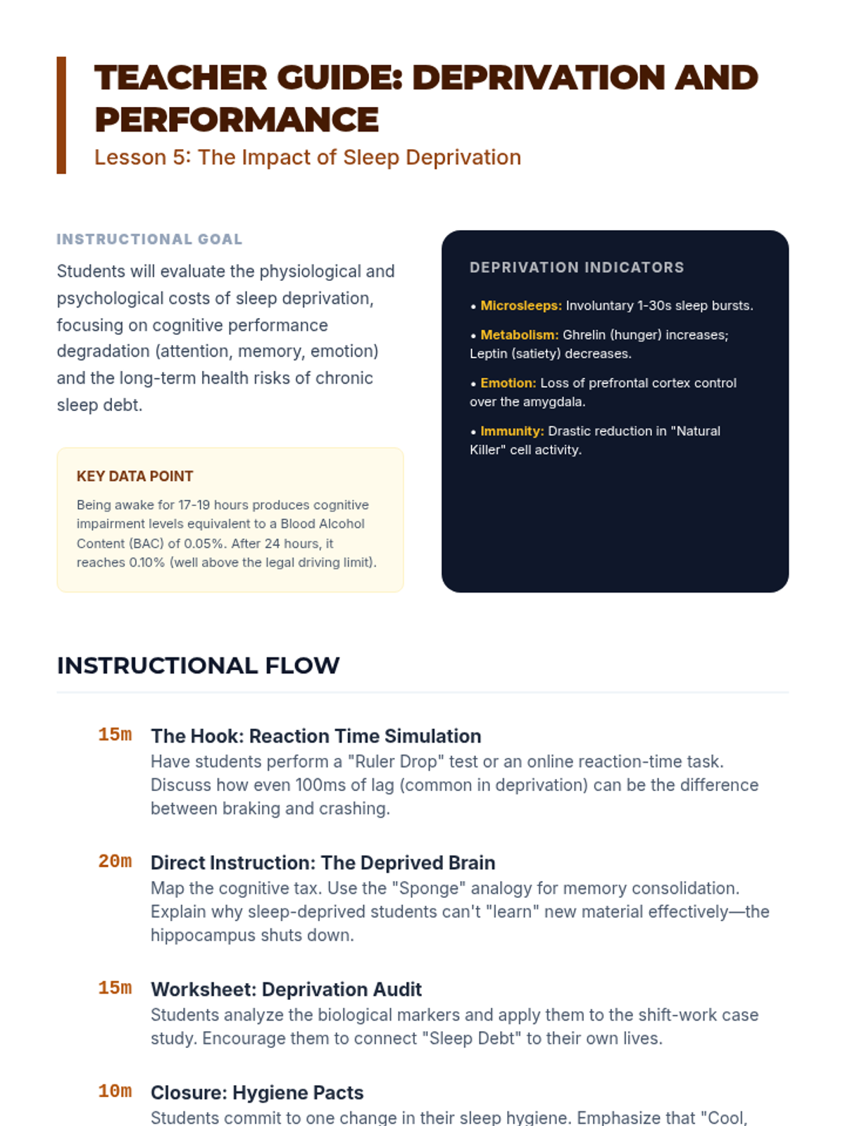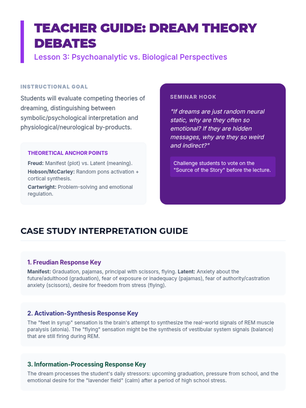 This sequence explores the biological and psychological foundations of sleep, covering circadian rhythms, sleep stages, dream theories, disorders, and the effects of deprivation. Students will analyze physiological data and apply diagnostic criteria to understand how sleep dictates human behavior.