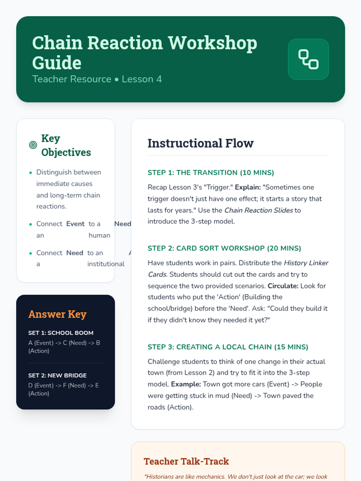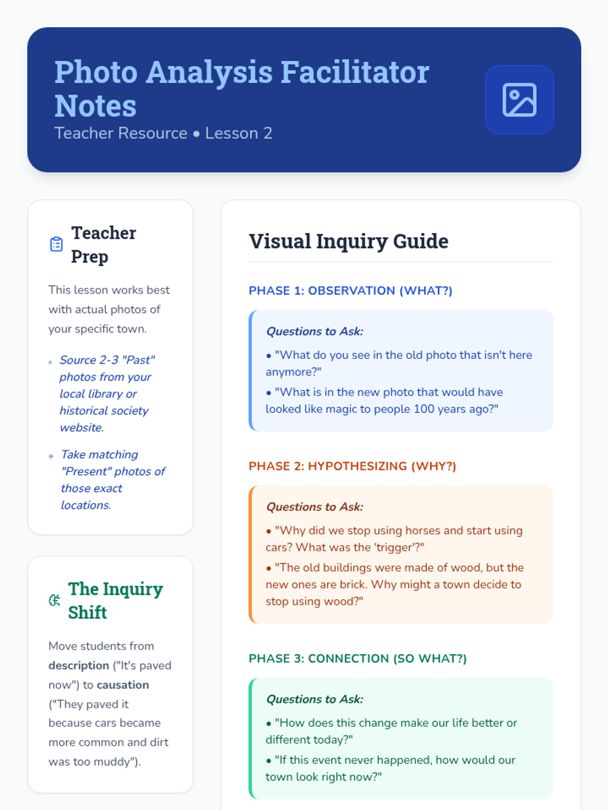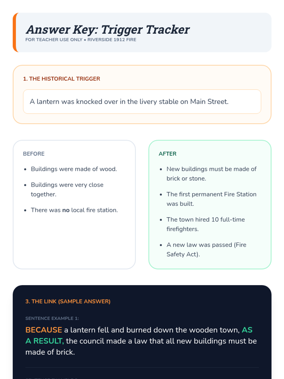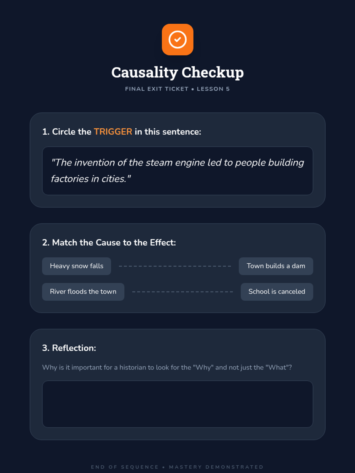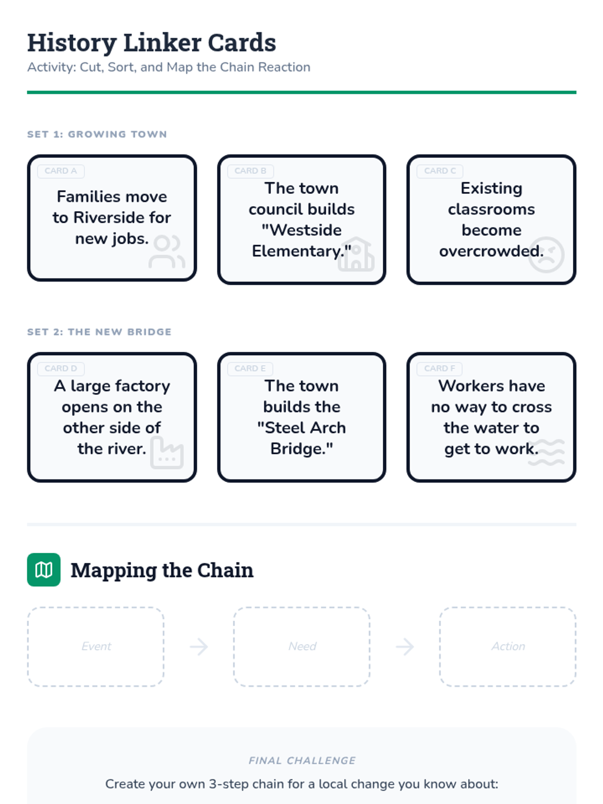 This inquiry-based sequence for 3rd grade explores the relationship between events through cause and effect. Using local community history as a lens, students learn to identify historical 'triggers' and map the chain reactions that shape their world today.