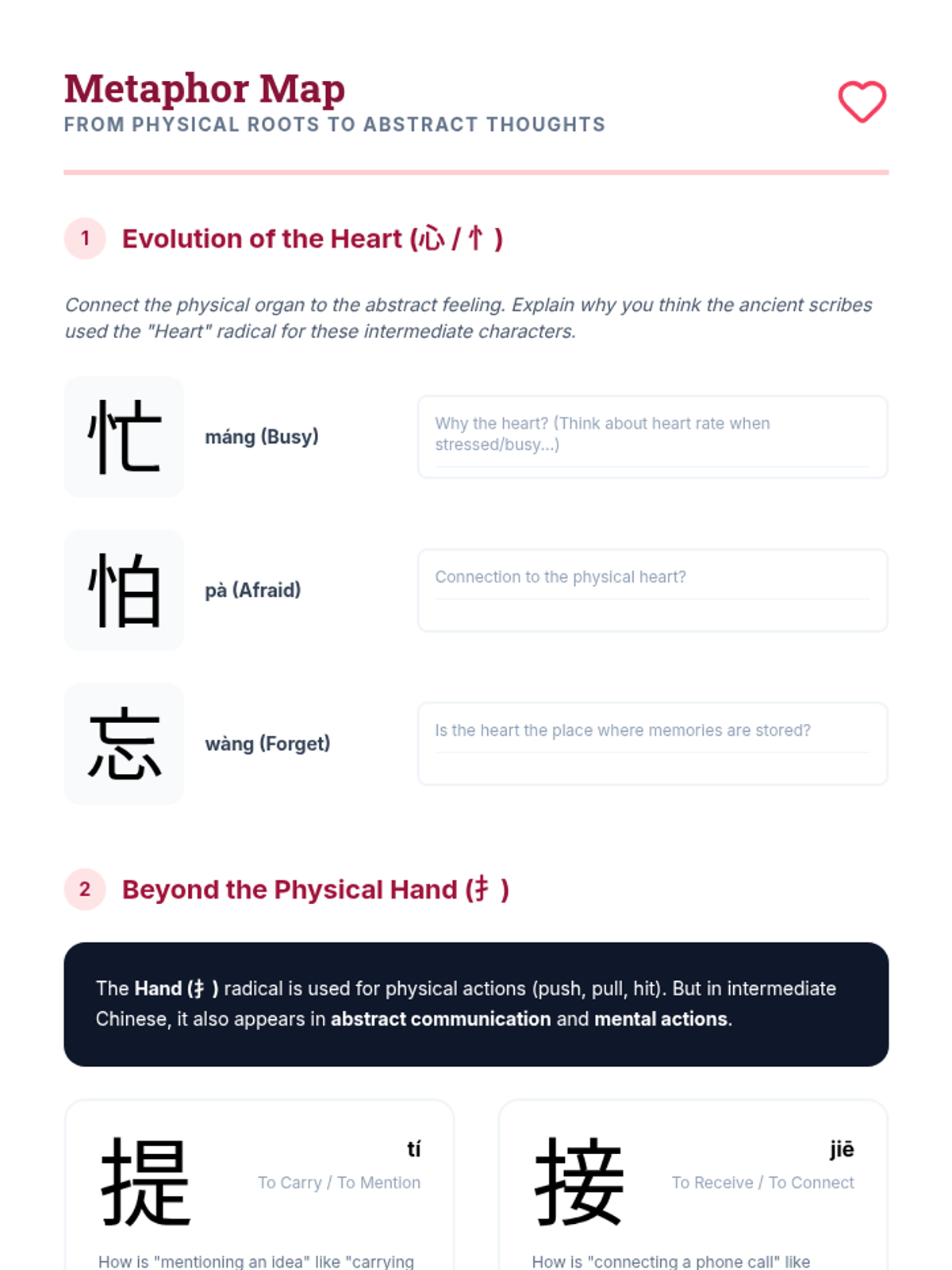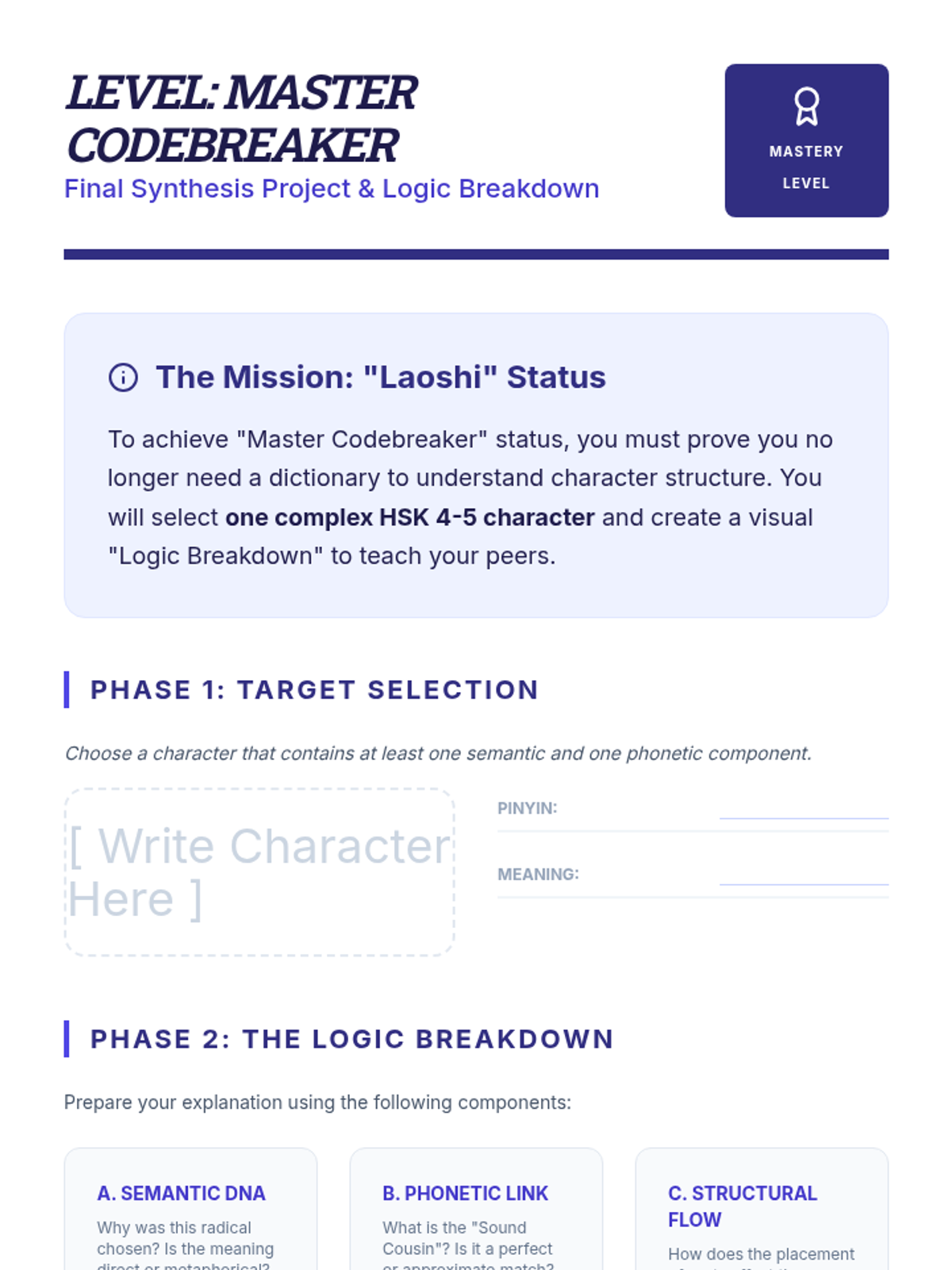 This inquiry-based sequence demystifies the structure of semantic-phonetic characters, which make up the vast majority of the Chinese writing system. Students move from rote memorization to analytical decoding by identifying the 'meaning' component (radical) and the 'sound' component (phonetic) within intermediate-level characters.