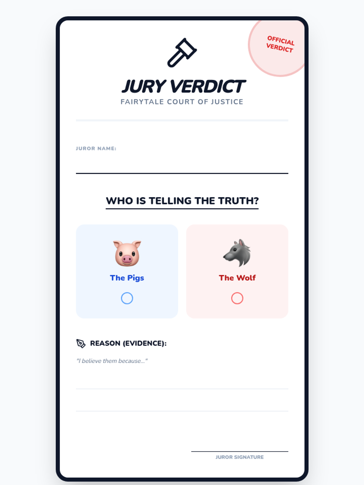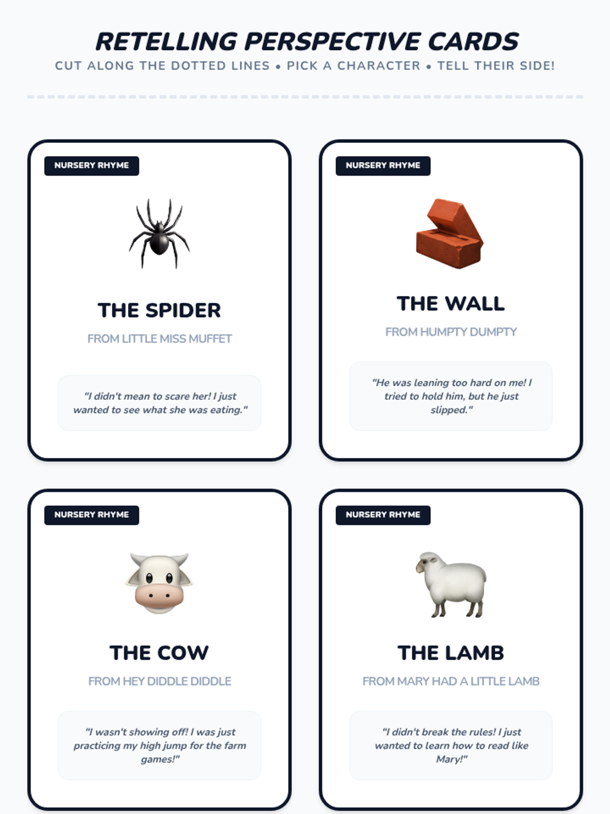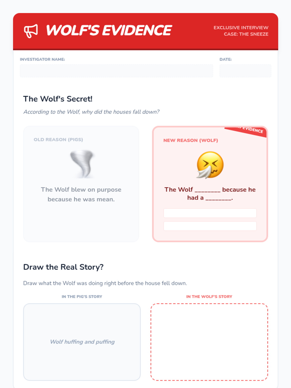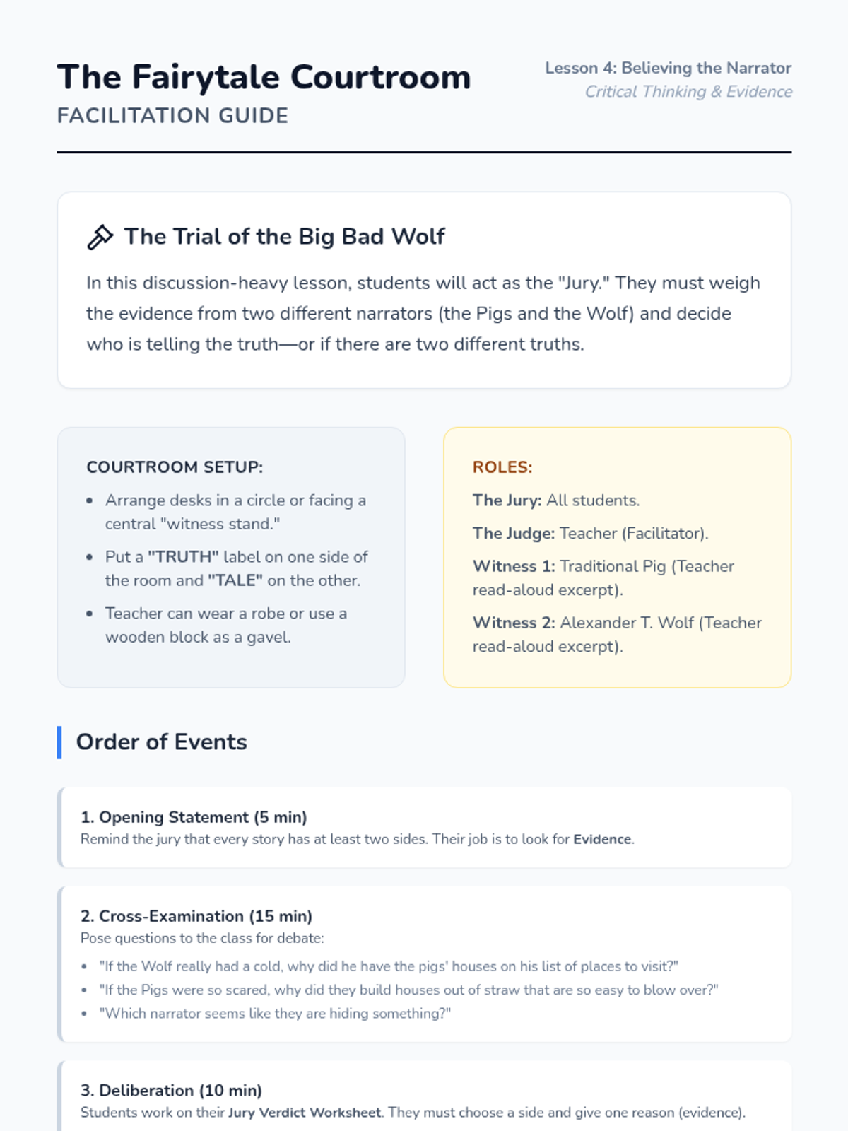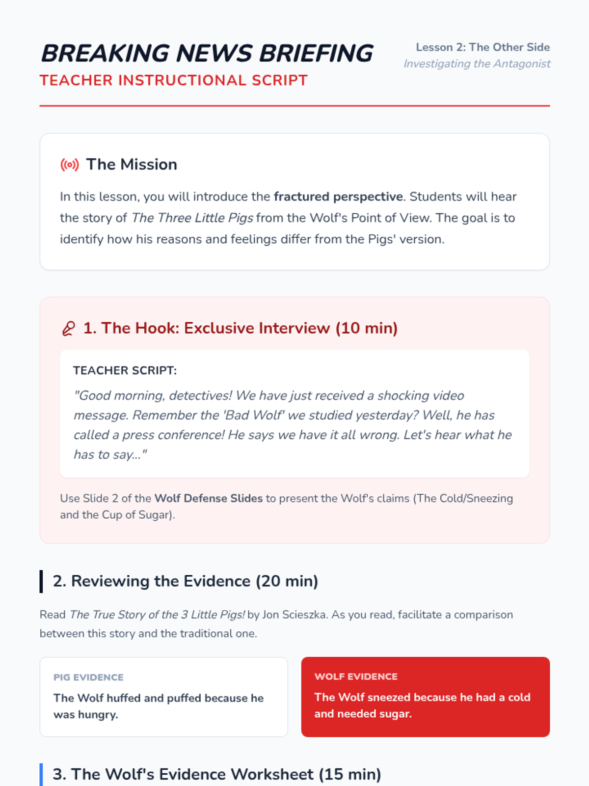A 1st-grade ELA sequence that uses fractured fairy tales to teach point of view. Students compare traditional stories with antagonist-led versions to understand how perspective influences narrative details and reader empathy.