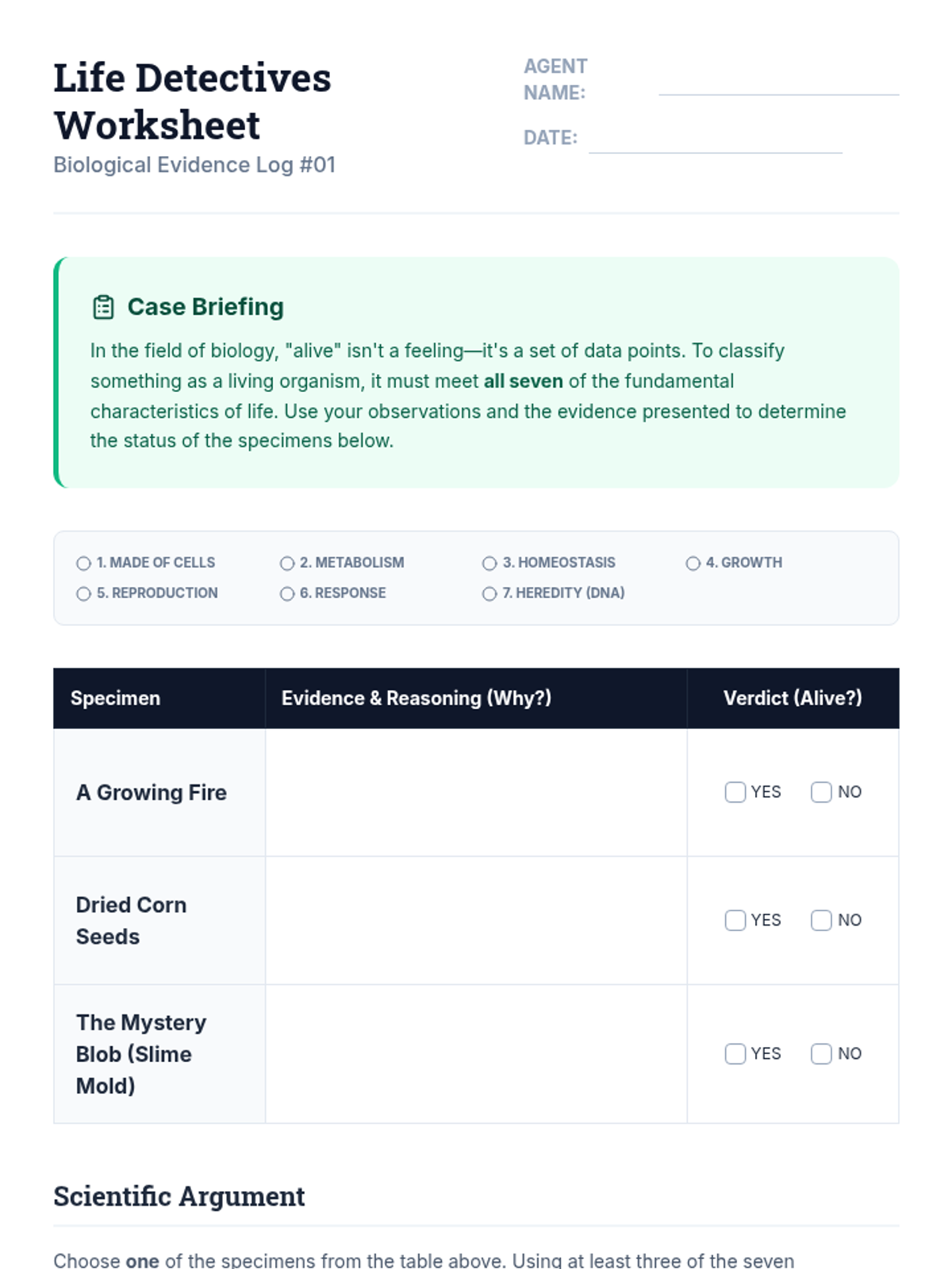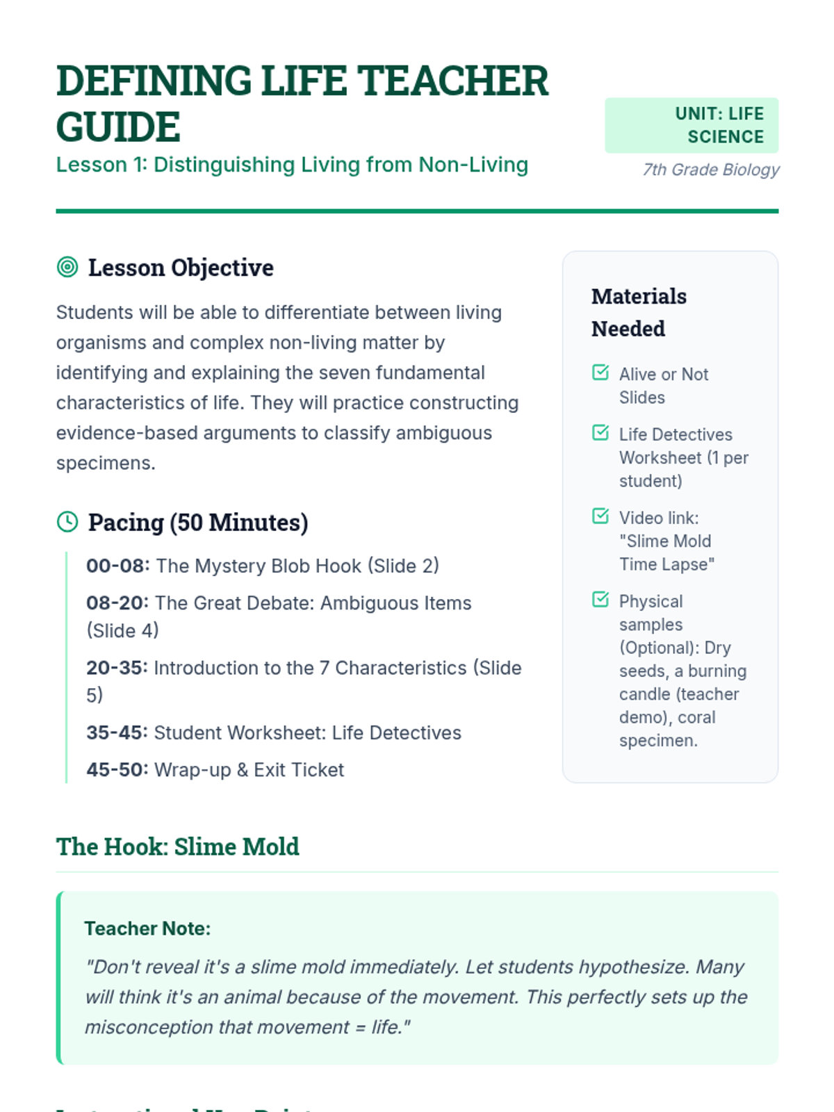 This sequence guides 7th-grade students through the scientific criteria used to define life, moving from intuitive observations to biological analysis of metabolism, cellular structure, and homeostasis. Students explore ambiguous examples and conduct experiments to build a robust definition of what it means to be alive.