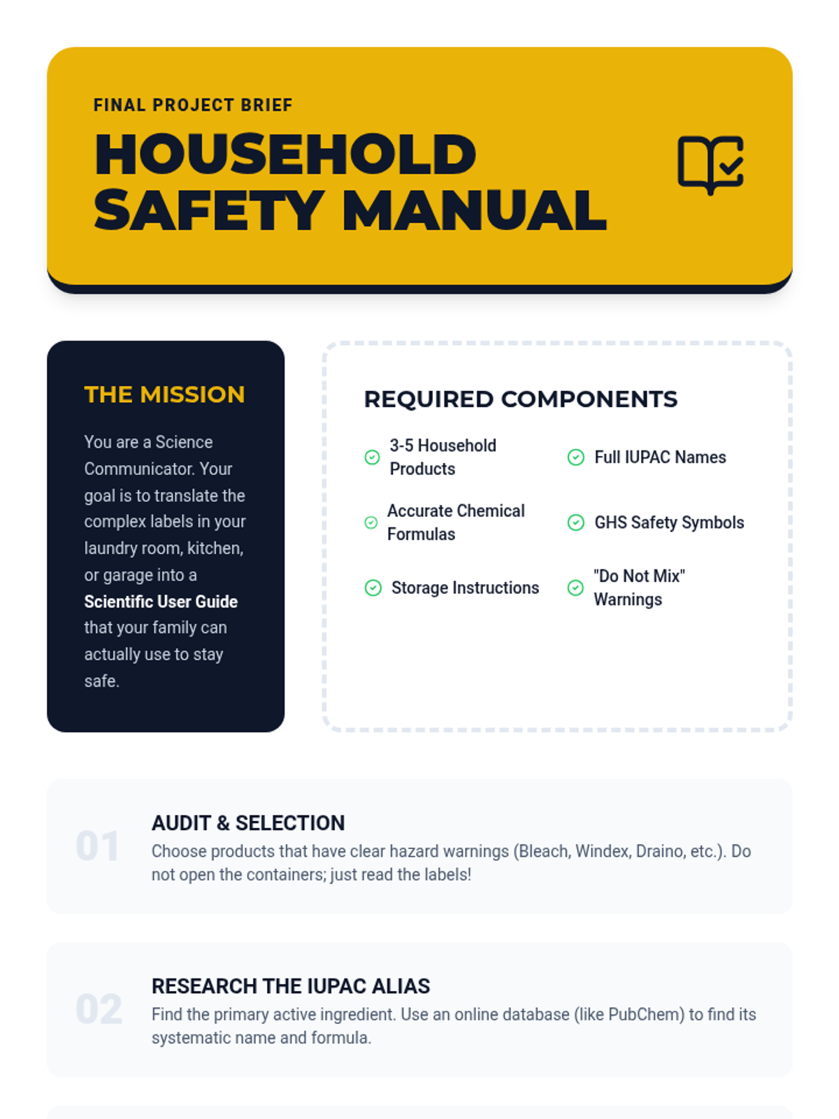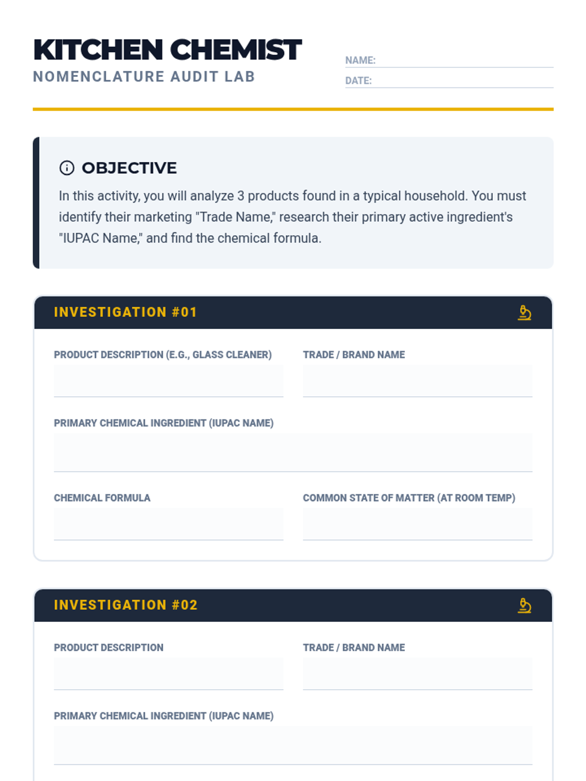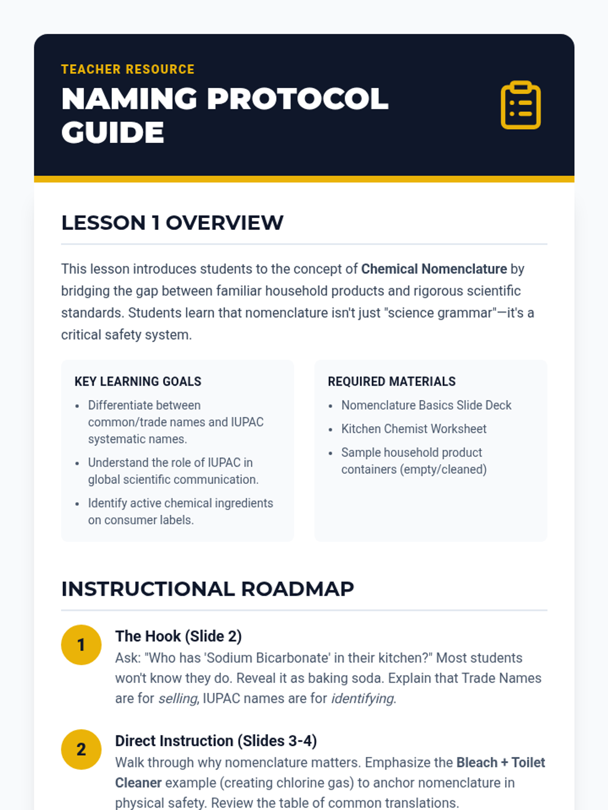 This sequence connects chemical nomenclature to real-world safety and household literacy. Students investigate the ingredients of common household products, translating between trade names and IUPAC scientific names while analyzing safety data sheets and historical mishaps.