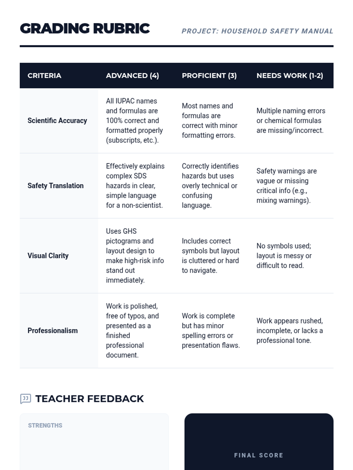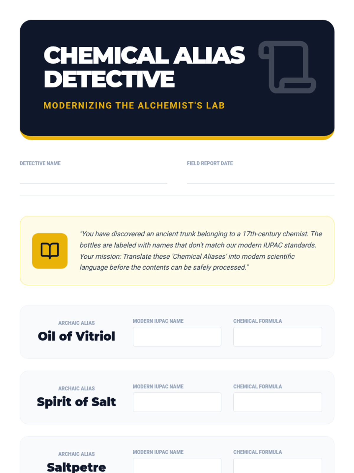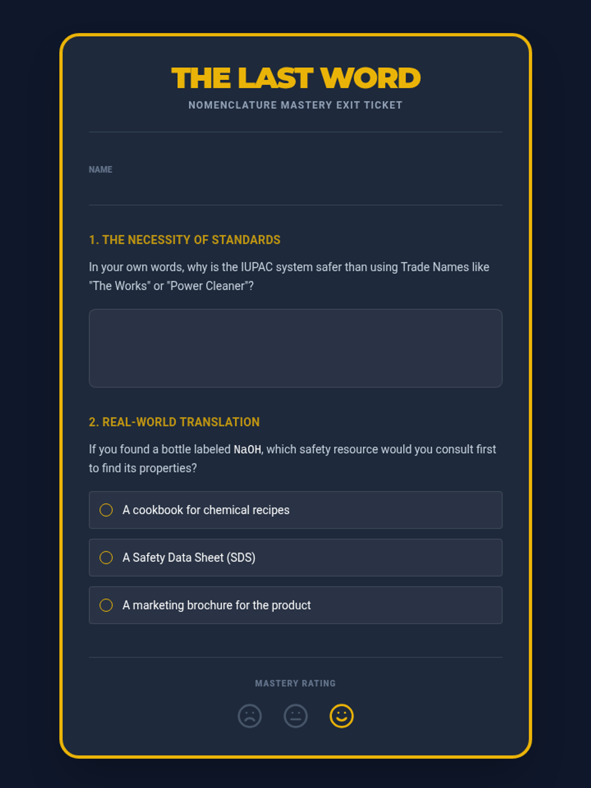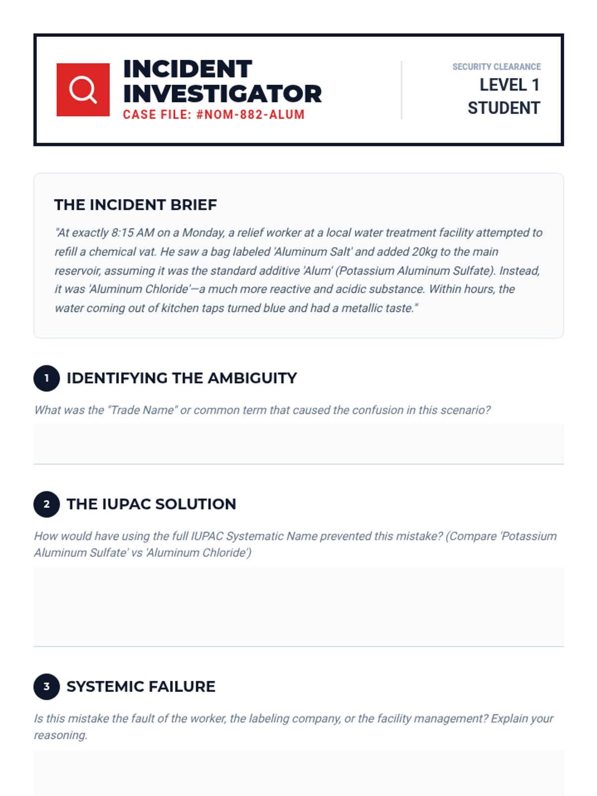This sequence connects chemical nomenclature to real-world safety and household literacy. Students investigate the ingredients of common household products, translating between trade names and IUPAC scientific names while analyzing safety data sheets and historical mishaps.