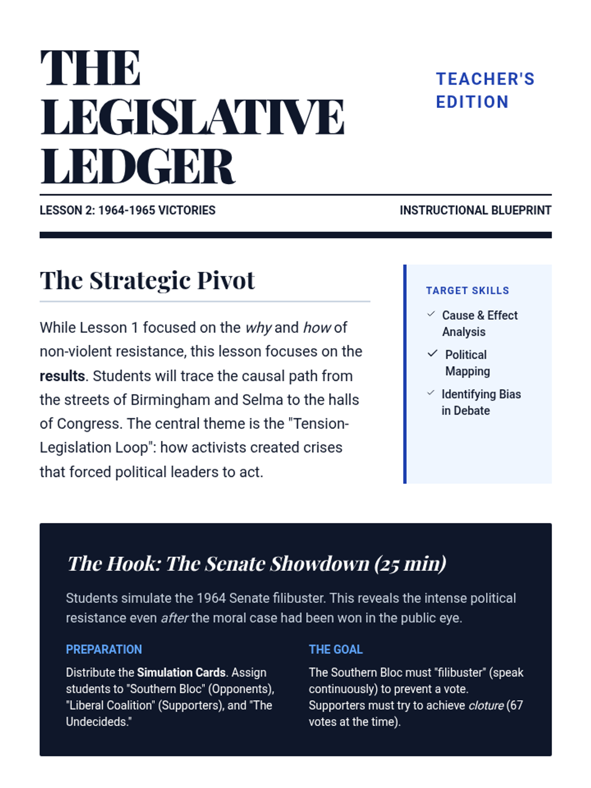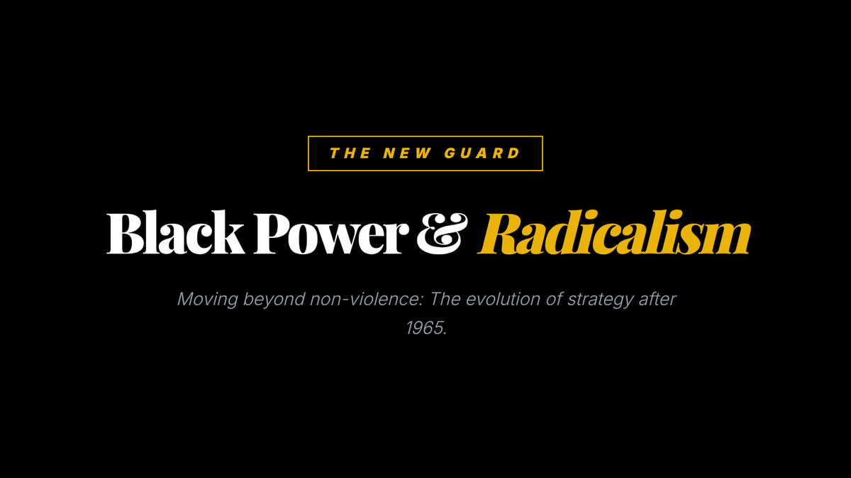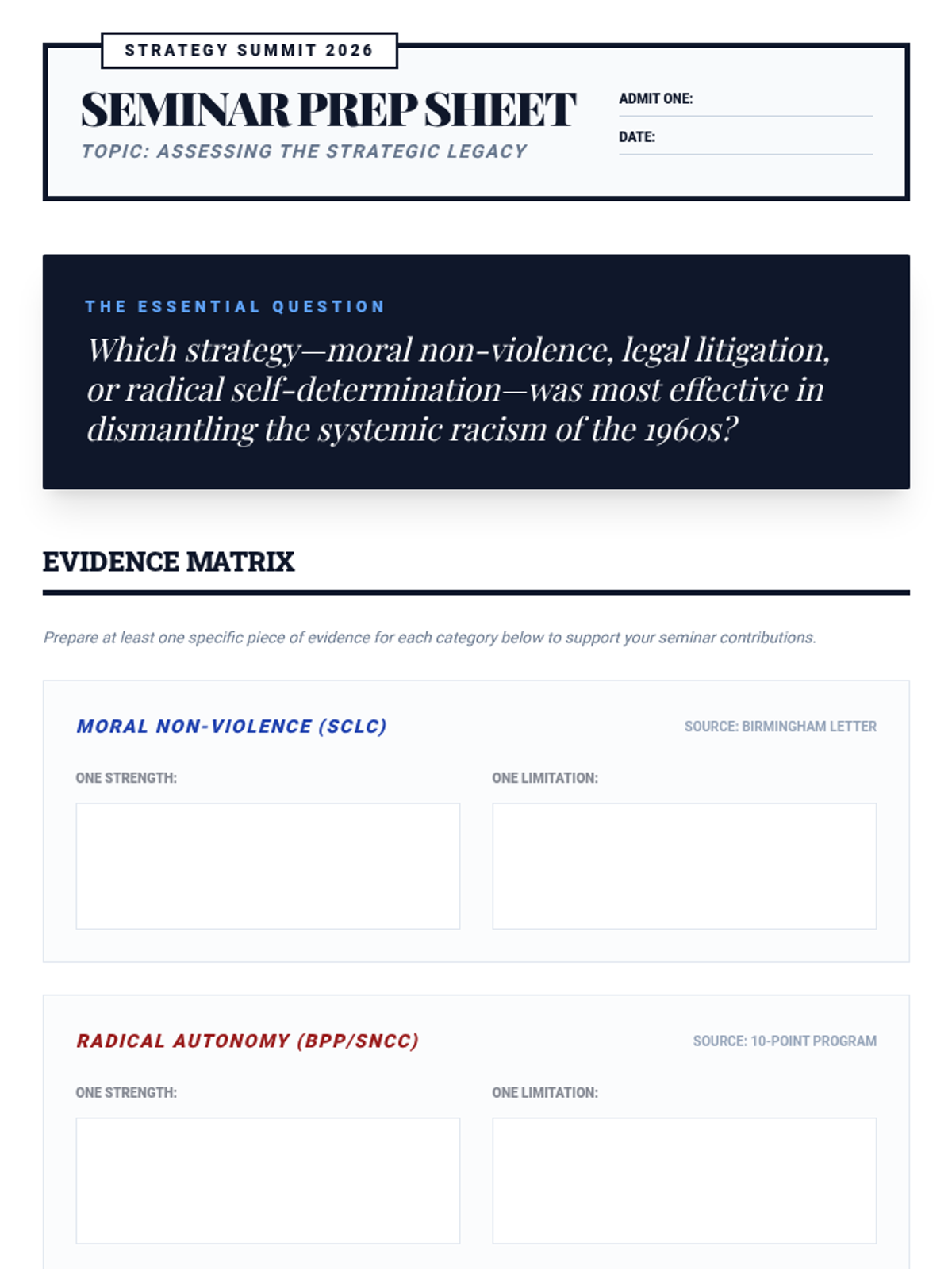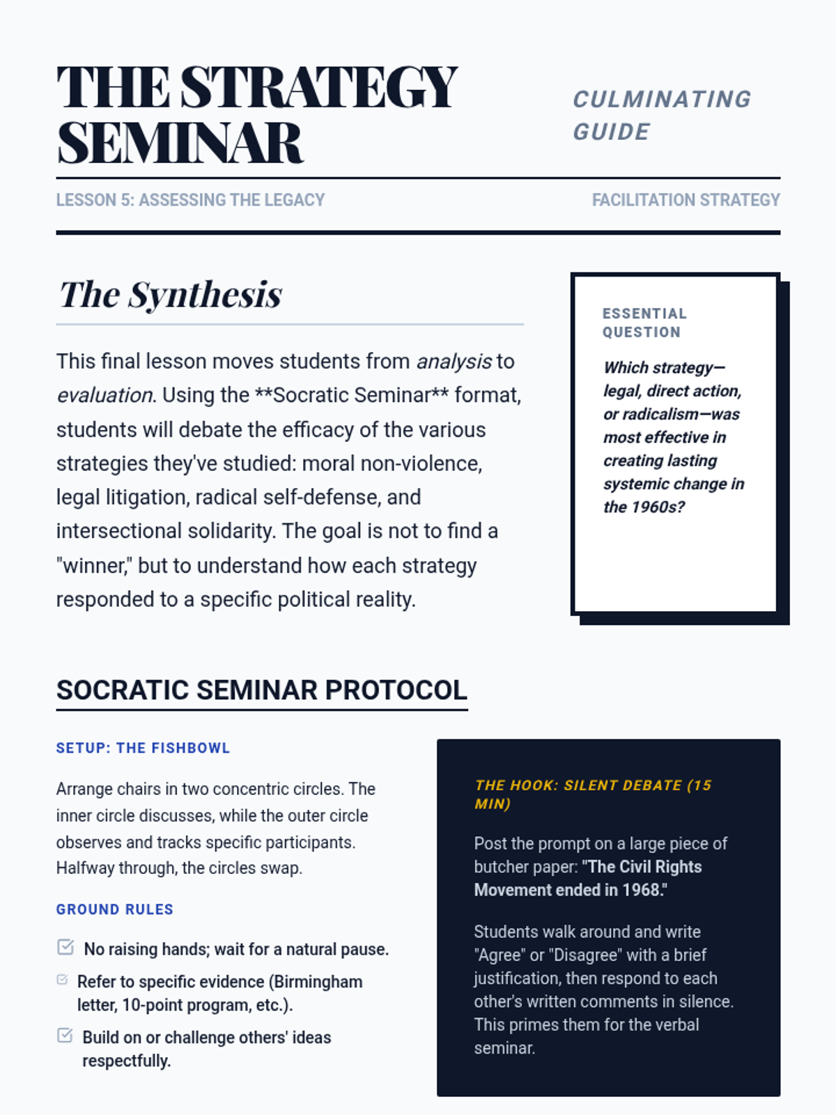 A comprehensive 11th-grade US History unit exploring the strategic evolution of the Civil Rights Movement from non-violent resistance to Black Power and intersectional activism. Students analyze primary sources, legislative milestones, and parallel movements to evaluate the efficacy of various protest strategies.