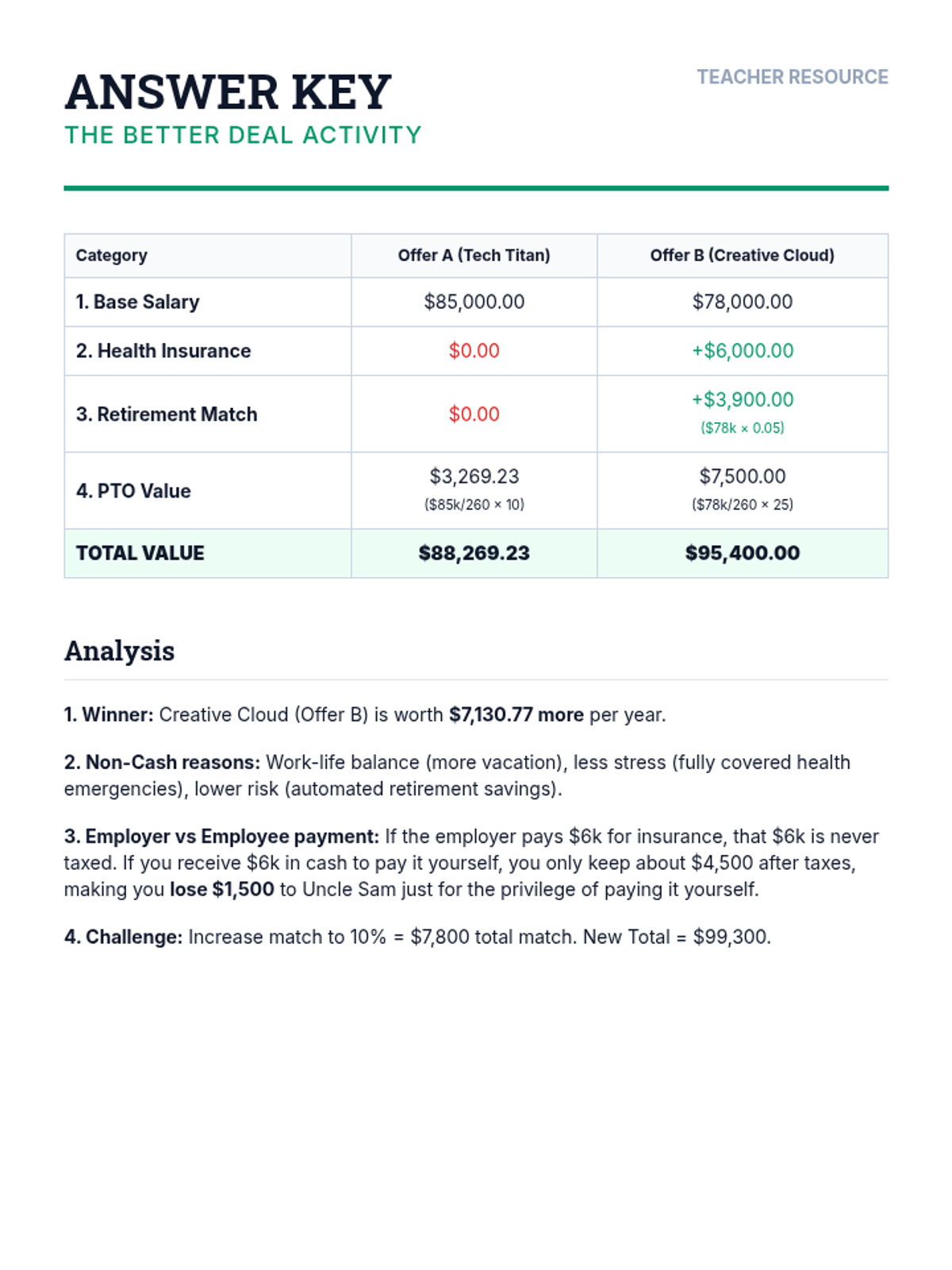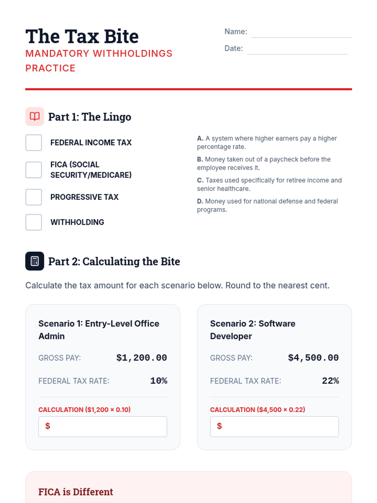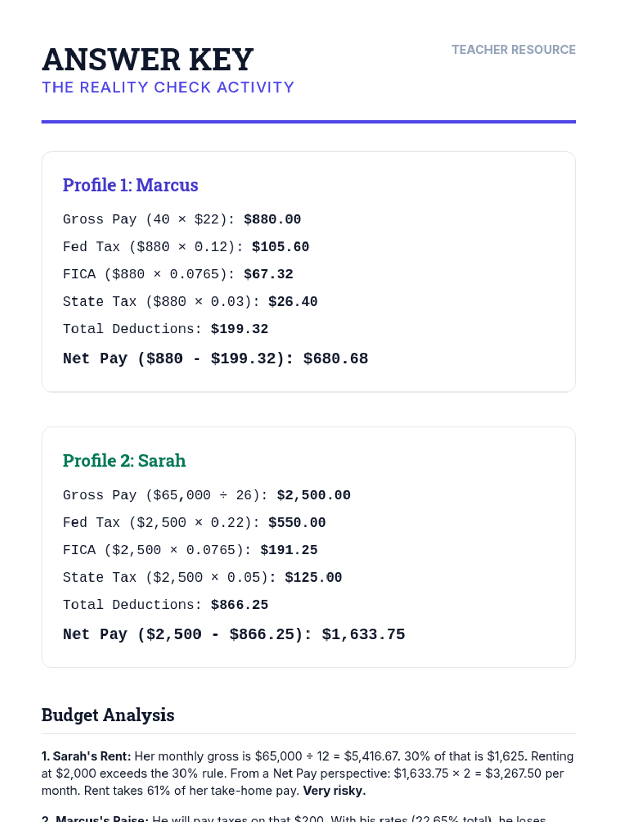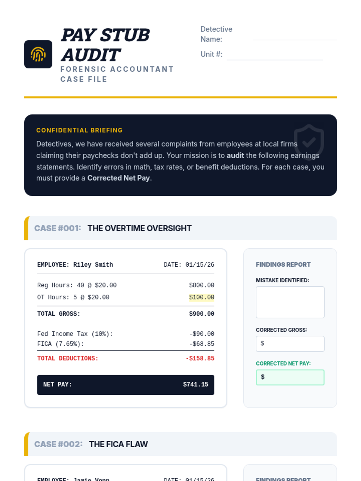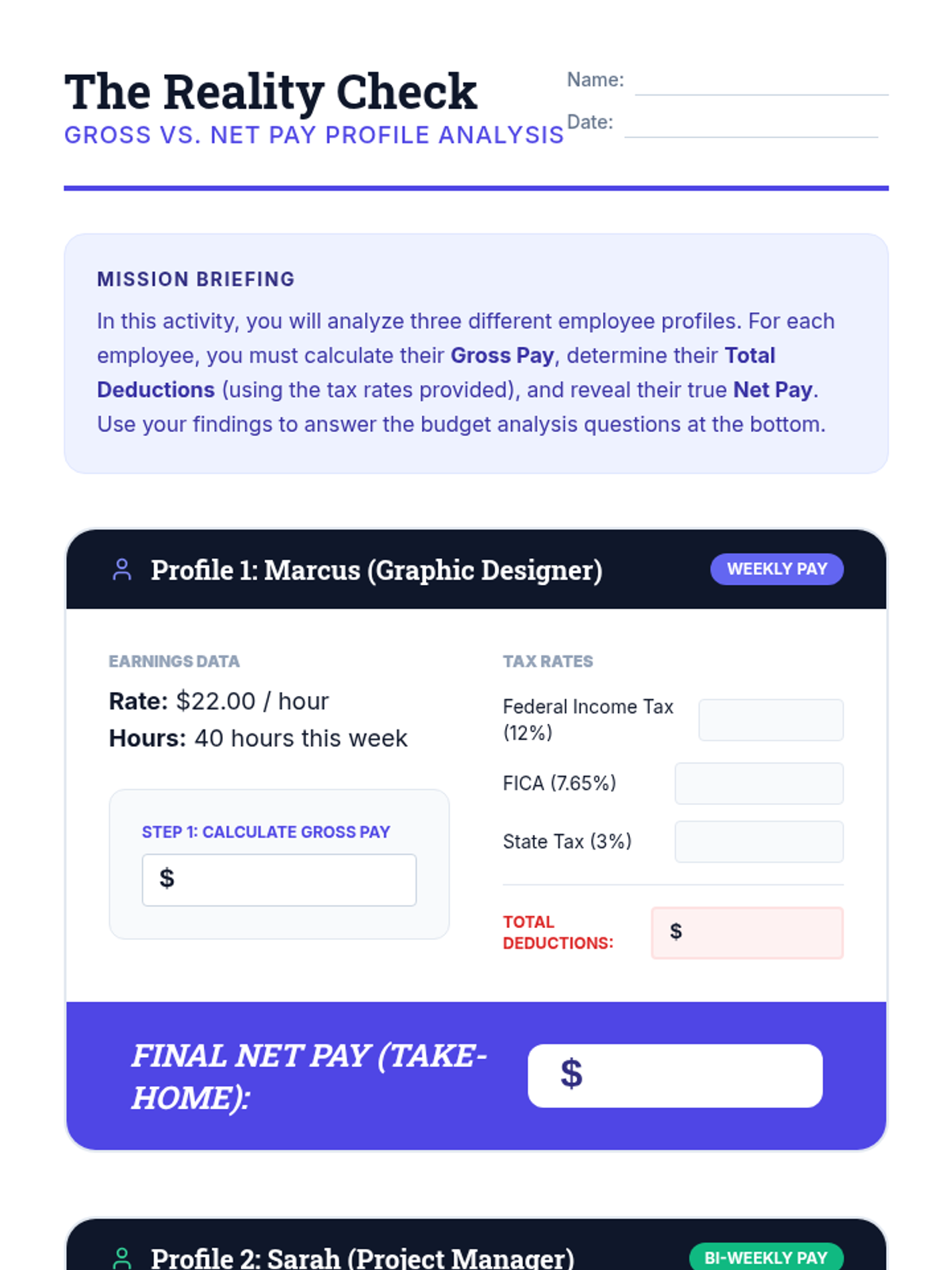 A comprehensive 8th-grade unit on employment income, guiding students from calculating gross pay to understanding tax withholdings, analyzing employee benefits, and auditing pay stubs for accuracy.