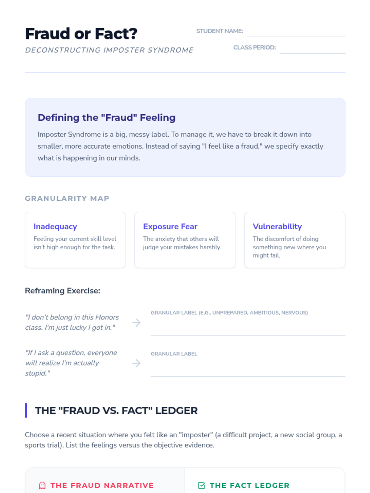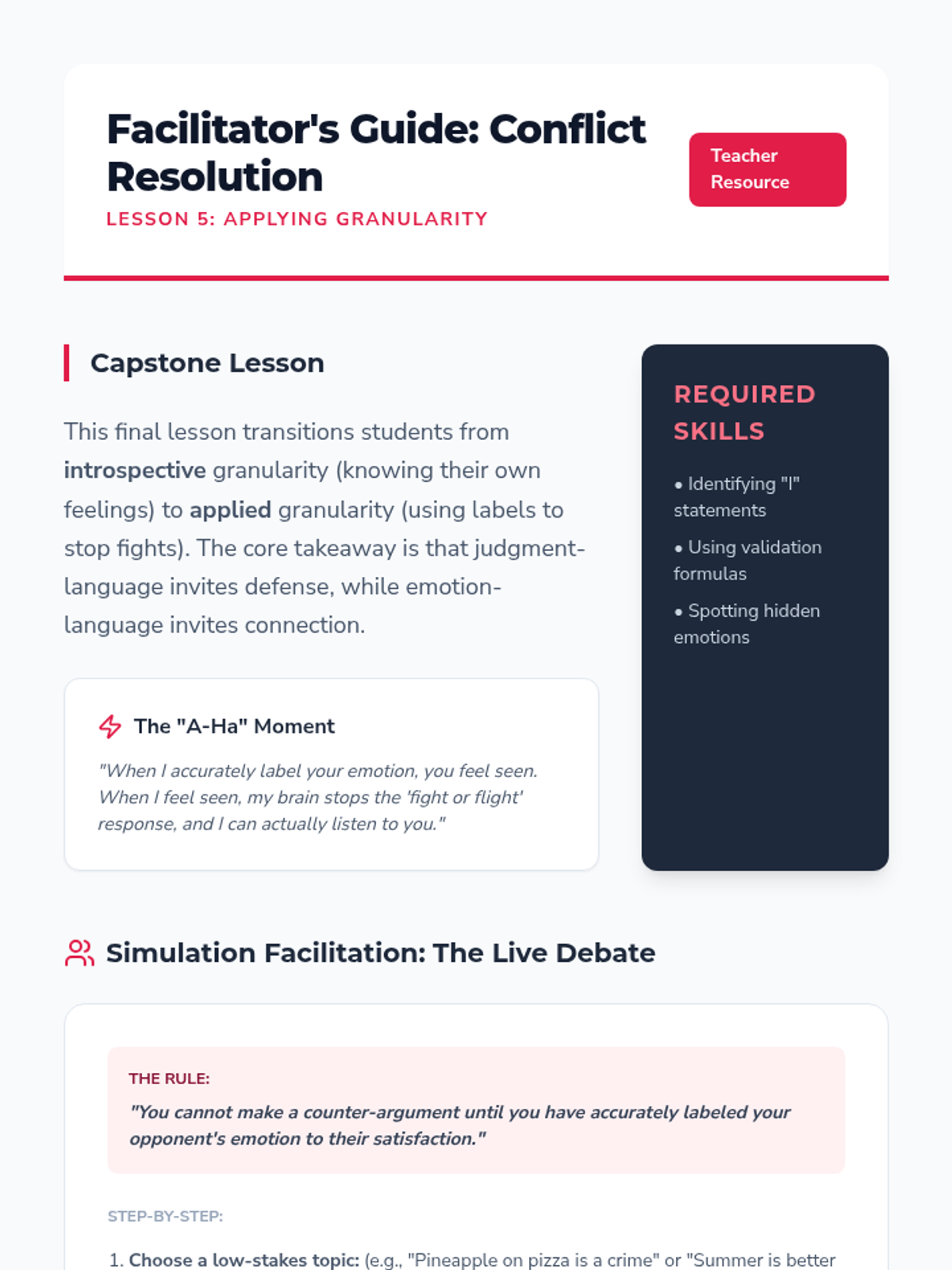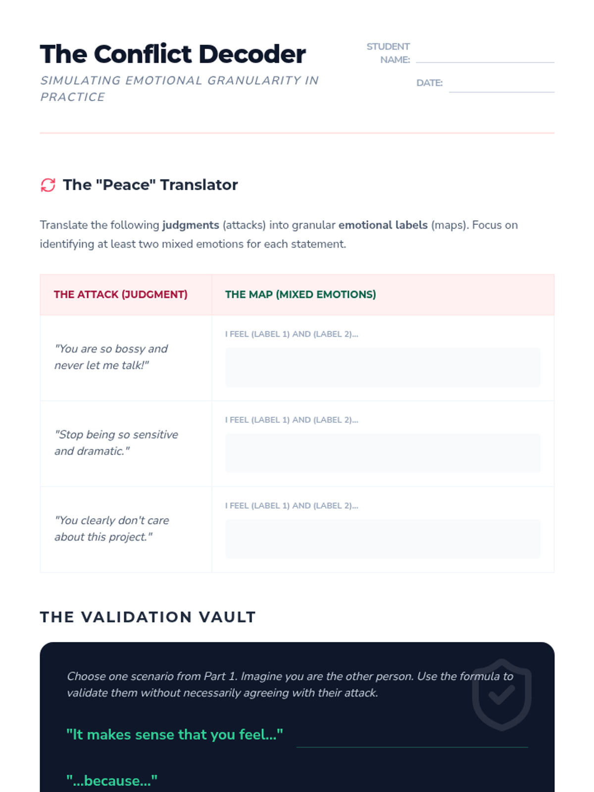A comprehensive unit for 11th-grade students focusing on complex emotion labeling through dialectical thinking, case studies of imposter syndrome, empathy gap analysis, and transition-related emotions. Students develop sophisticated perspective-taking and conflict-resolution skills by moving beyond surface-level labels to identify mixed emotional states.