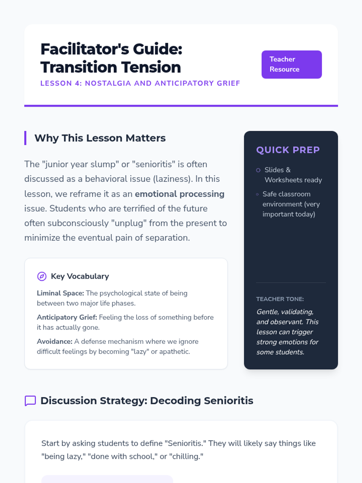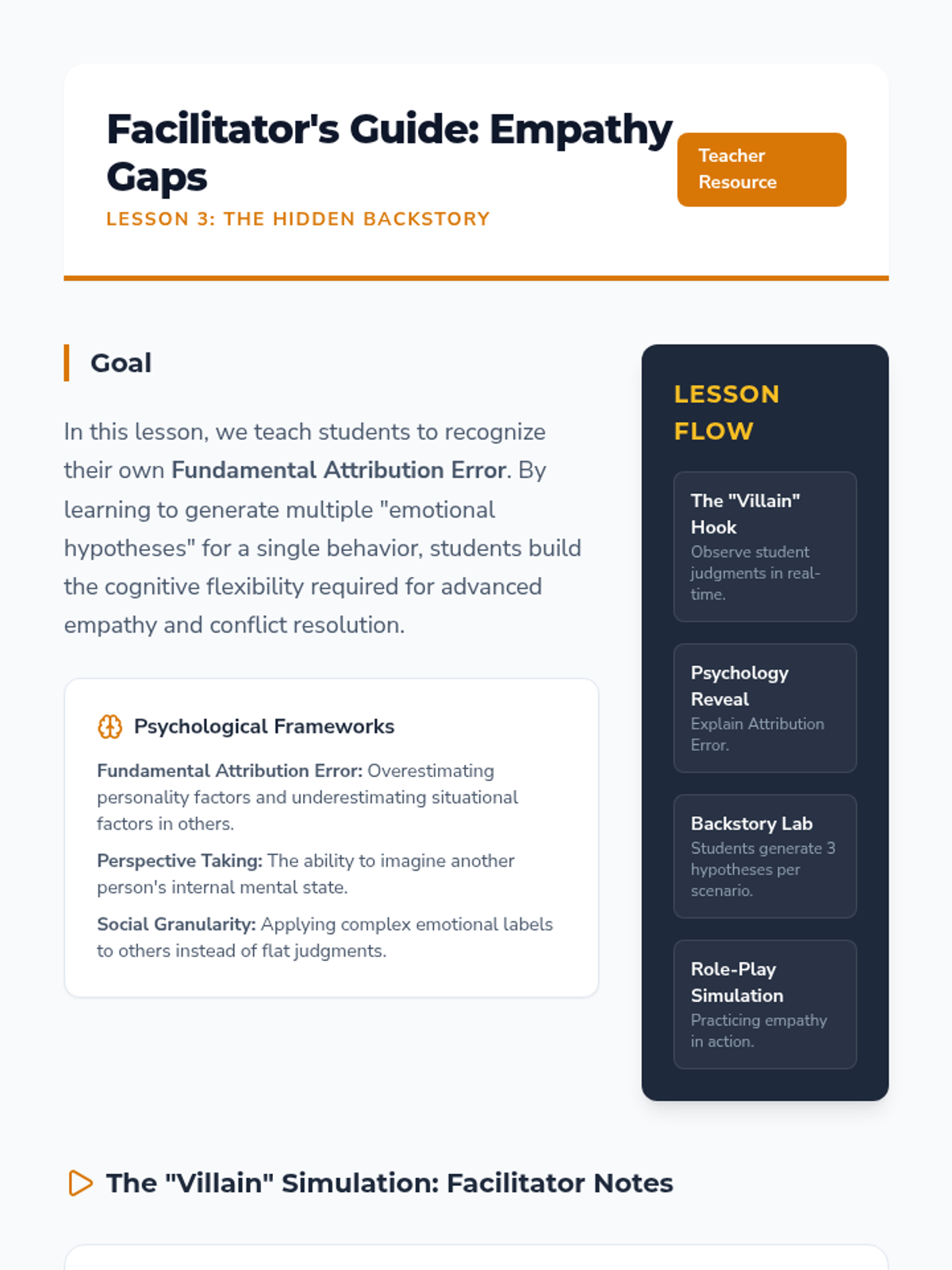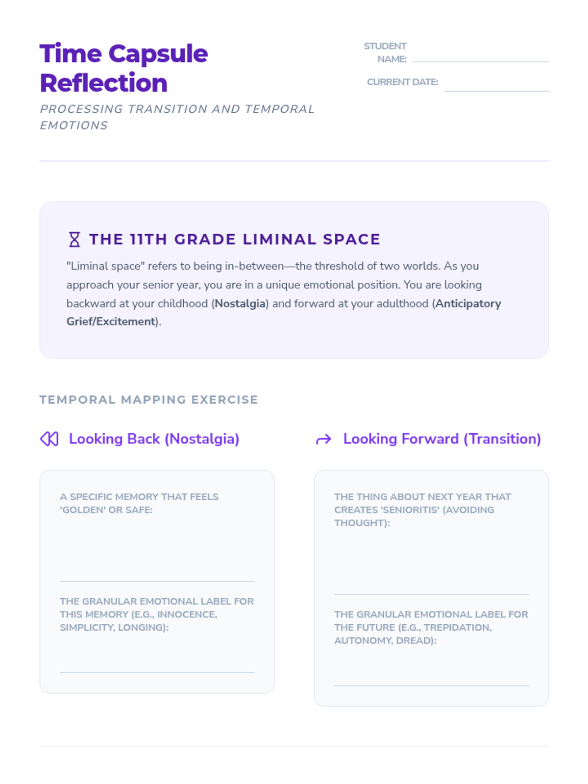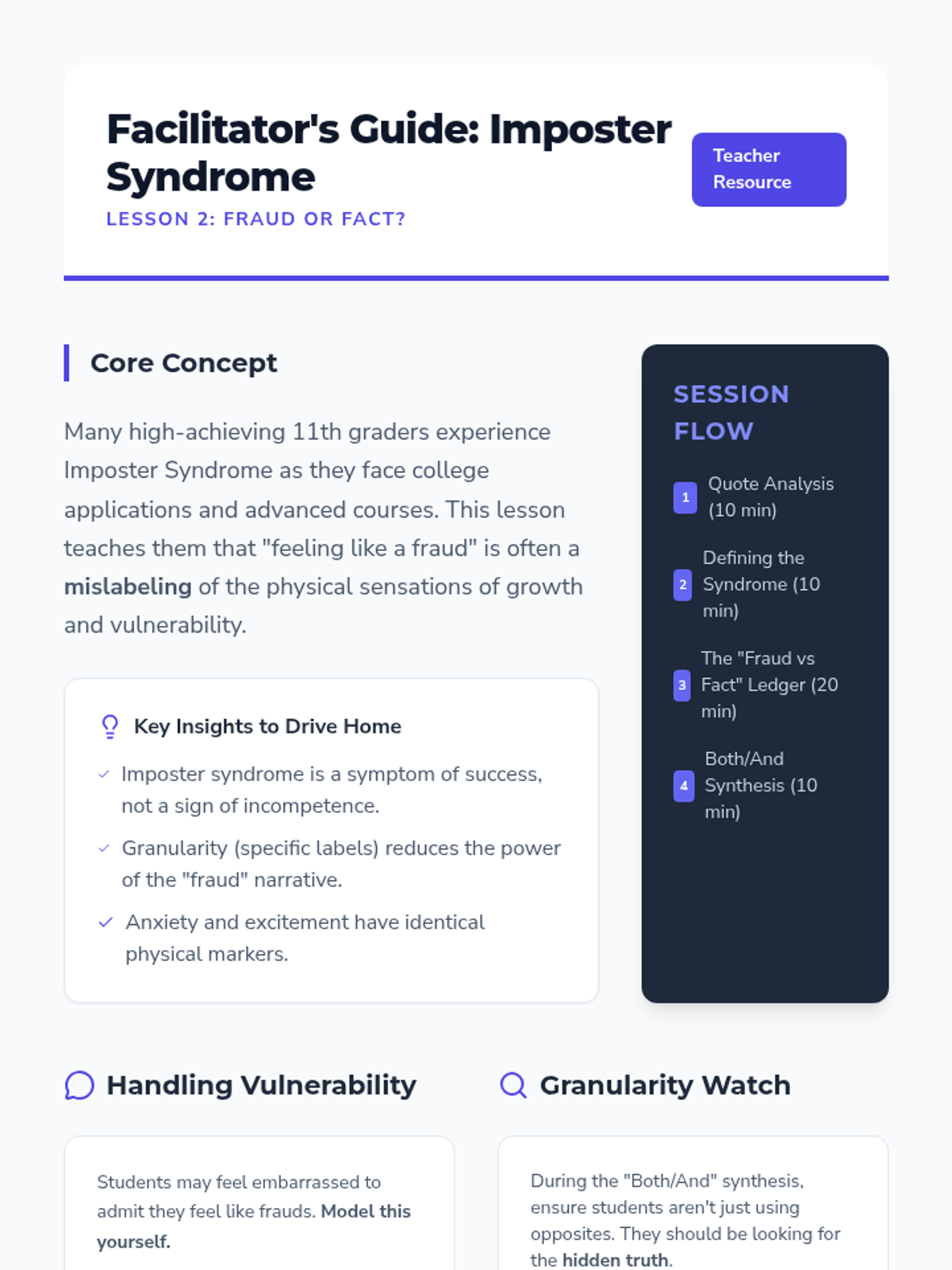 A comprehensive unit for 11th-grade students focusing on complex emotion labeling through dialectical thinking, case studies of imposter syndrome, empathy gap analysis, and transition-related emotions. Students develop sophisticated perspective-taking and conflict-resolution skills by moving beyond surface-level labels to identify mixed emotional states.