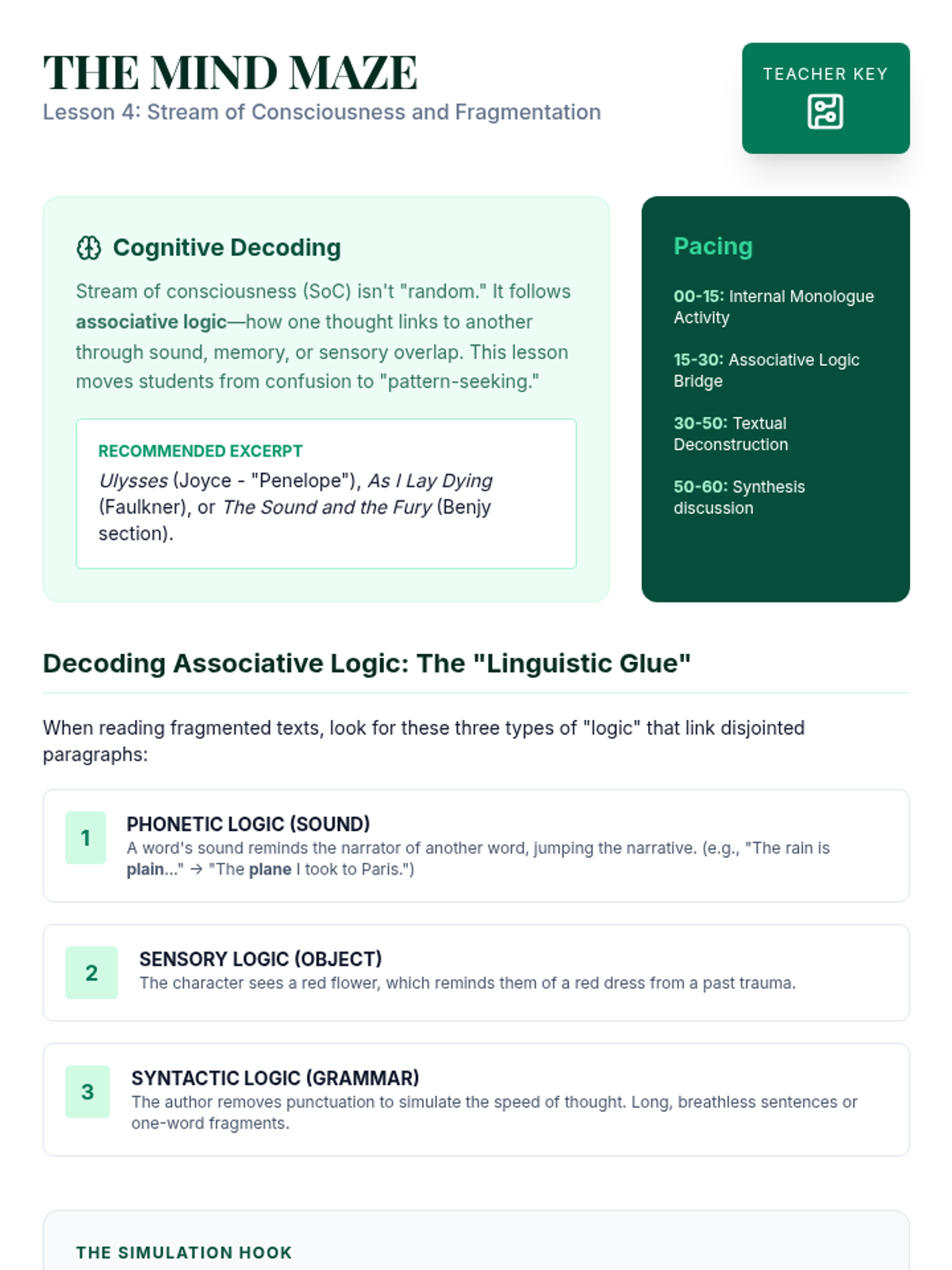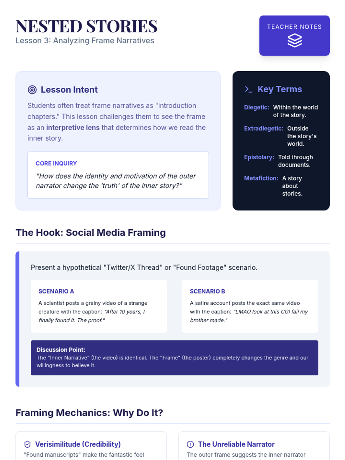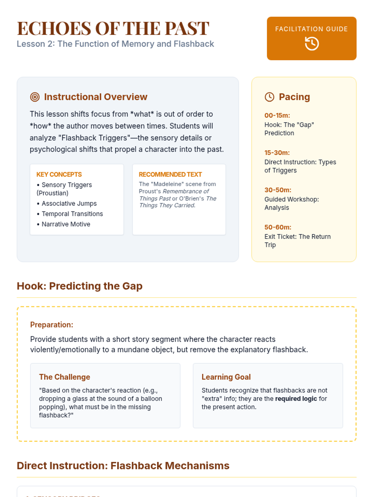 This advanced 12th-grade sequence explores the manipulation of chronological time in literature. Students will analyze non-linear plots, flashbacks, frame narratives, and stream-of-consciousness techniques to understand how structural form reinforces thematic depth.
