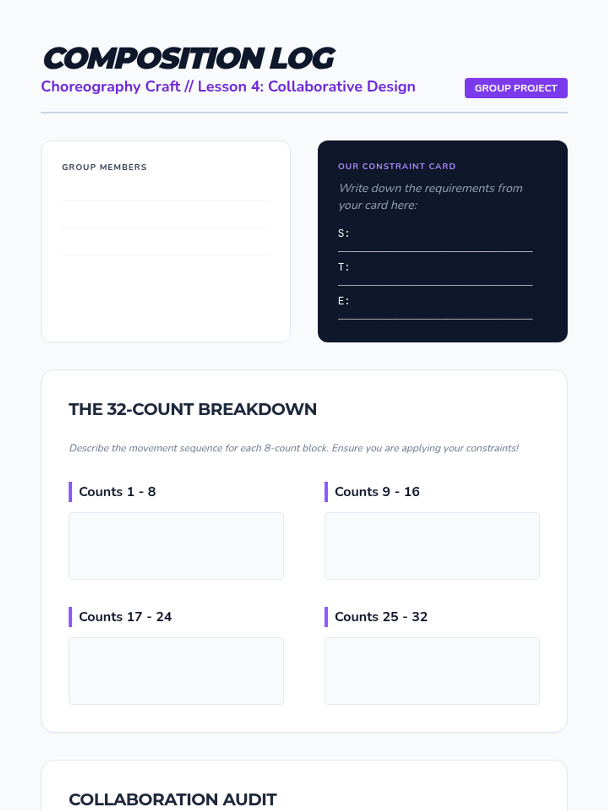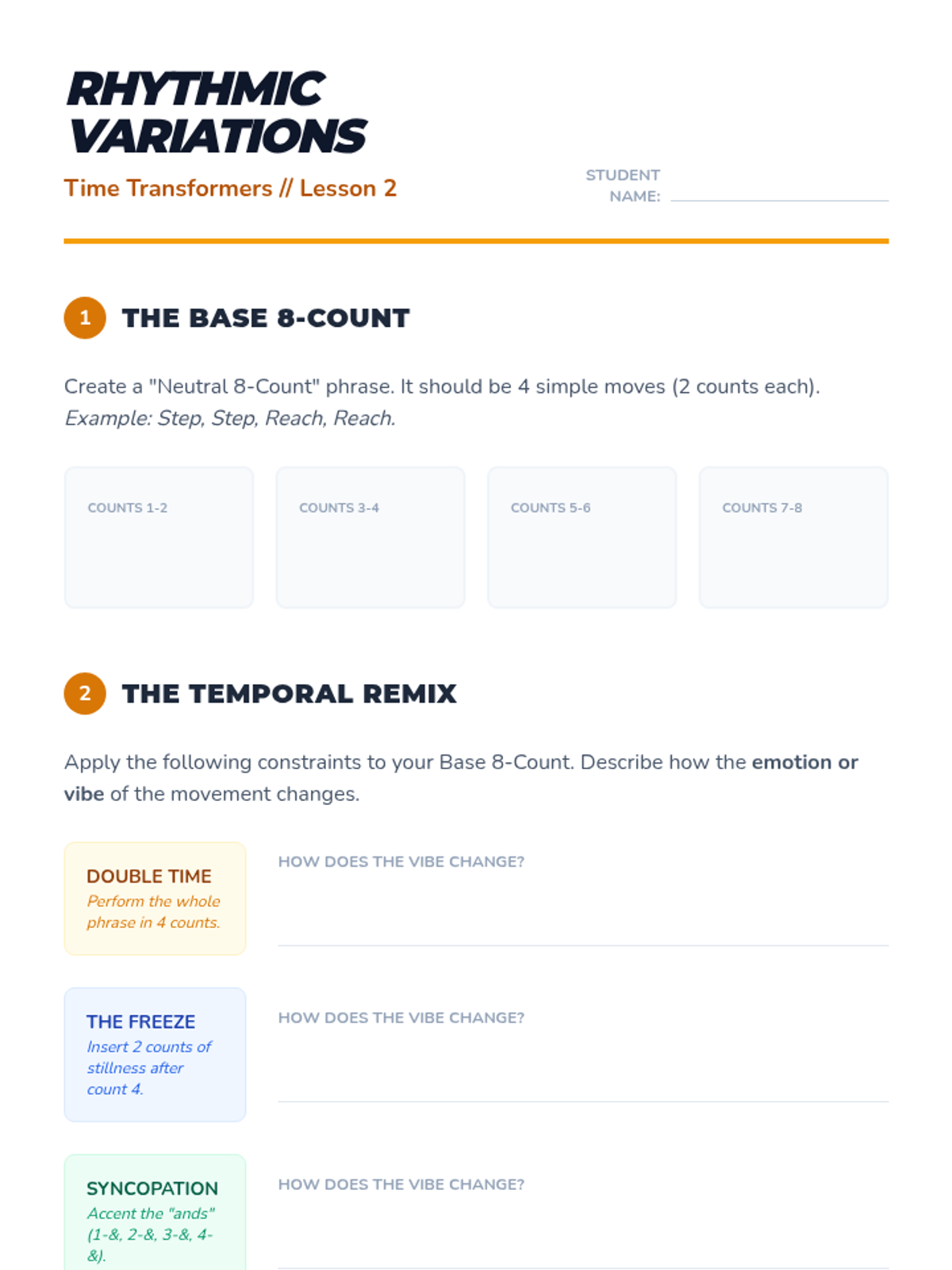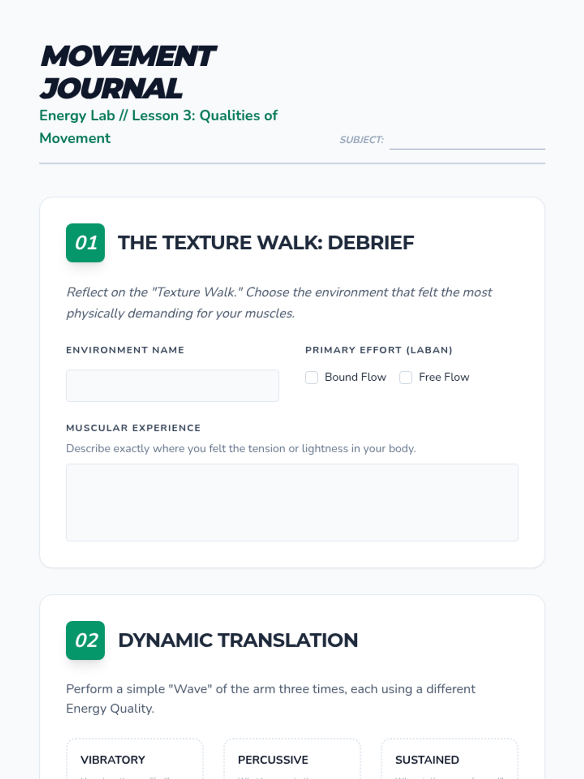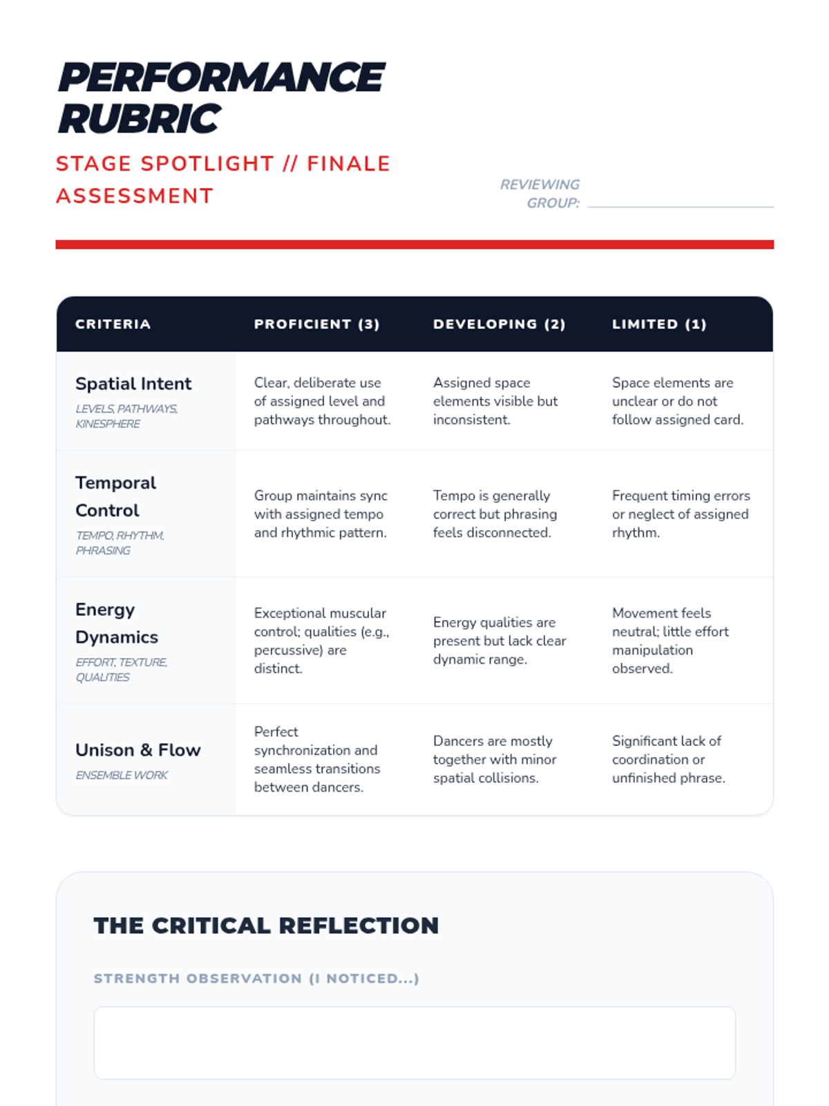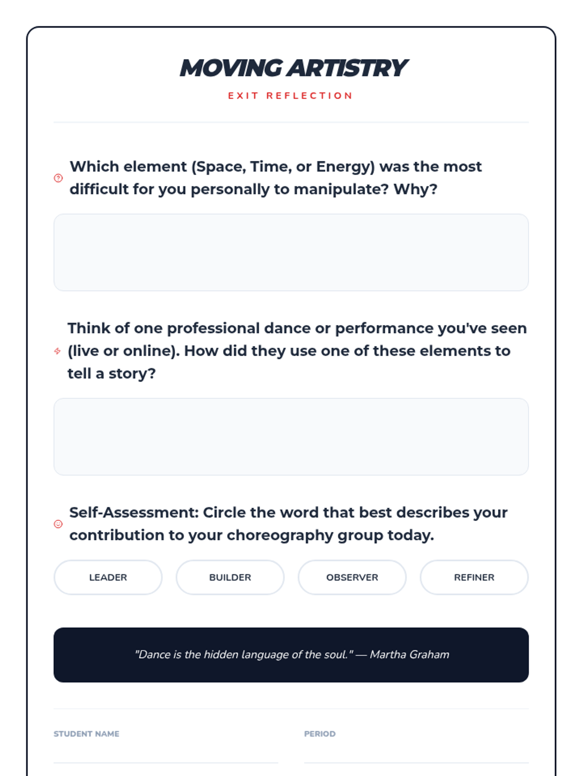 A comprehensive 12th-grade dance sequence that deconstructs the fundamental elements of movement—space, time, and energy—to help students transition from technical execution to artistic choreography. Students engage in movement workshops, experimental labs, and collaborative projects to understand how deliberate manipulation of dynamics creates meaning in performance.