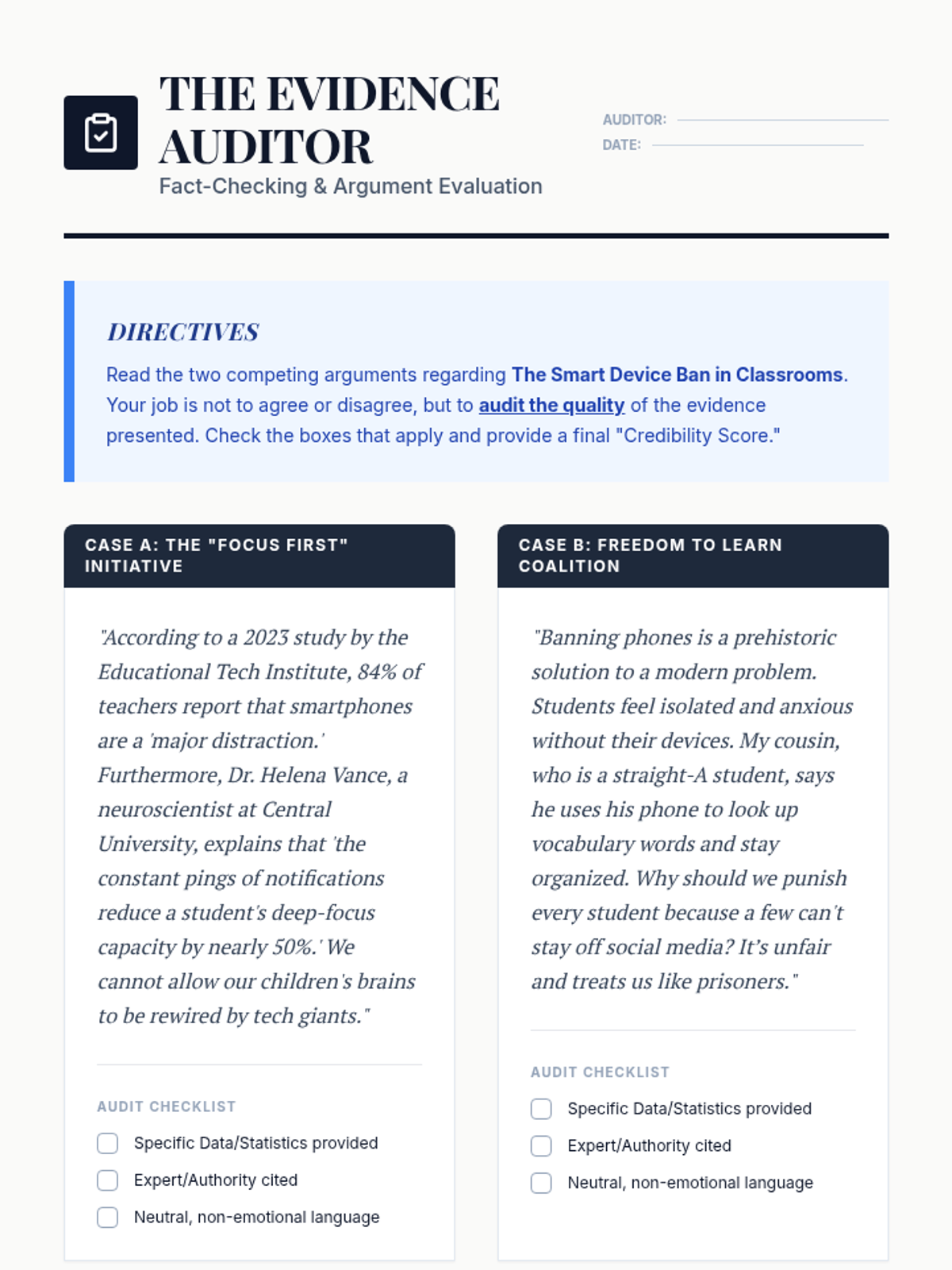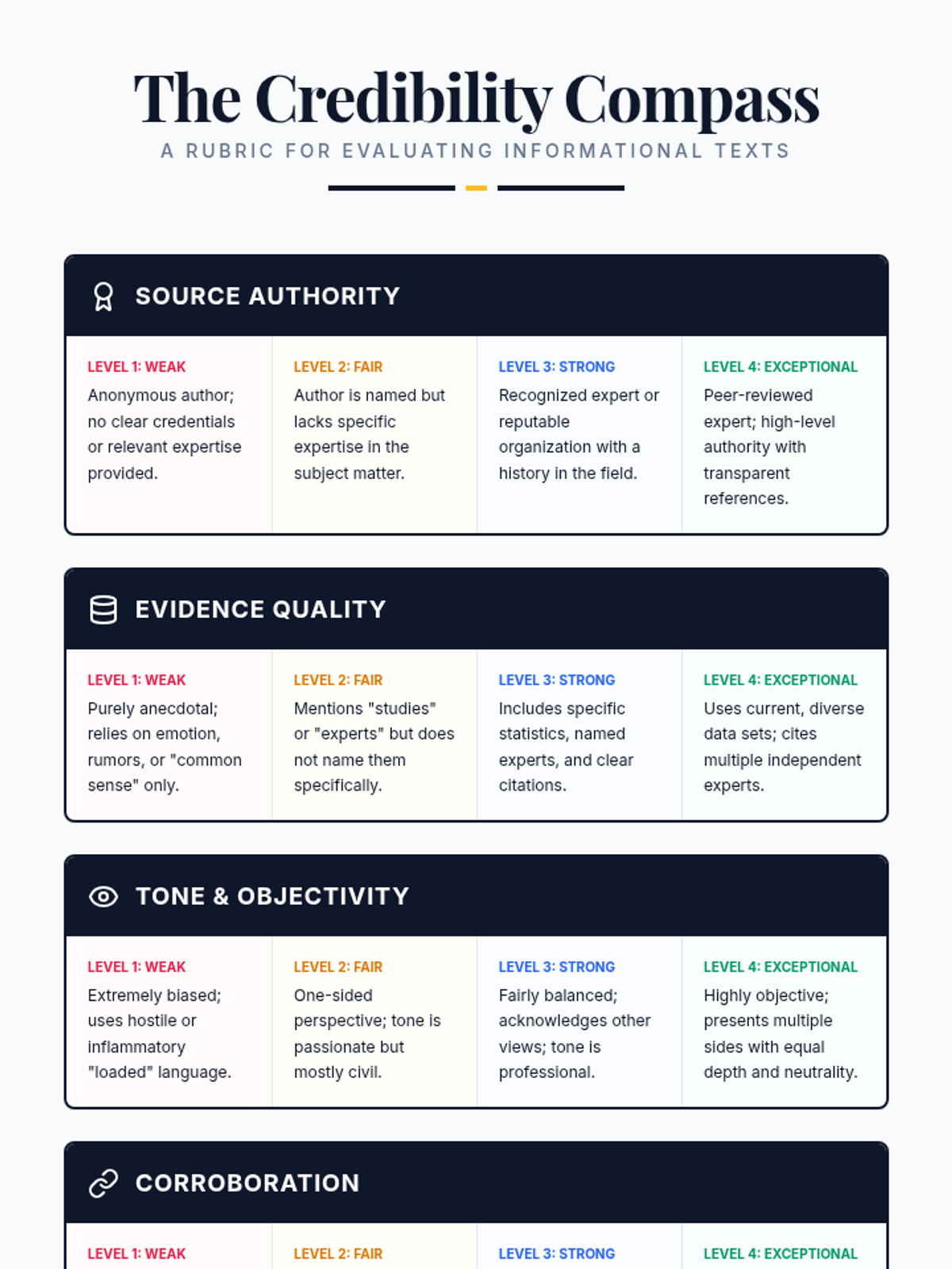 This sequence focuses on the critical thinking skills required to analyze conflicting information and differing perspectives within informational texts. Students progress from identifying bias and tone to evaluating evidence credibility and synthesizing multiple viewpoints into balanced accounts.
