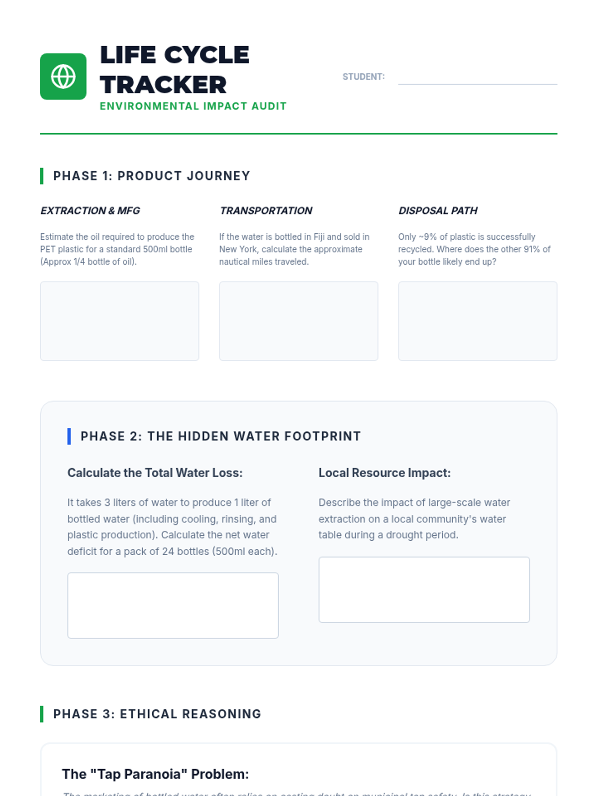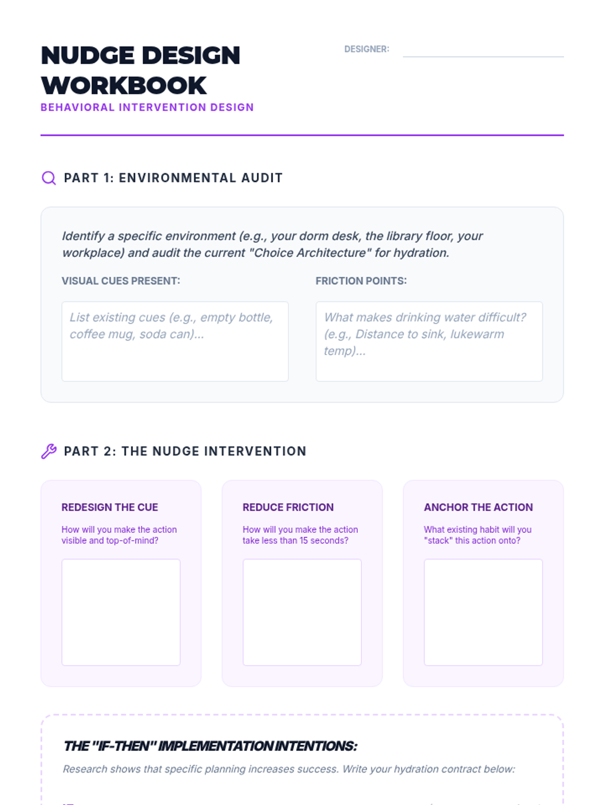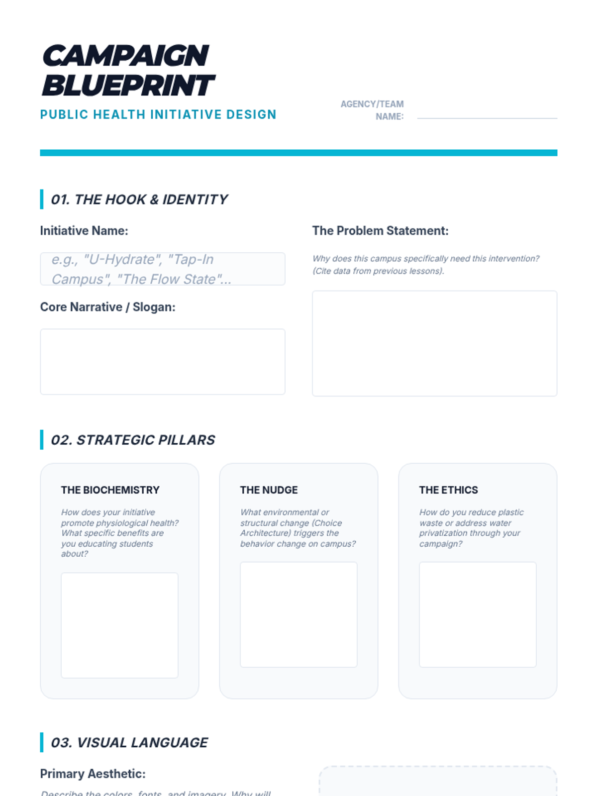 An undergraduate-level exploration of hydration through the lenses of consumer science, biochemistry, ethics, and behavioral psychology. Students critique marketing claims, analyze product ingredients, and design public health interventions for their campus community.