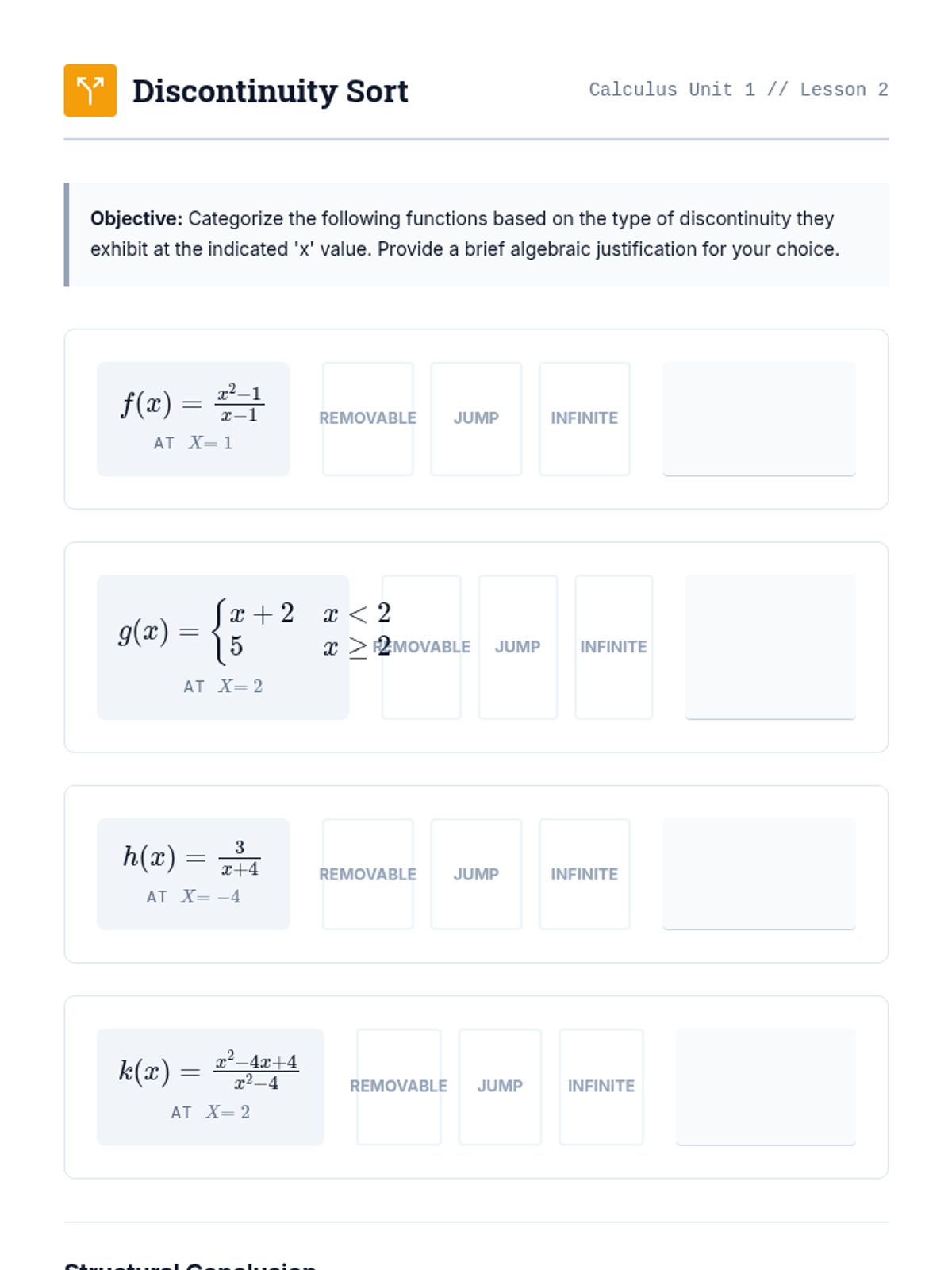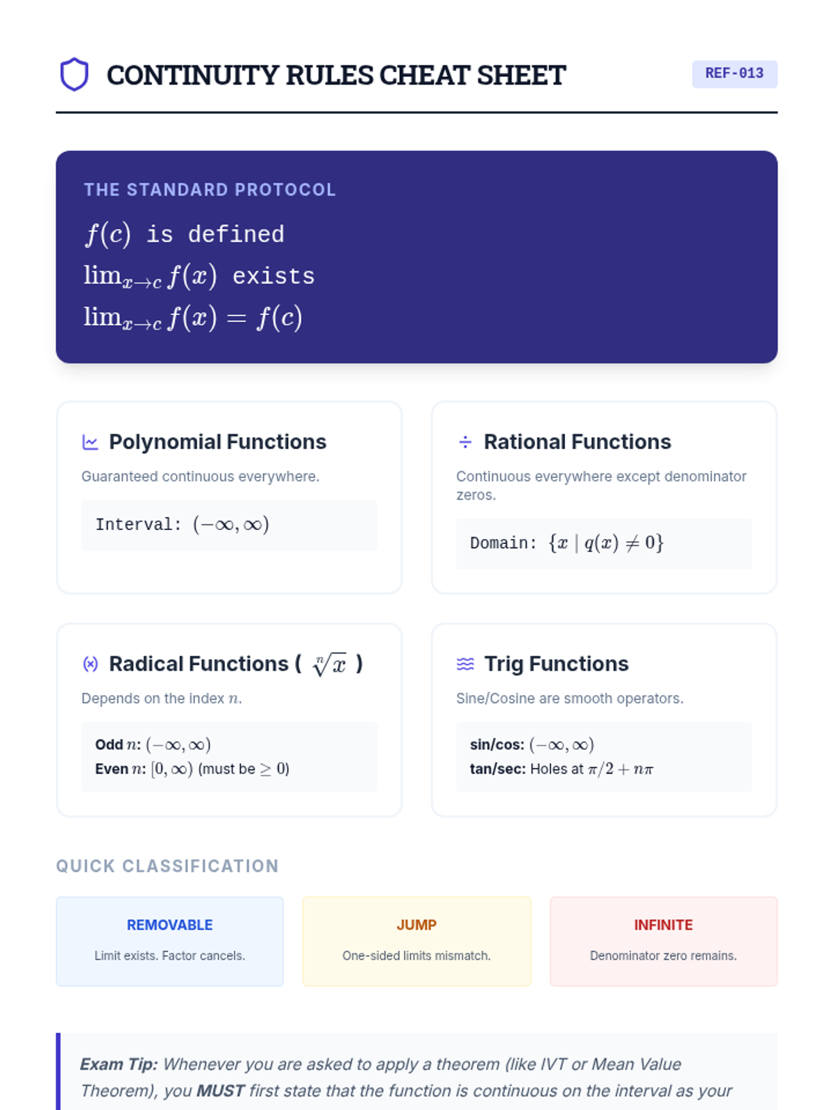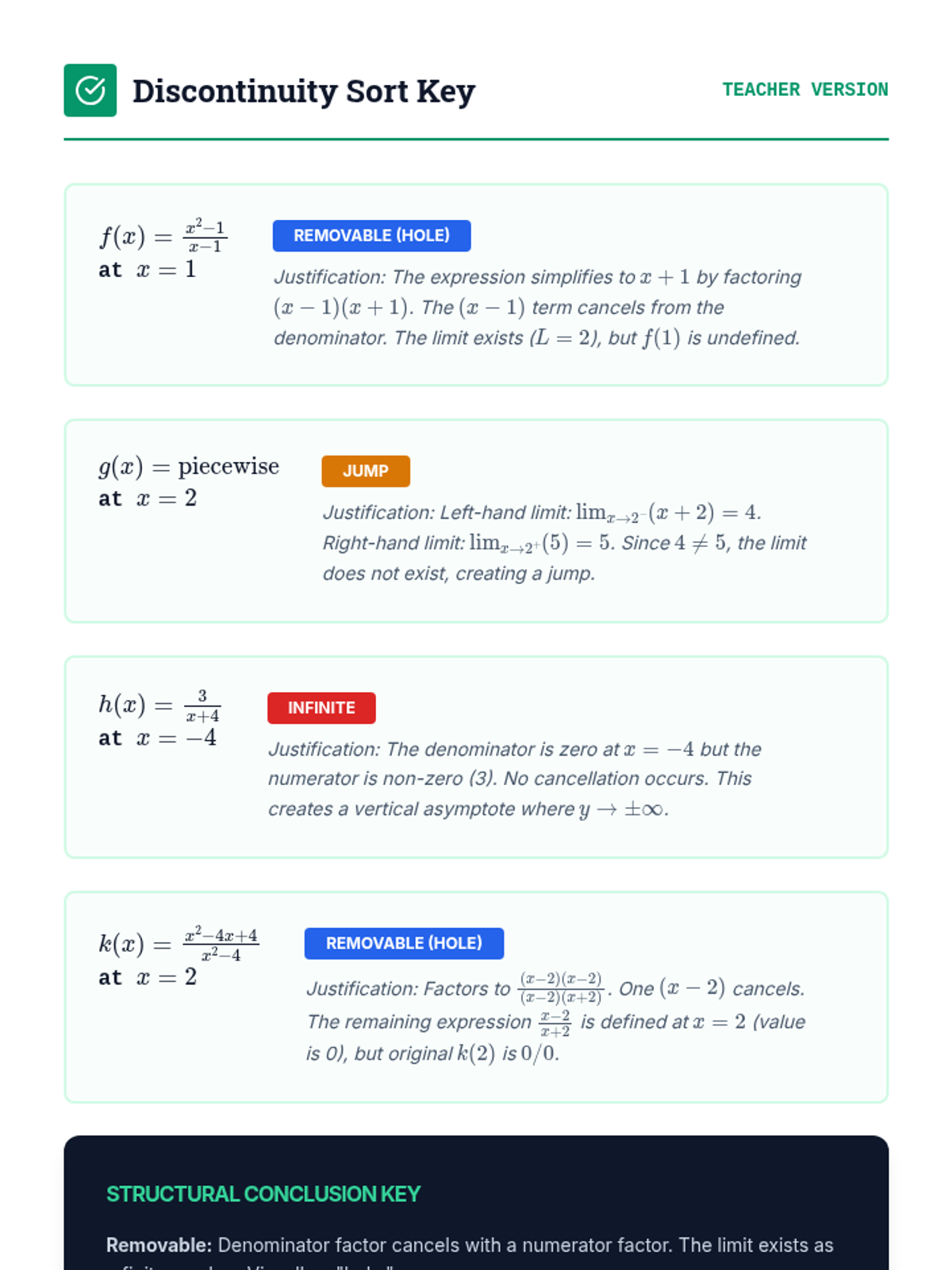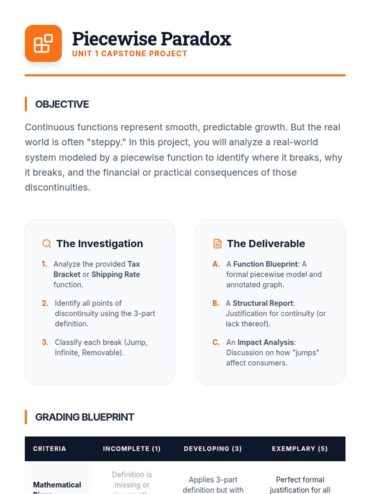 This sequence guides 12th-grade Calculus students through the formal definition of continuity, the classification of discontinuities, and the application of the Intermediate Value Theorem. It emphasizes mathematical rigor alongside real-world applications of function 'breaks' and existence theorems.