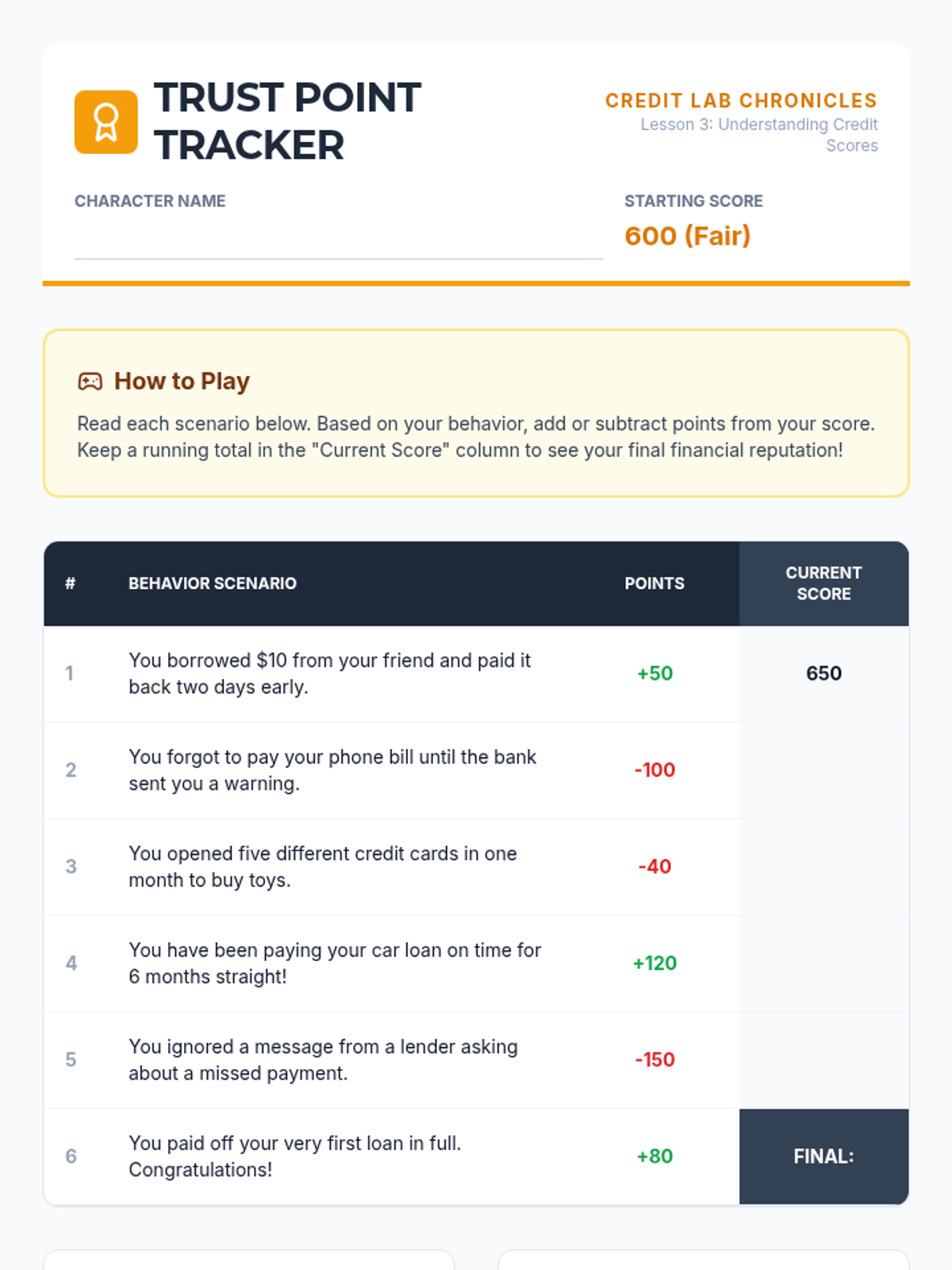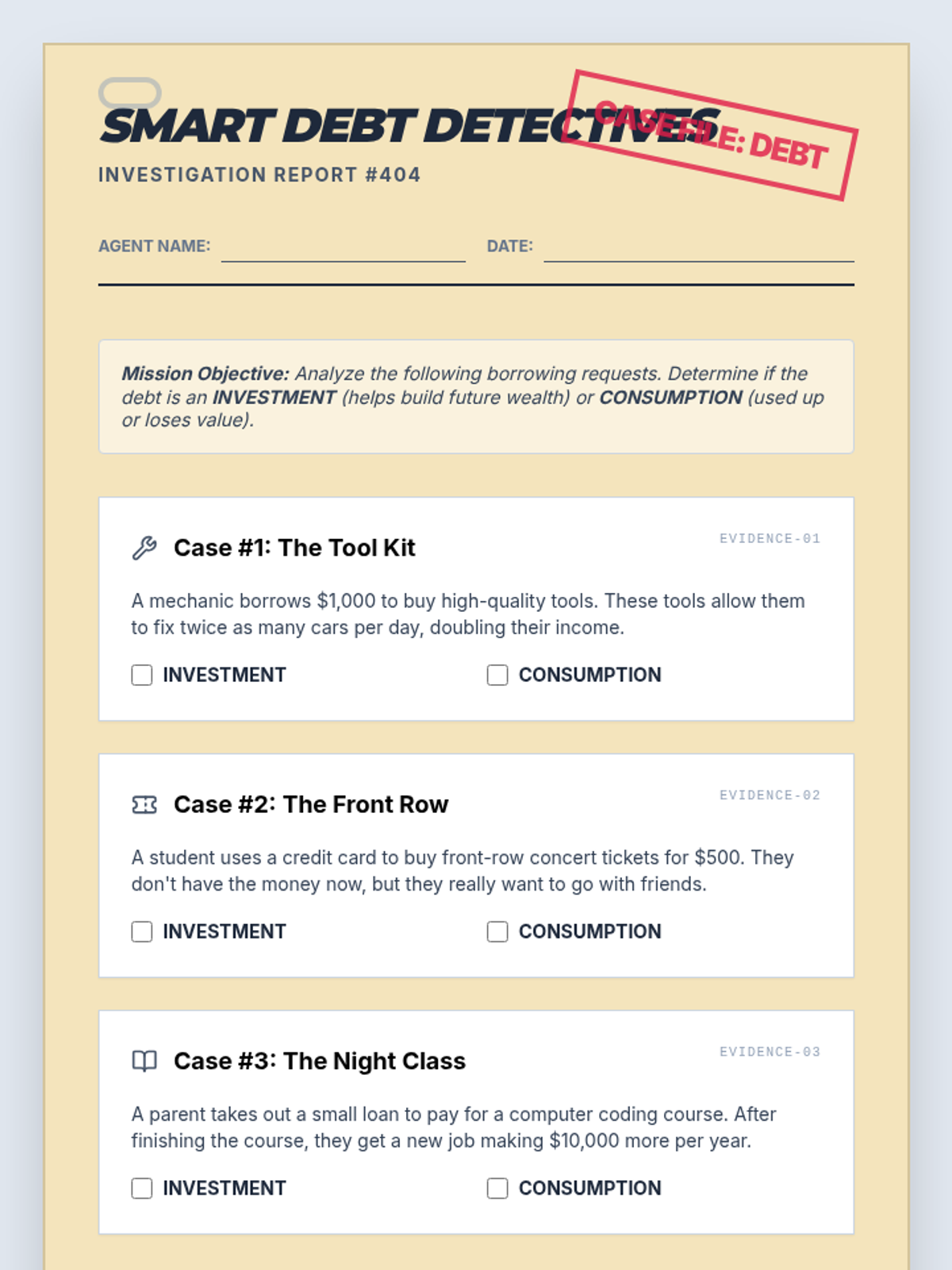 A comprehensive 4th-grade sequence exploring the concepts of borrowing, interest, and creditworthiness. Students learn the costs of debt, the importance of financial reputation, and how to differentiate between smart and risky borrowing through simulations and case studies.
